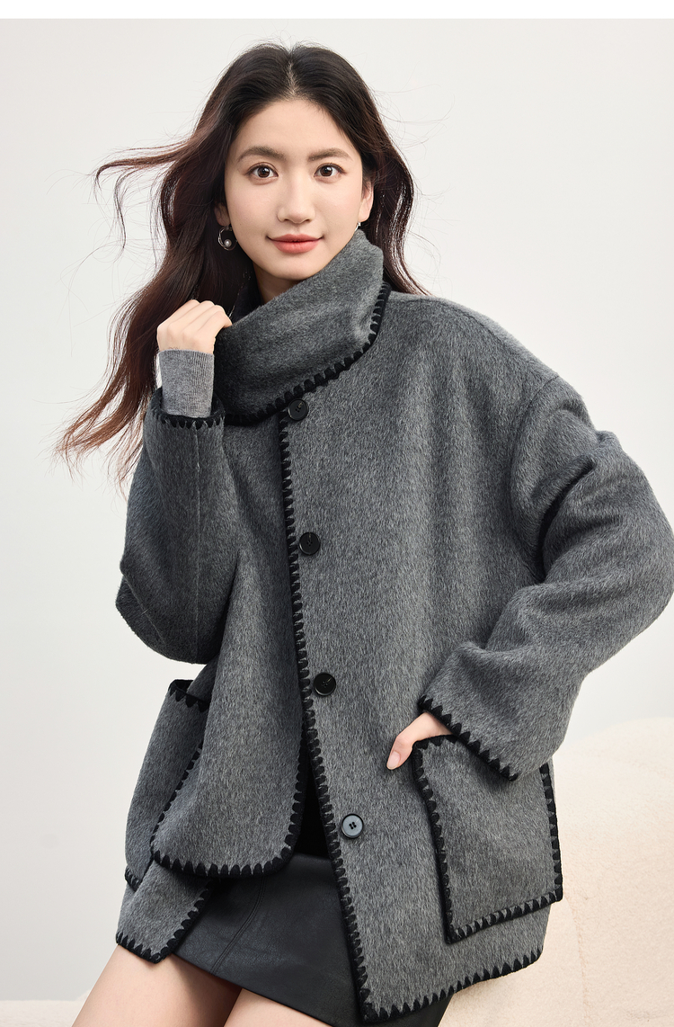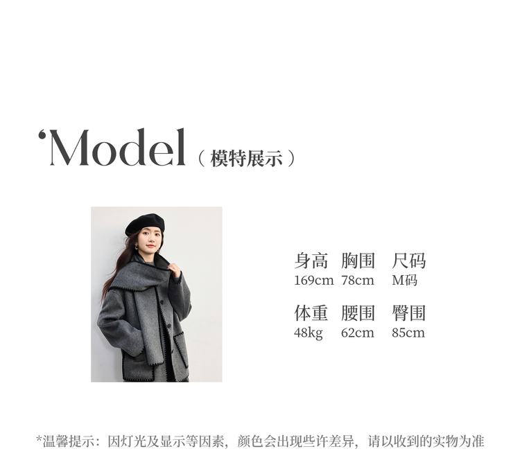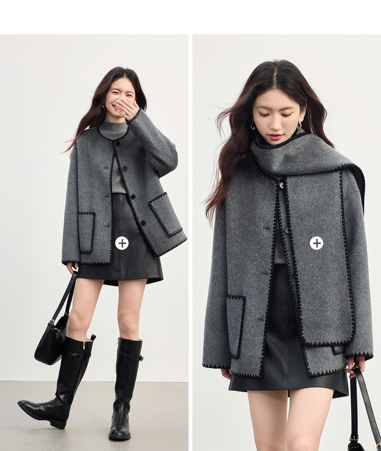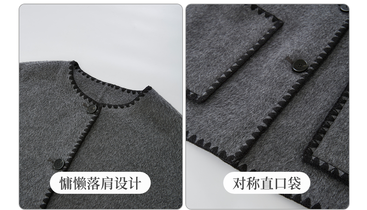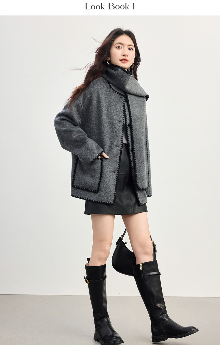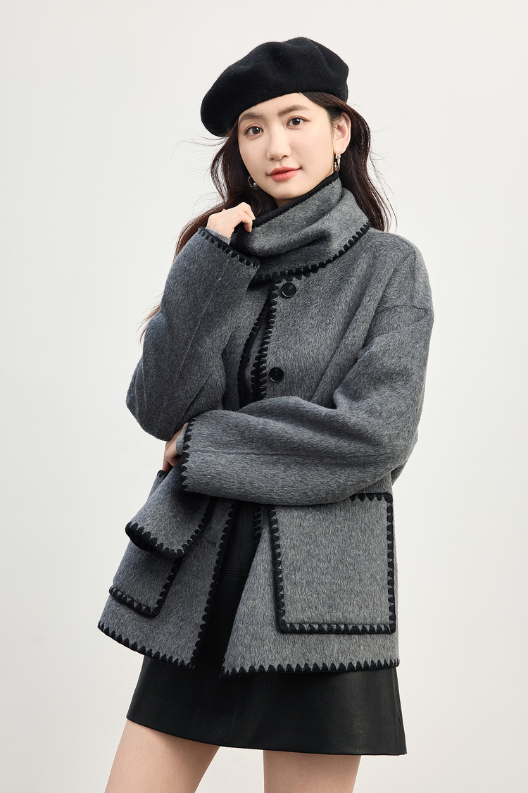 【年终特卖】熙世界静奢羊驼毛/桑蚕丝/绵羊毛大衣女双面呢可脱卸围巾毛呢外套