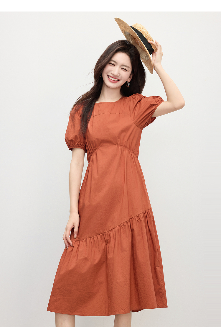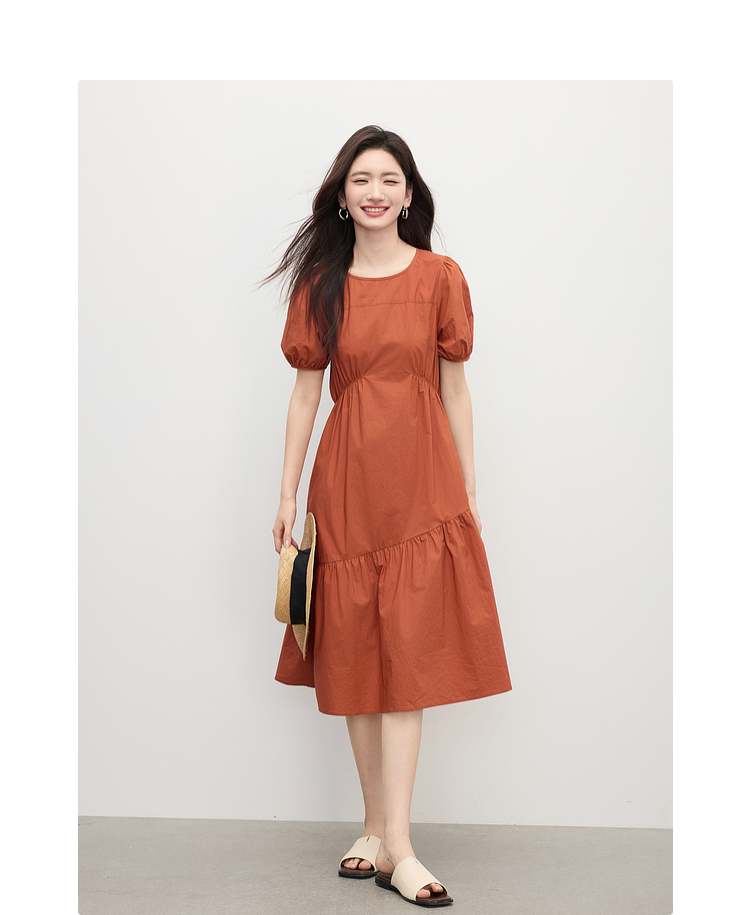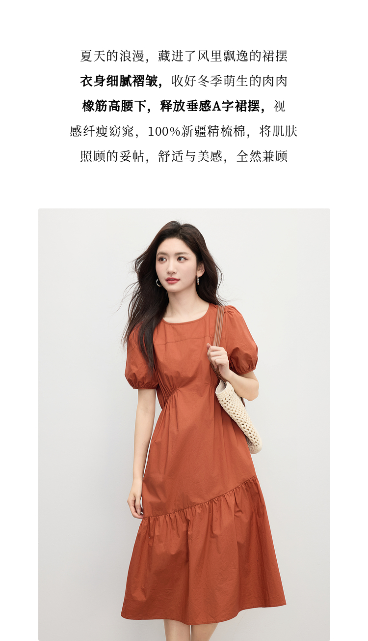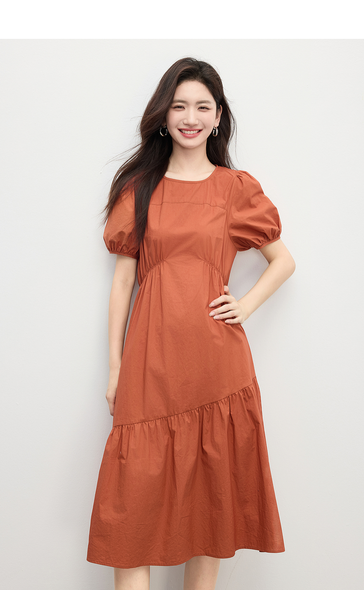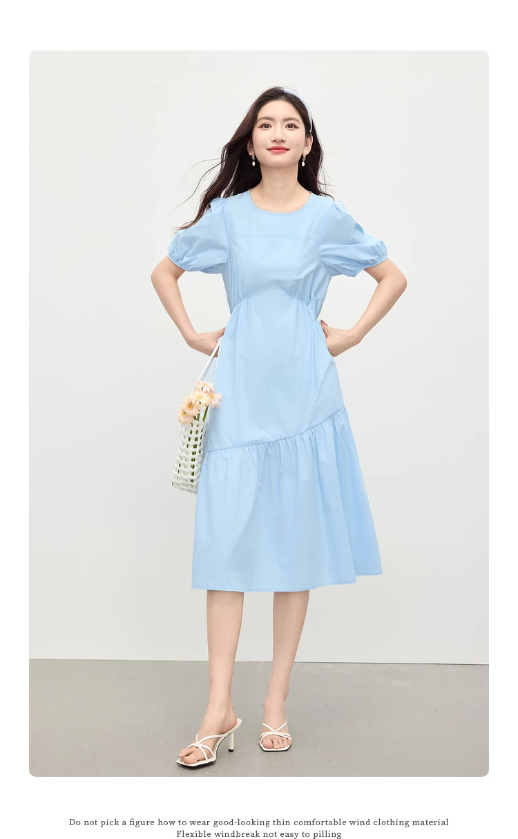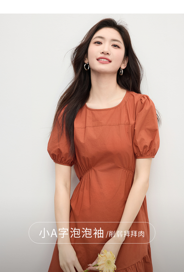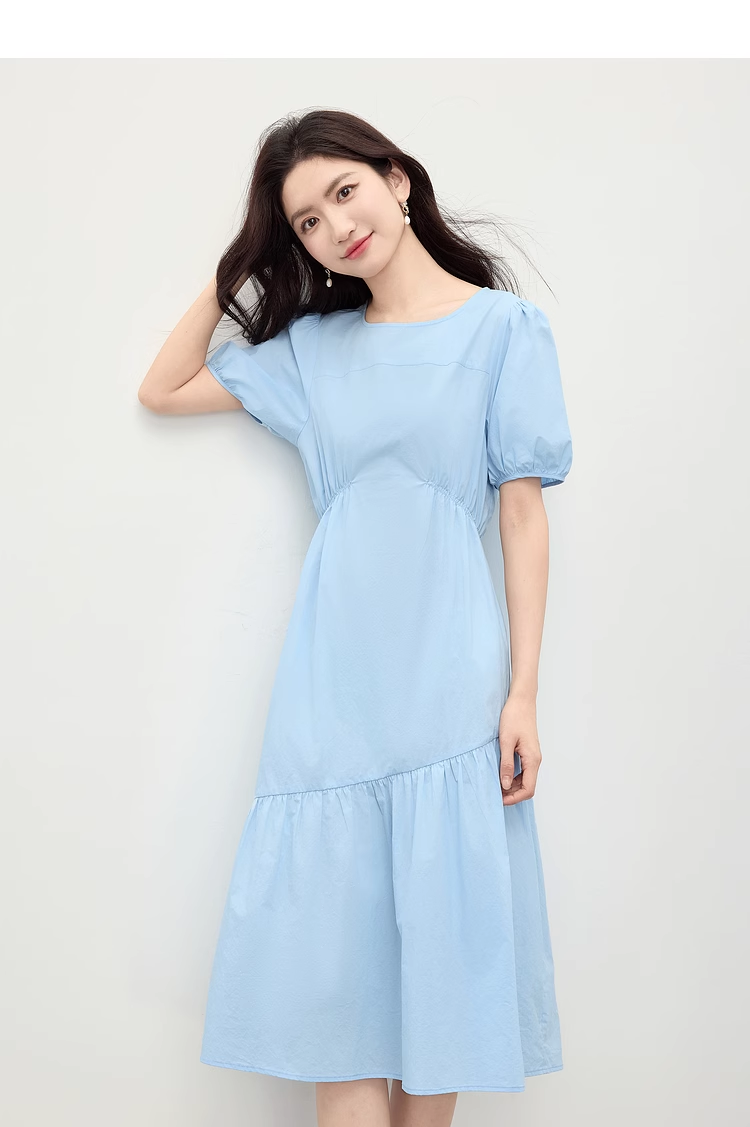 【周四狂欢价】熙世界法式褶皱泡泡袖连衣裙女2025夏天新款收腰显瘦圆领茶歇裙子