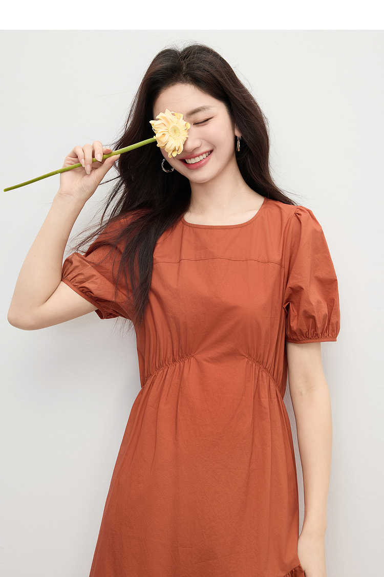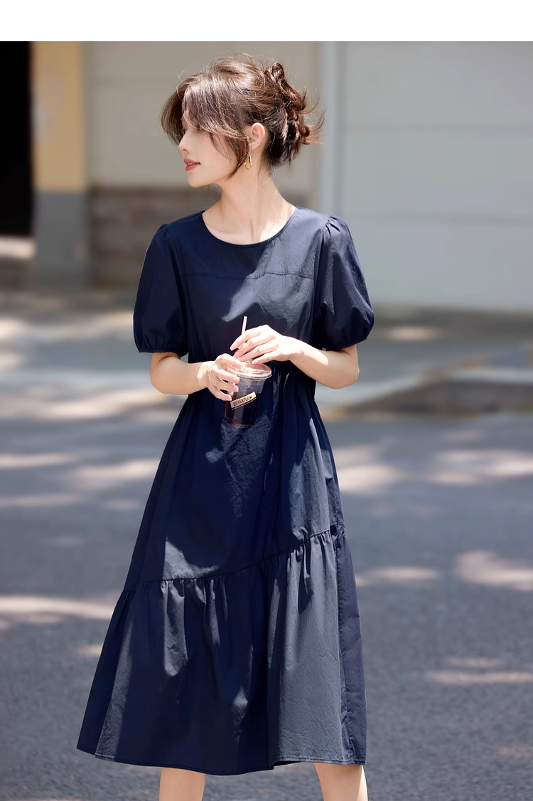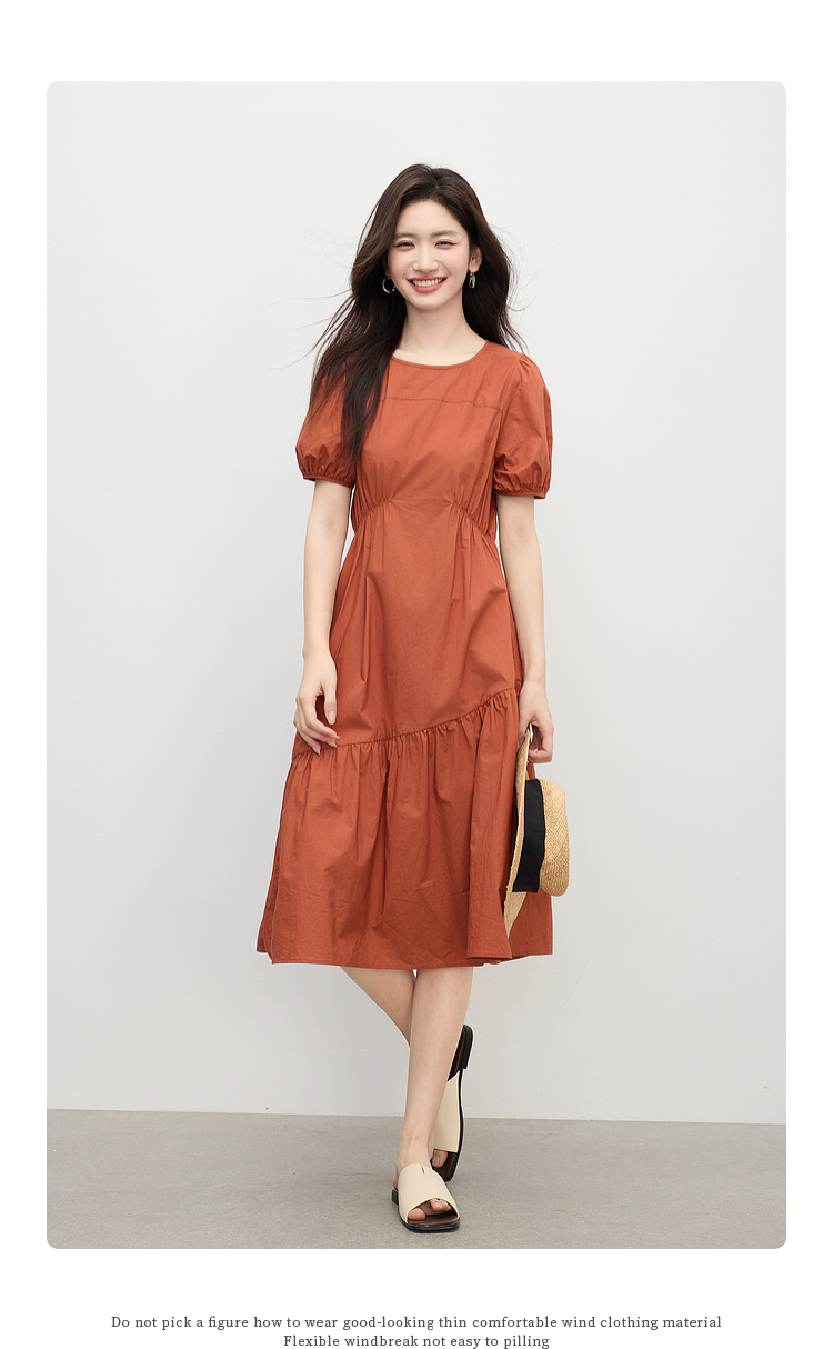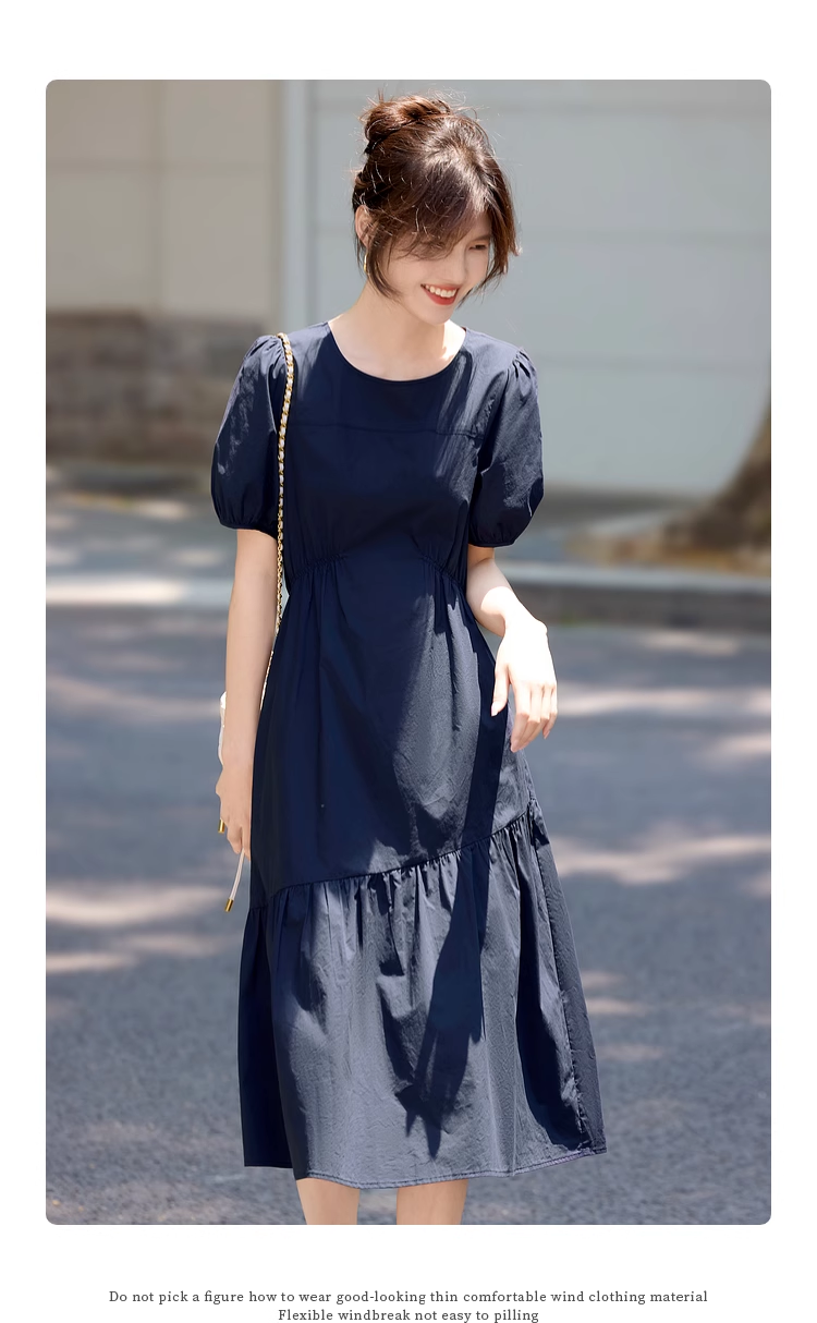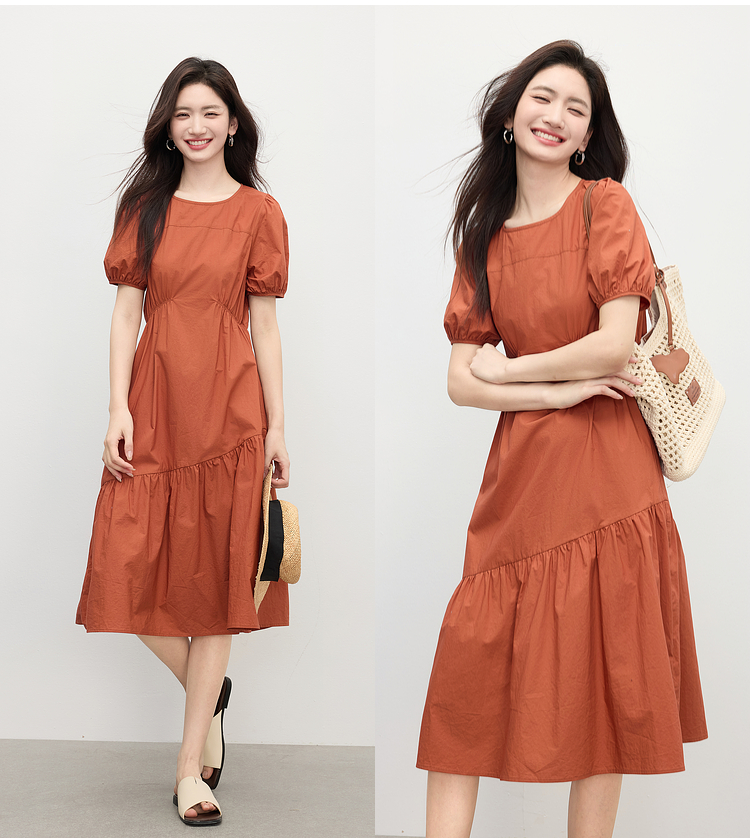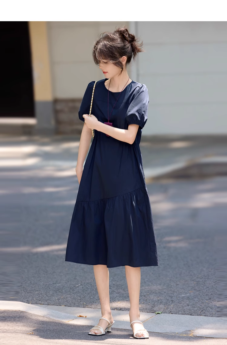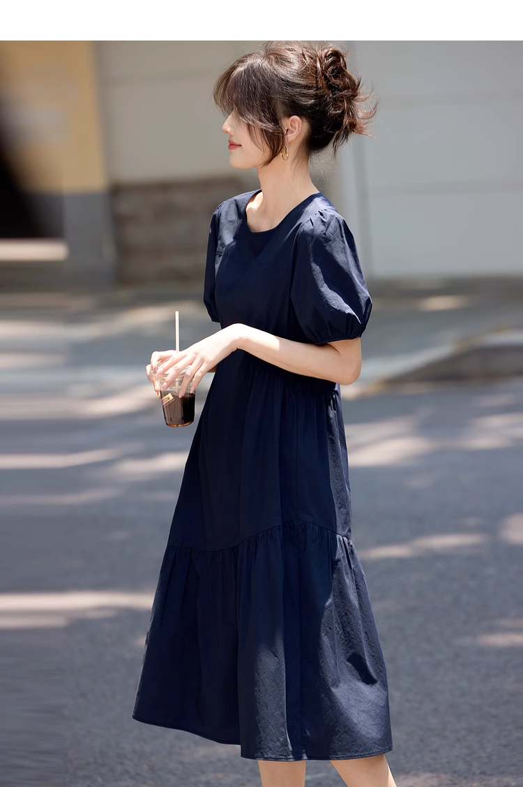 【周四狂欢价】熙世界法式褶皱泡泡袖连衣裙女2025夏天新款收腰显瘦圆领茶歇裙子