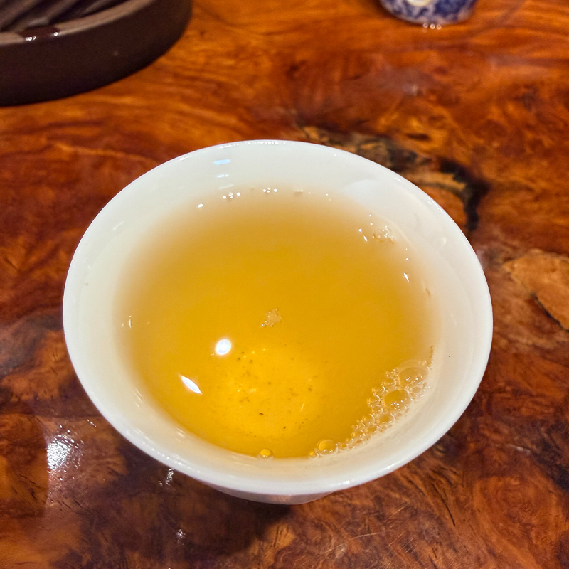 茶汤质地软稠,有如油脂般的压舌感,虽然略带涩,但化的很快,滋味甘醇顺滑,在整个喝茶的过程中,野果的香气扑面而来,稍等片刻,回甘在口腔中弥漫开来,带来清凉的感觉,茶汤柔中带刚,口感丰富,充满韵味。经过五六泡后,茶汤中蜜香渗透到茶汤的深处,回味无穷尽。