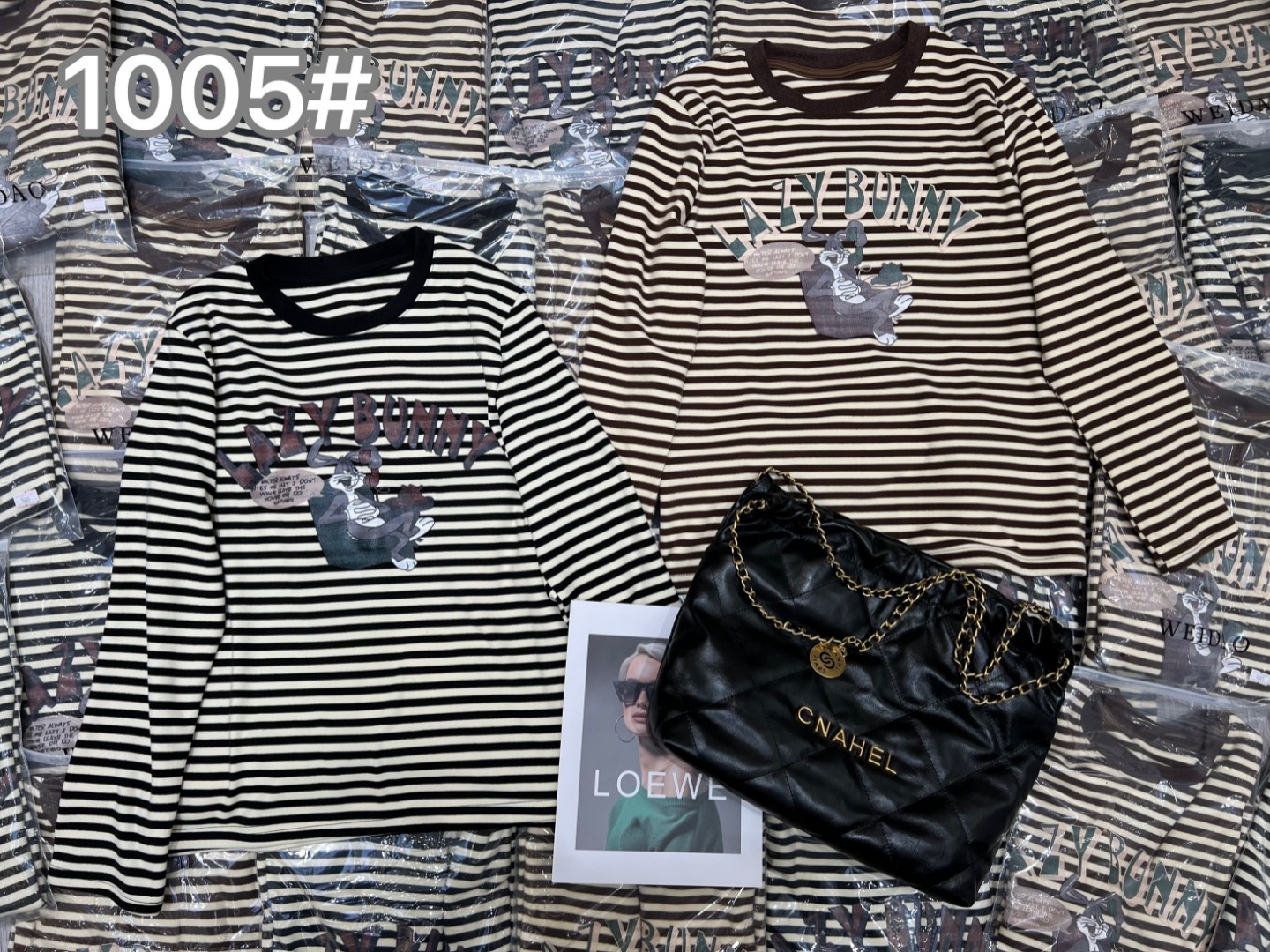 T1005 # 黑白条 均码 秋冬条纹卡通字母印花 百搭宽松磨毛长袖T恤 冬天不想穿的很臃肿 想随性休闲 又有些时髦不费力 这种长袖T恤就很适合当内搭穿 保暖又贴身
