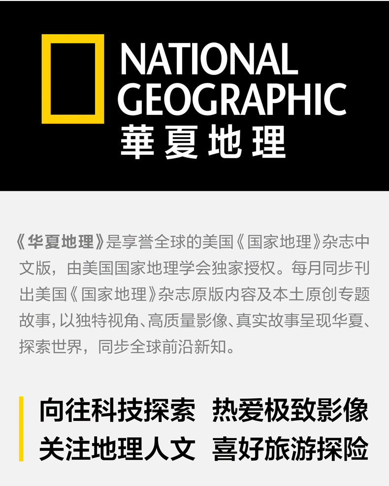 美国《国家地理》中文版(《华夏地理》杂志)由美国国家地理学会独家授权。每月同步刊出美国《国家地理》杂志原版内容及本土原创专题故事,以独特视角、高质量影像、真实故事呈现华夏、探索世界,同步全球前沿新知。