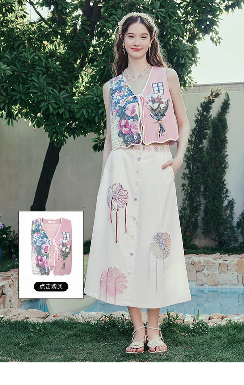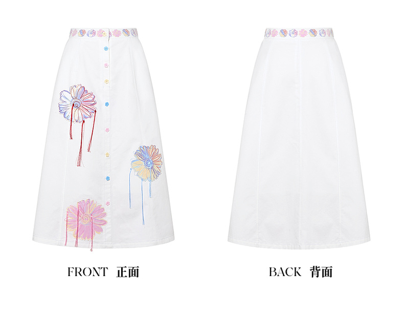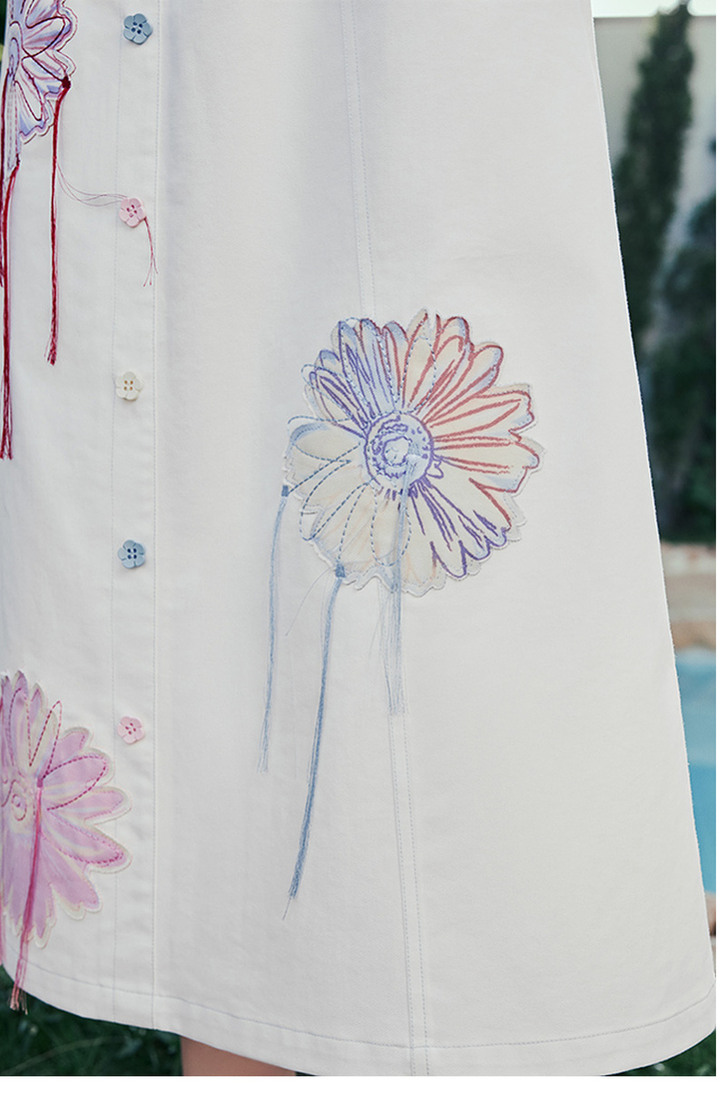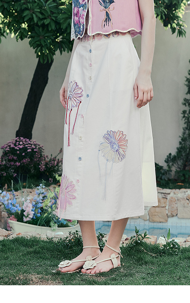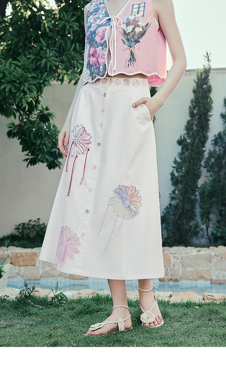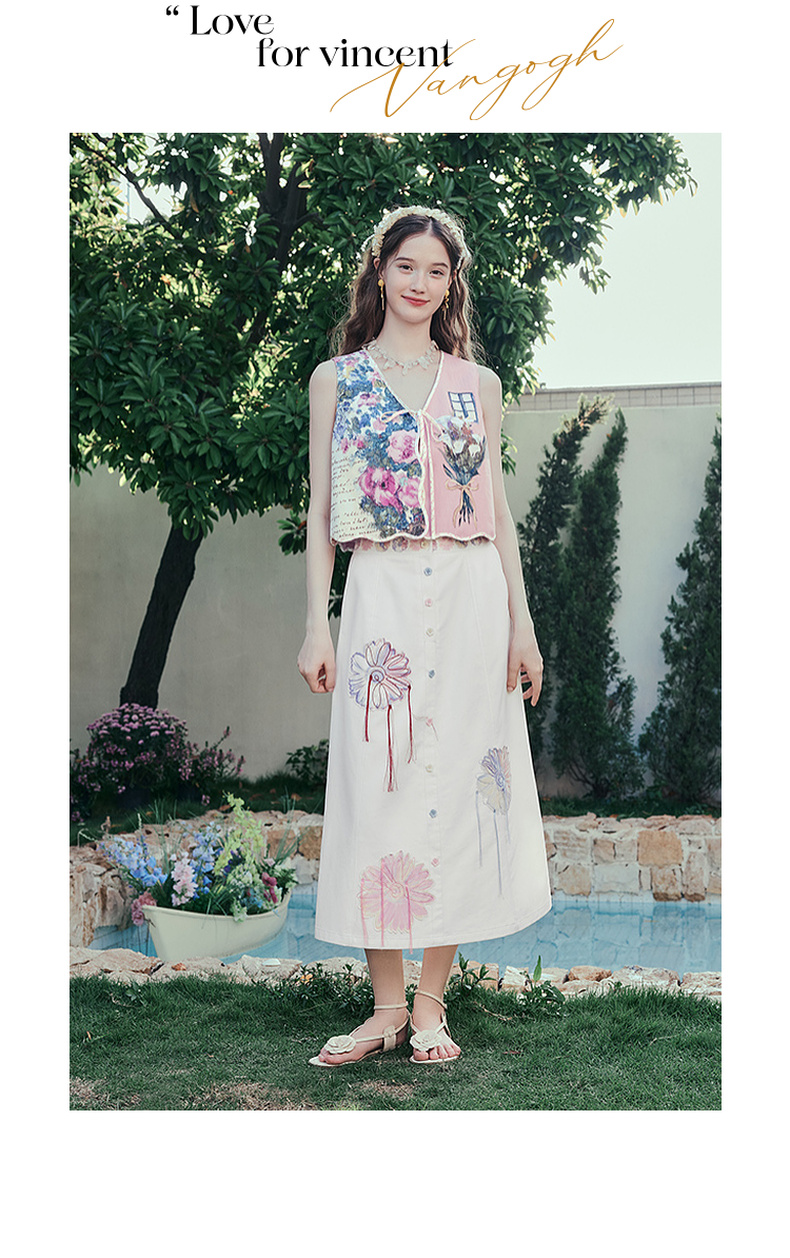 两三事梵高文艺半糖雏菊2025夏季新款流苏绣花彩色纽扣A字半身裙