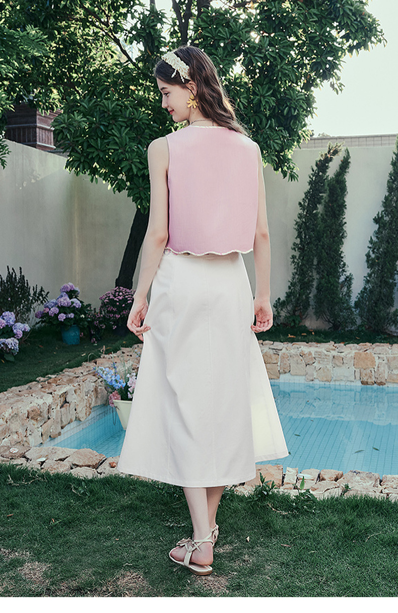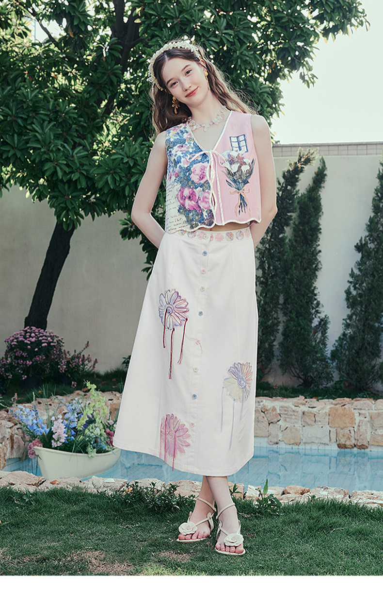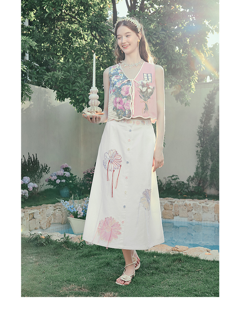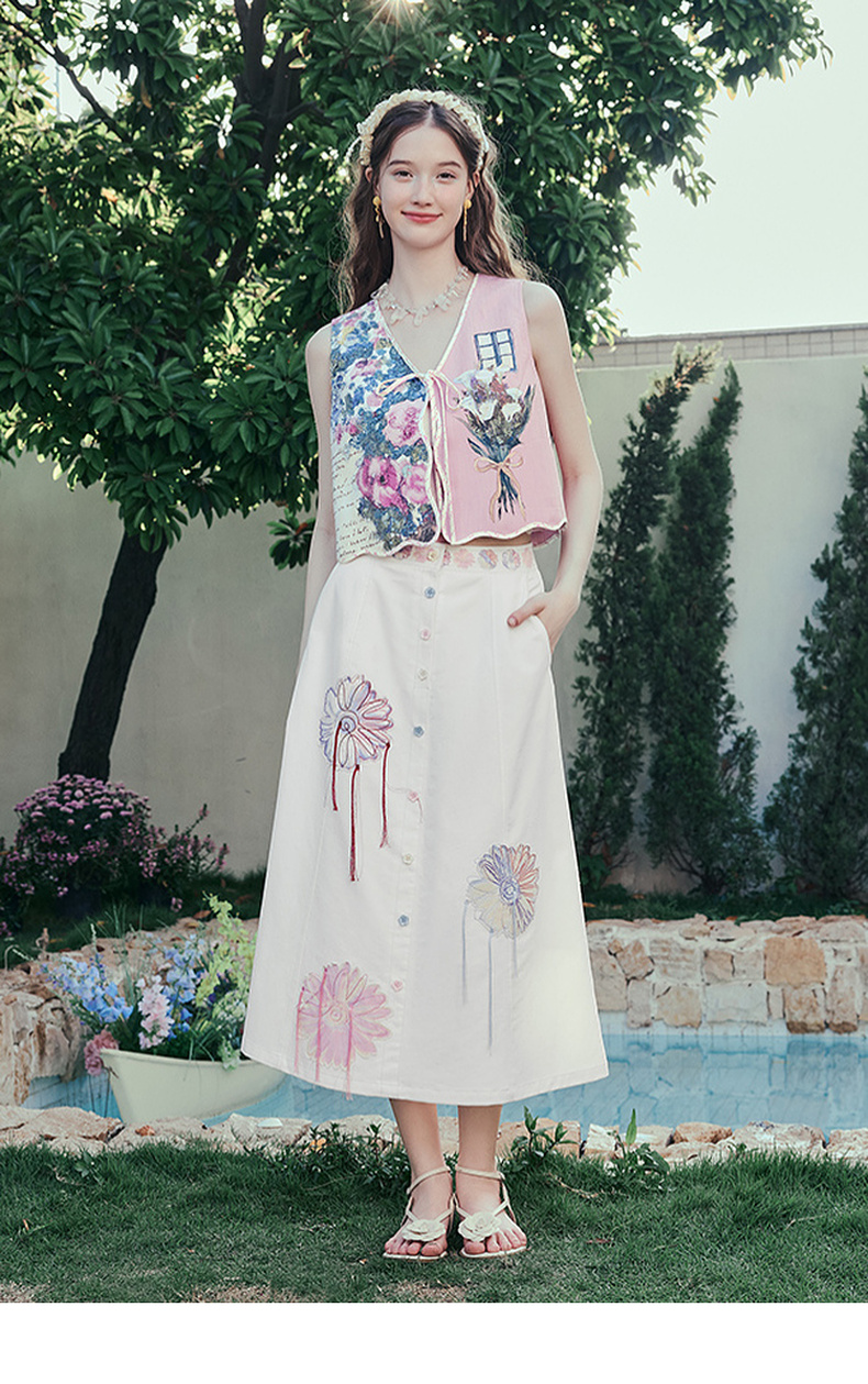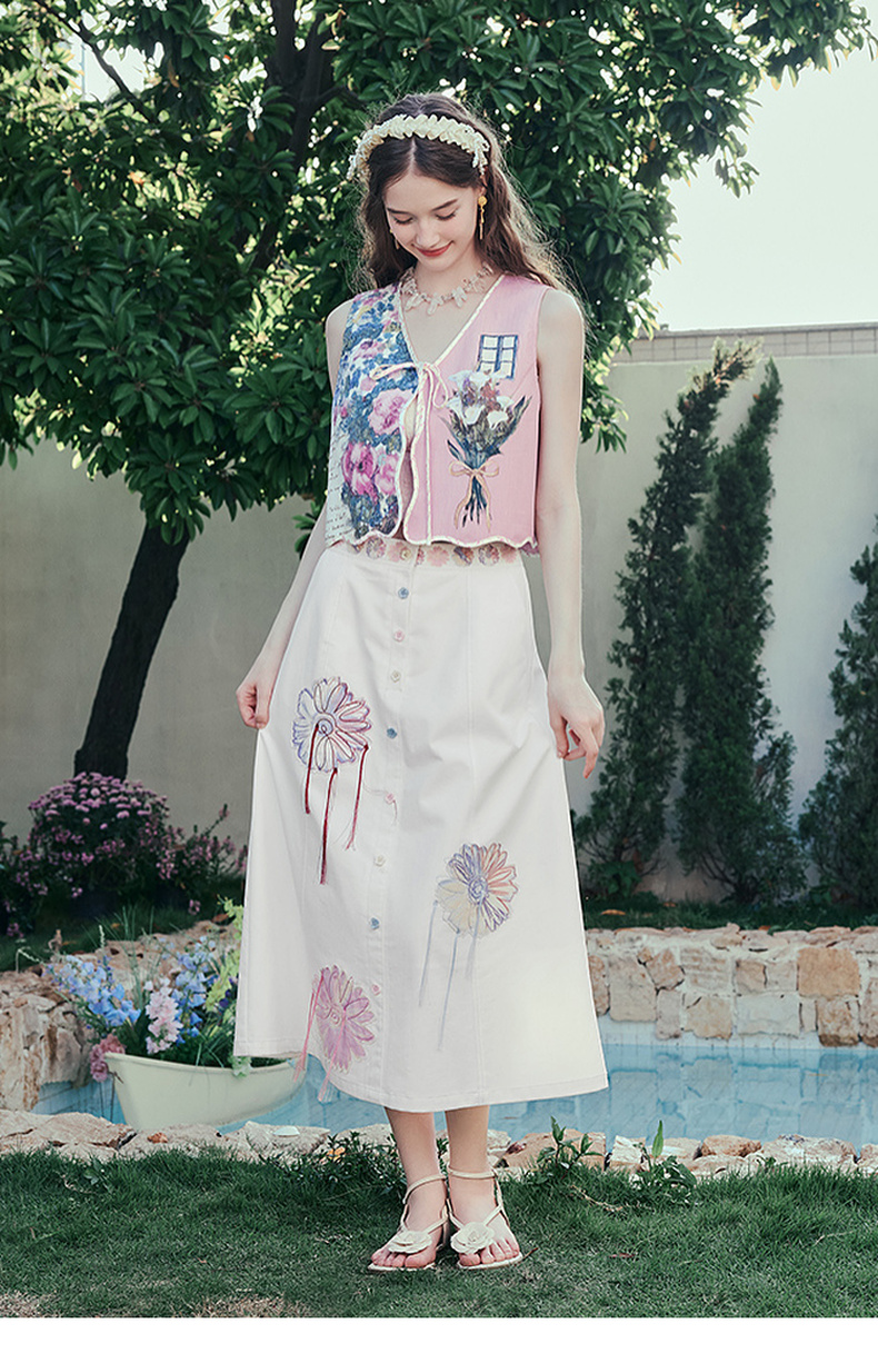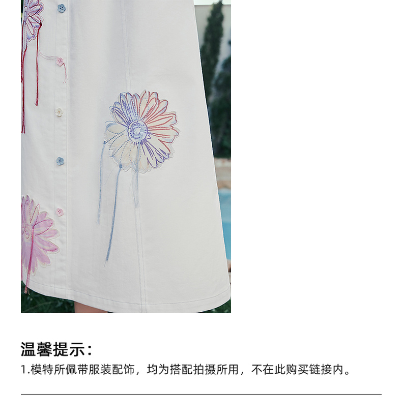 两三事梵高文艺半糖雏菊2025夏季新款流苏绣花彩色纽扣A字半身裙