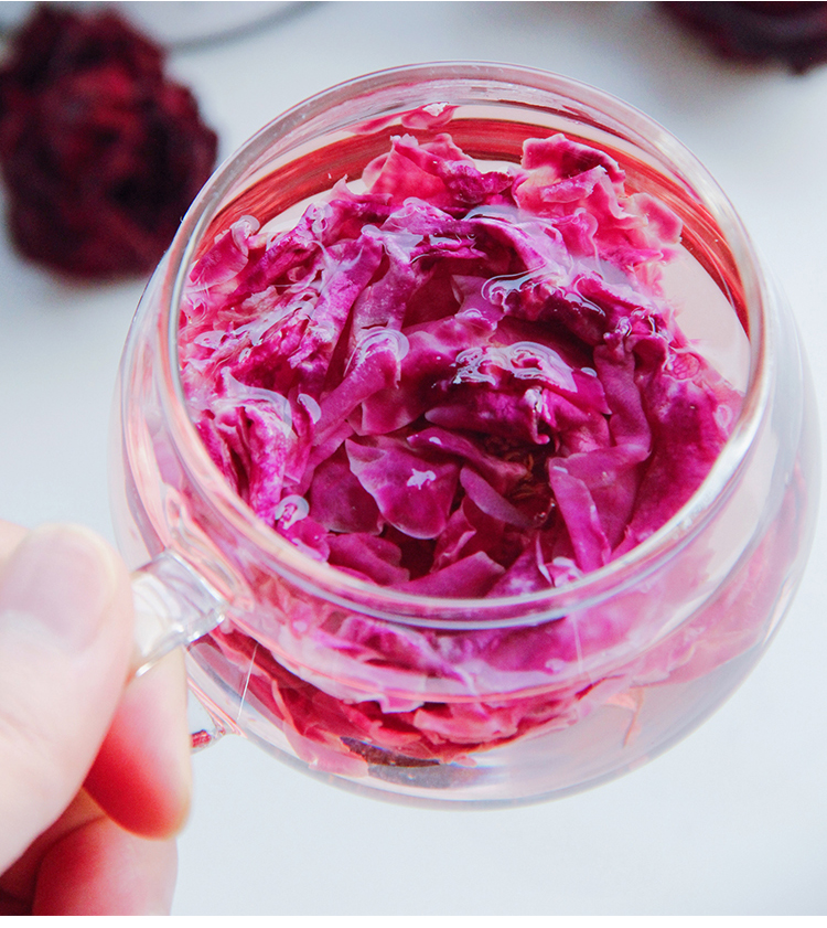 4、墨红玫瑰花瓣中的精油成分,比其他品种高出许多倍,所以泡开后待水稍凉,会漂浮玫瑰精油哦!