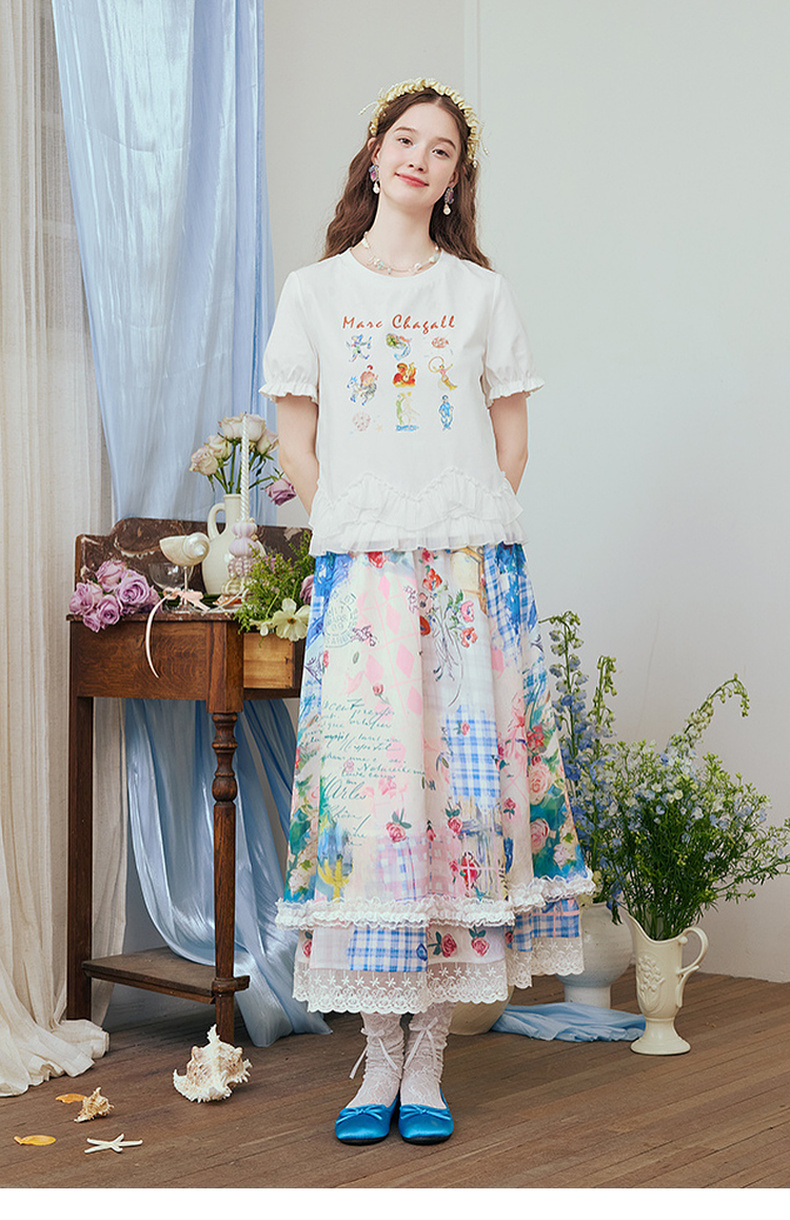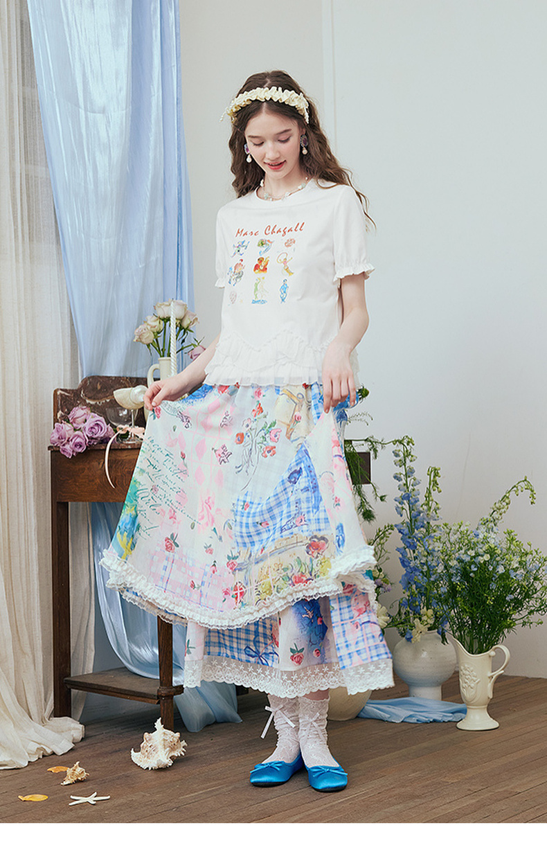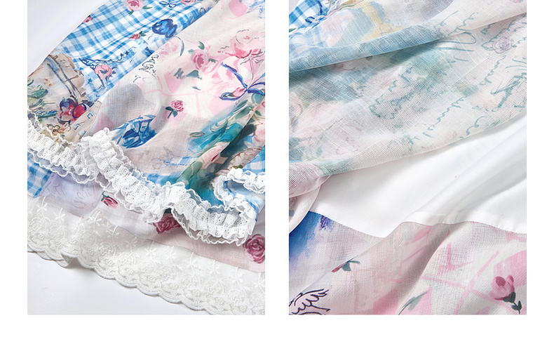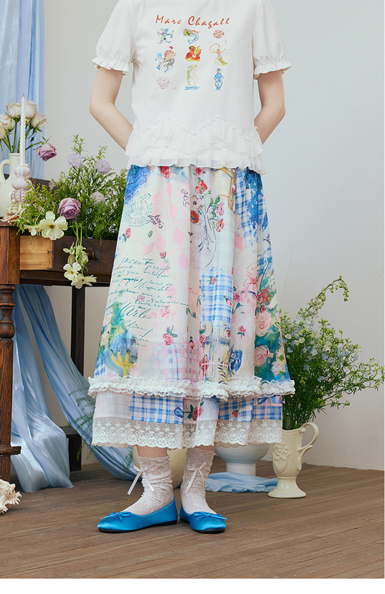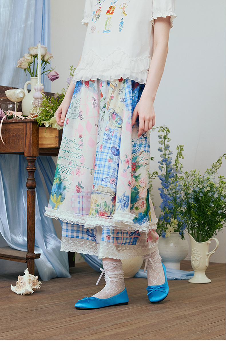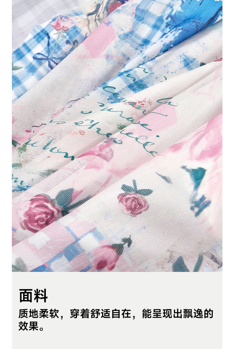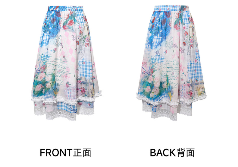 两三事蜜糕花阶2025夏季新款甜美蕾丝花边拼接双层裙摆印花半身裙