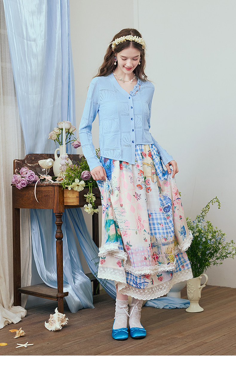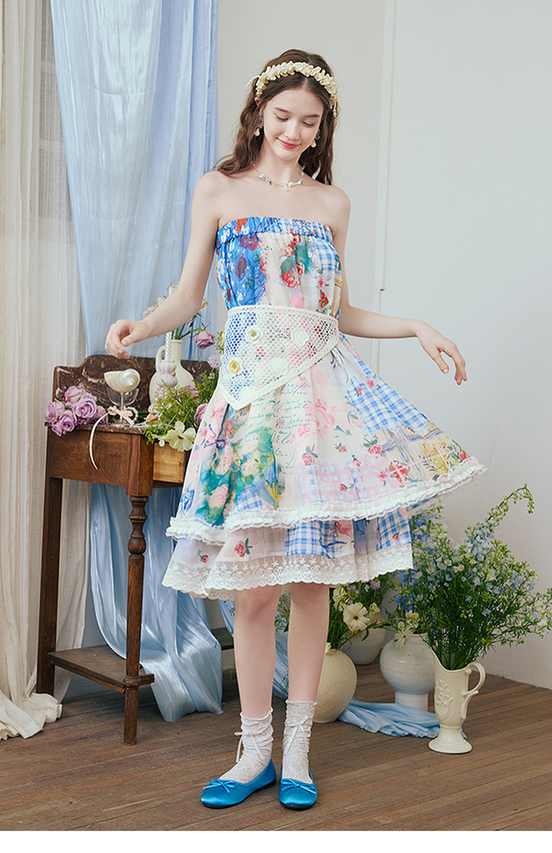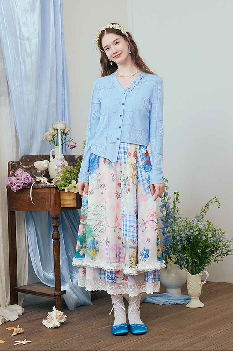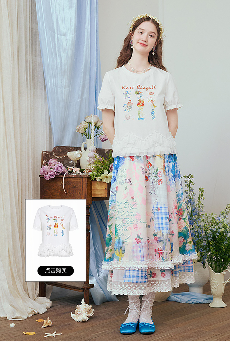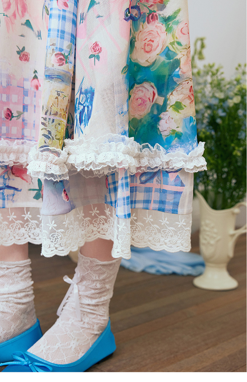 两三事蜜糕花阶2025夏季新款甜美蕾丝花边拼接双层裙摆印花半身裙