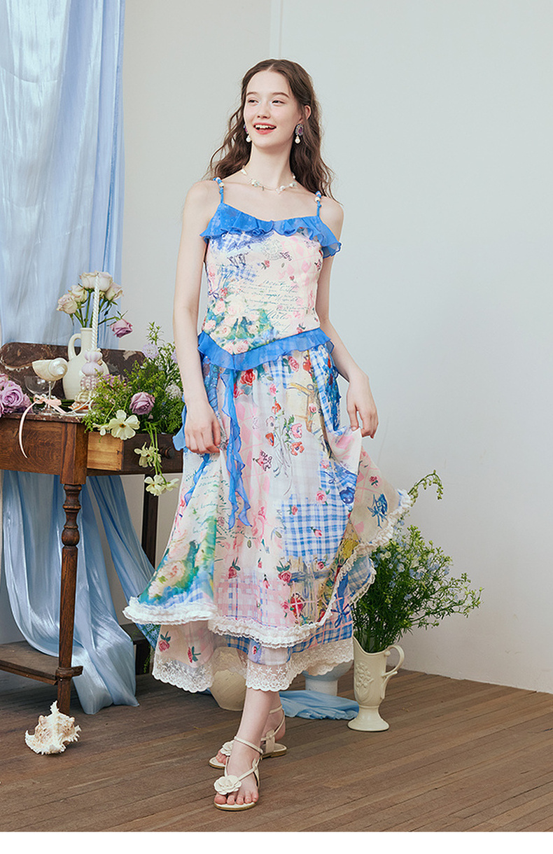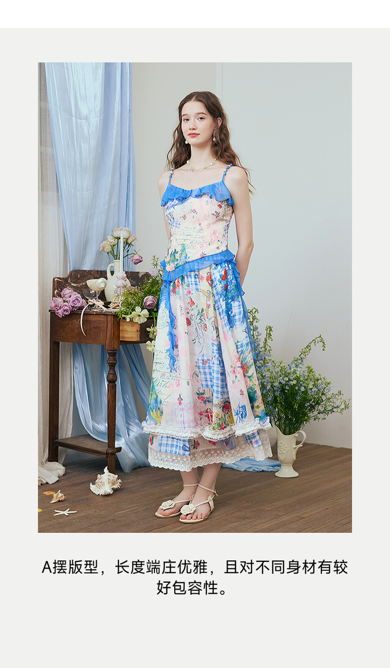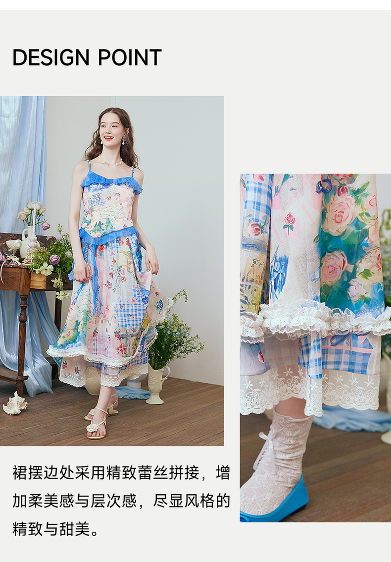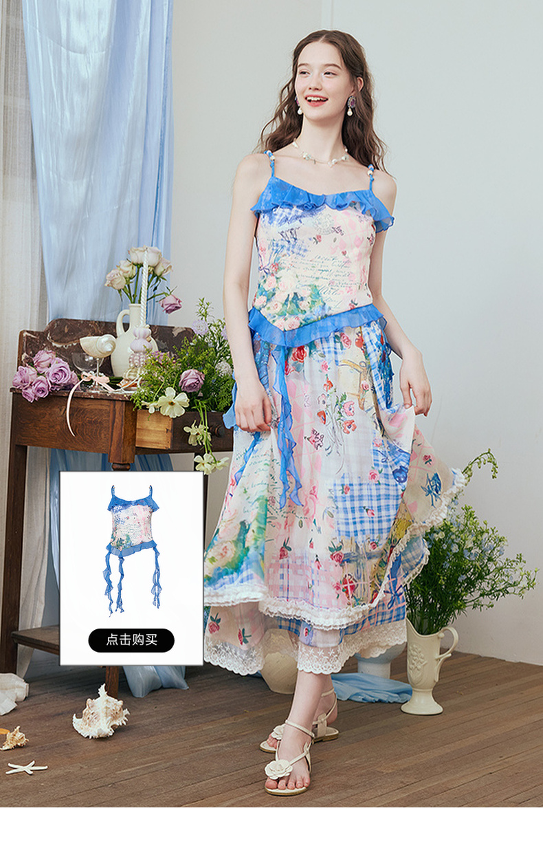 两三事 森灵绮梦 2025夏季新款小清新印花拼色绑带吊带裙连衣裙