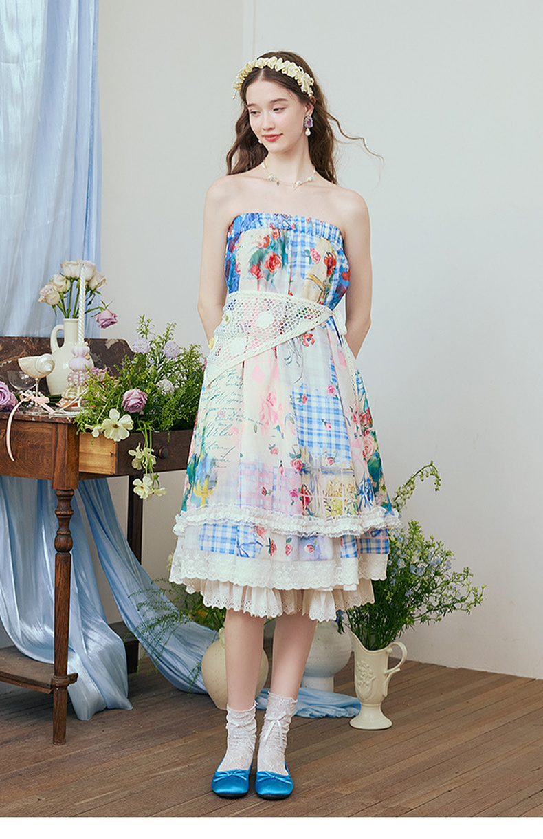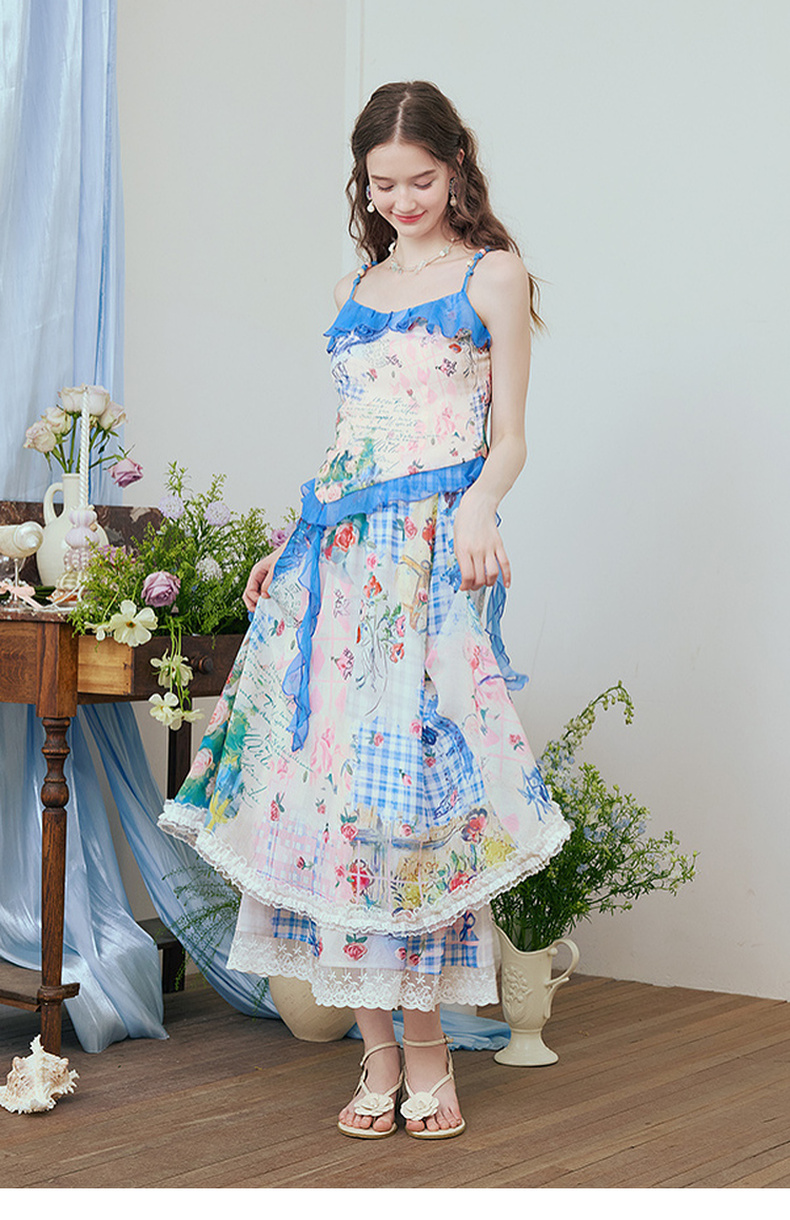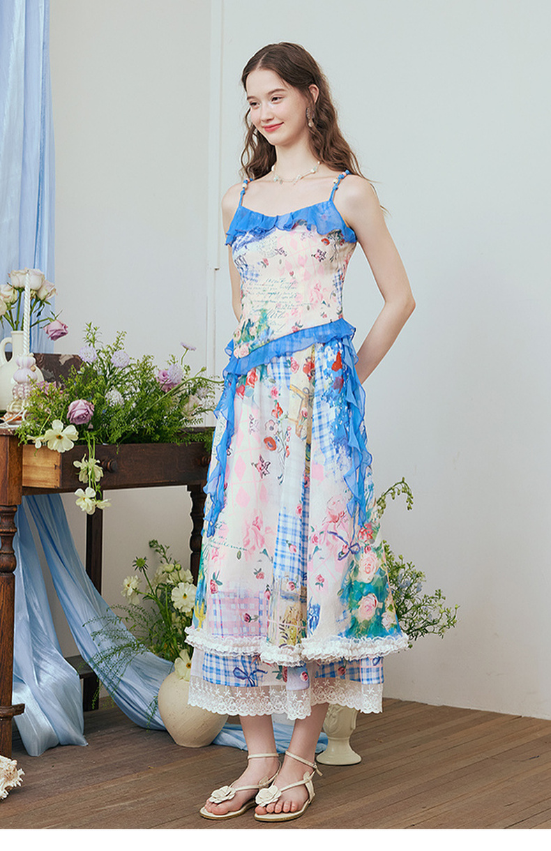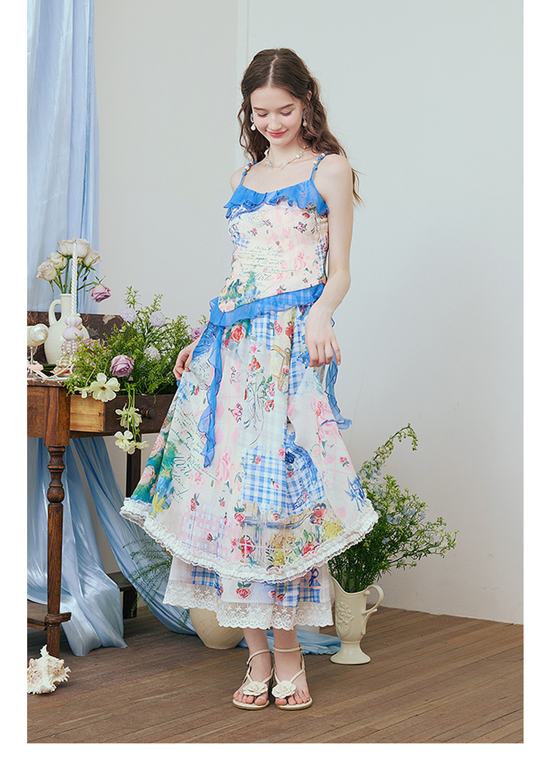 两三事 森灵绮梦 2025夏季新款小清新印花拼色绑带吊带裙连衣裙