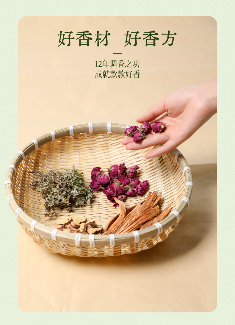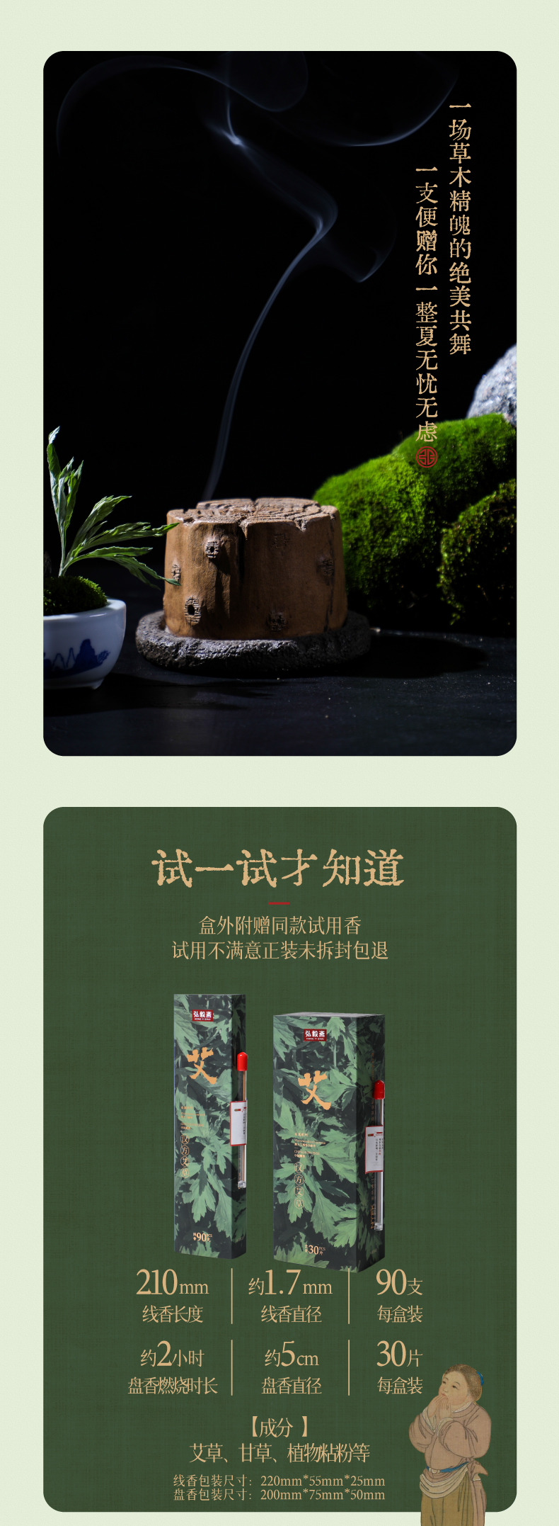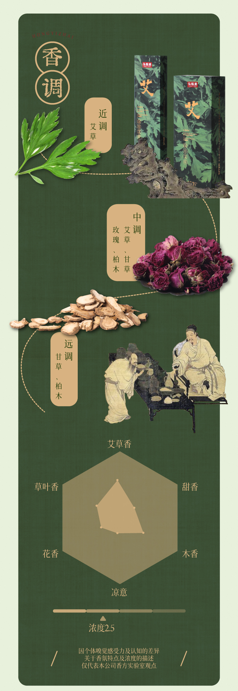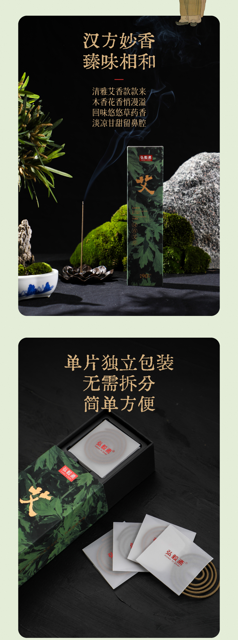 弘毅斋<汉方艾草香>以柏木、檀香增强艾草香的甜凉韵味,醇厚的木香有效弱化了艾草薰燃情形下独有的焦油气息且烟量少,香氛更趋雅致。