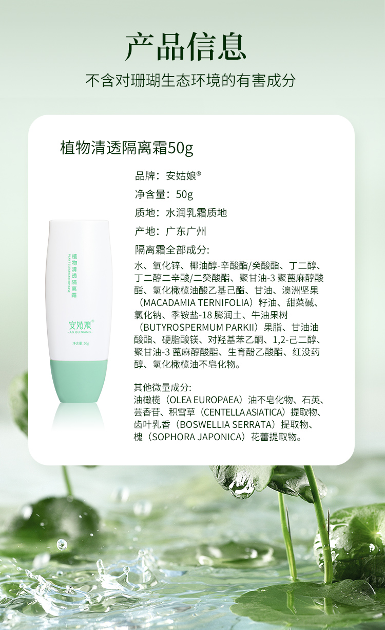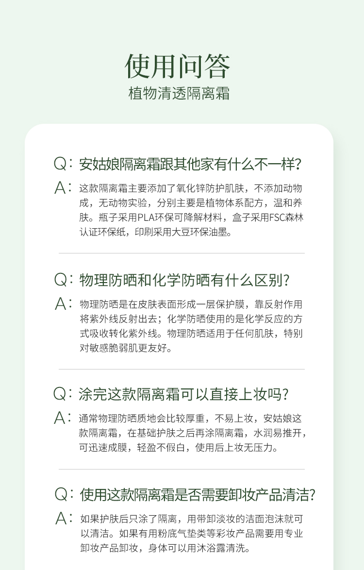 卸妆:护肤之后用隔离霜,只需要用我们家洁面泡沫在脸部按摩停留30秒后再清洗,可以洗两遍就可以清洁。如果是有化粉底液气垫等彩妆,需要用专业卸妆产品卸妆哦~