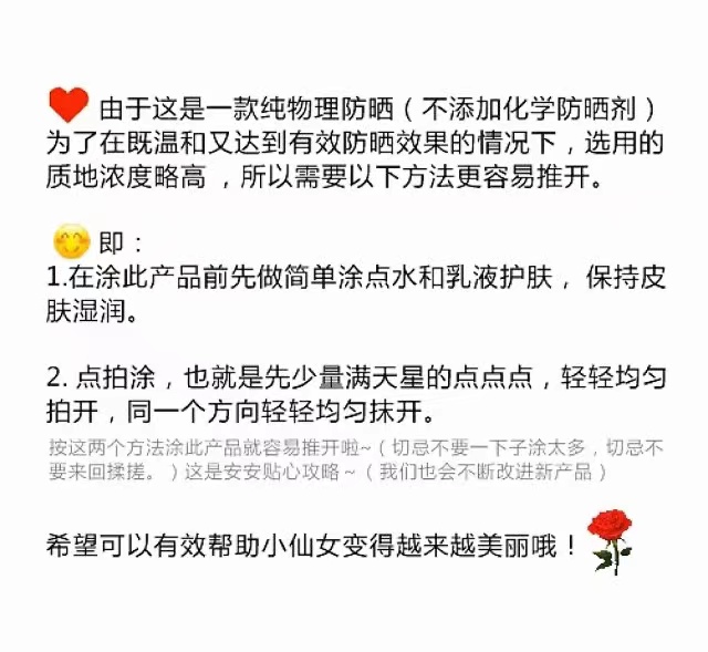 防晒系数:是30左右,防晒系数越高就必须要添加化学防晒剂,对皮肤越影响容易造成敏感肌。中和情况下纯物理防晒霜做到30左右,日常上下班逛街是够了,如果沙滩爬山直晒2个小时后补涂一次效果更佳。