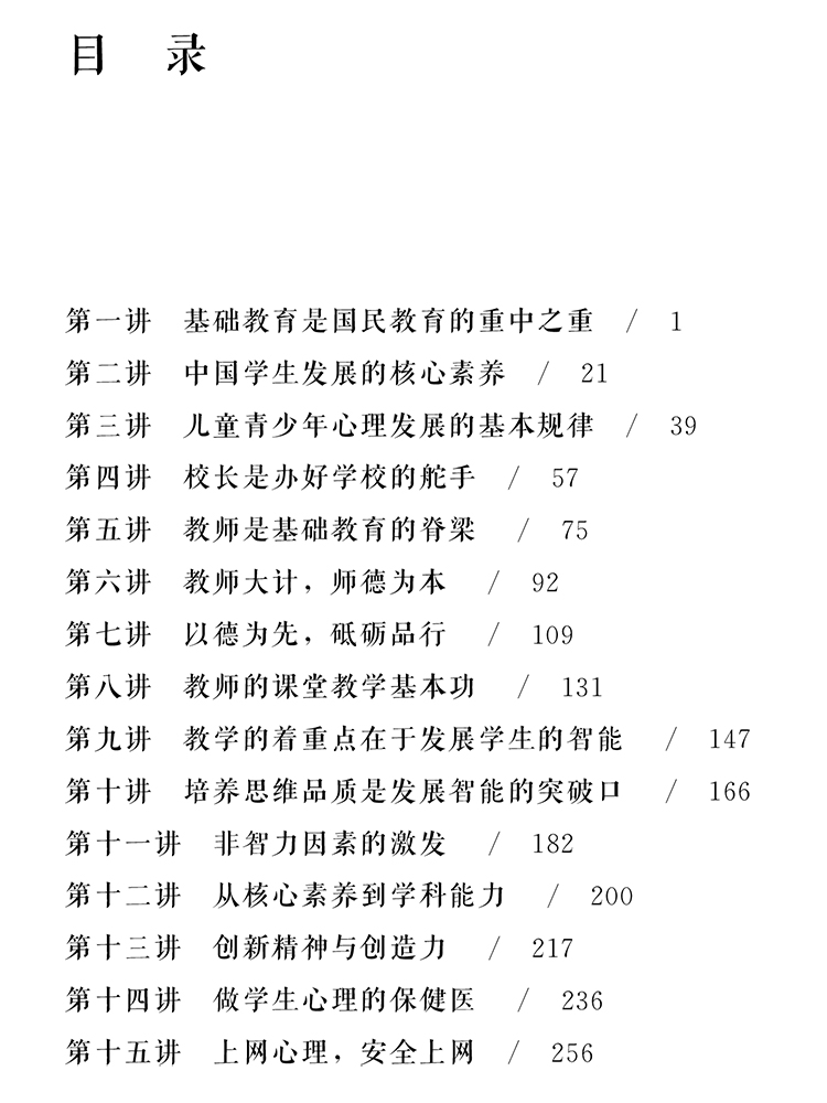 本书是林崇德教授数十年研学从教经验和毕生研究成果的凝聚体现。作者从教育心理的专业视角,结合对当下教育的思考,全面系统深入地介绍了基础教育重点关注的各项问题,包括:基础教育的重要性、中国学生发展核心素养研究、儿童青少年身心发展规律、校长领导力、教师师德师风建设、教师队伍建设与专业发展、学生智能的发展与思维品质的培养、非智力因素的激发、创新精神与创造力的培养、学生心理健康教育、网络心理与安全教育等。这些理论研究与思考可为基础教育工作者开展教育教学提供专业指导,对基础教育课程改革与发展具有积极意义与借鉴作用。