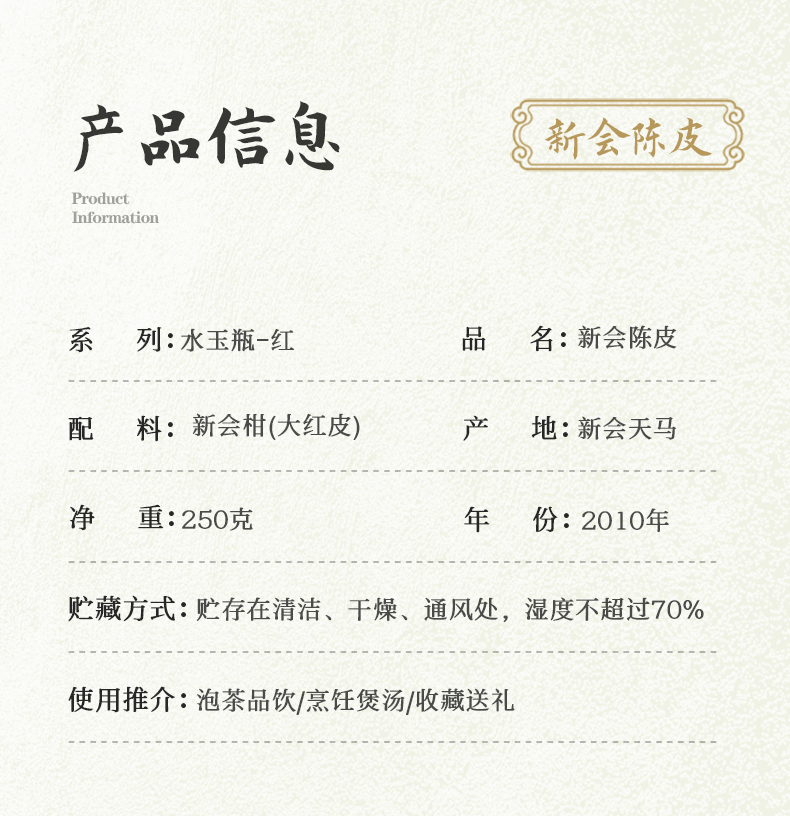 2010年岁月陈皮 水玉瓶新会陈皮 天马老陈皮泡茶水 官方正品250克
