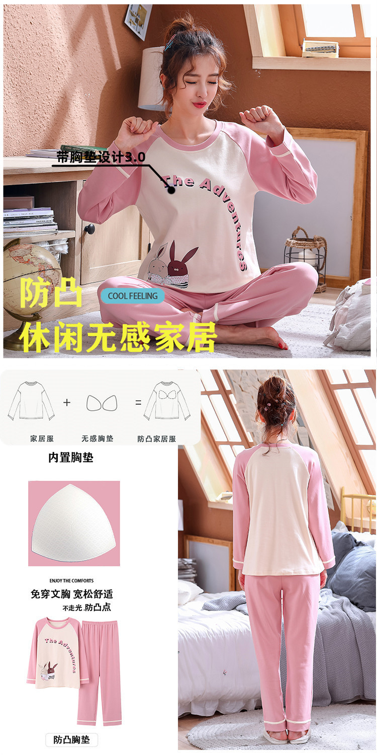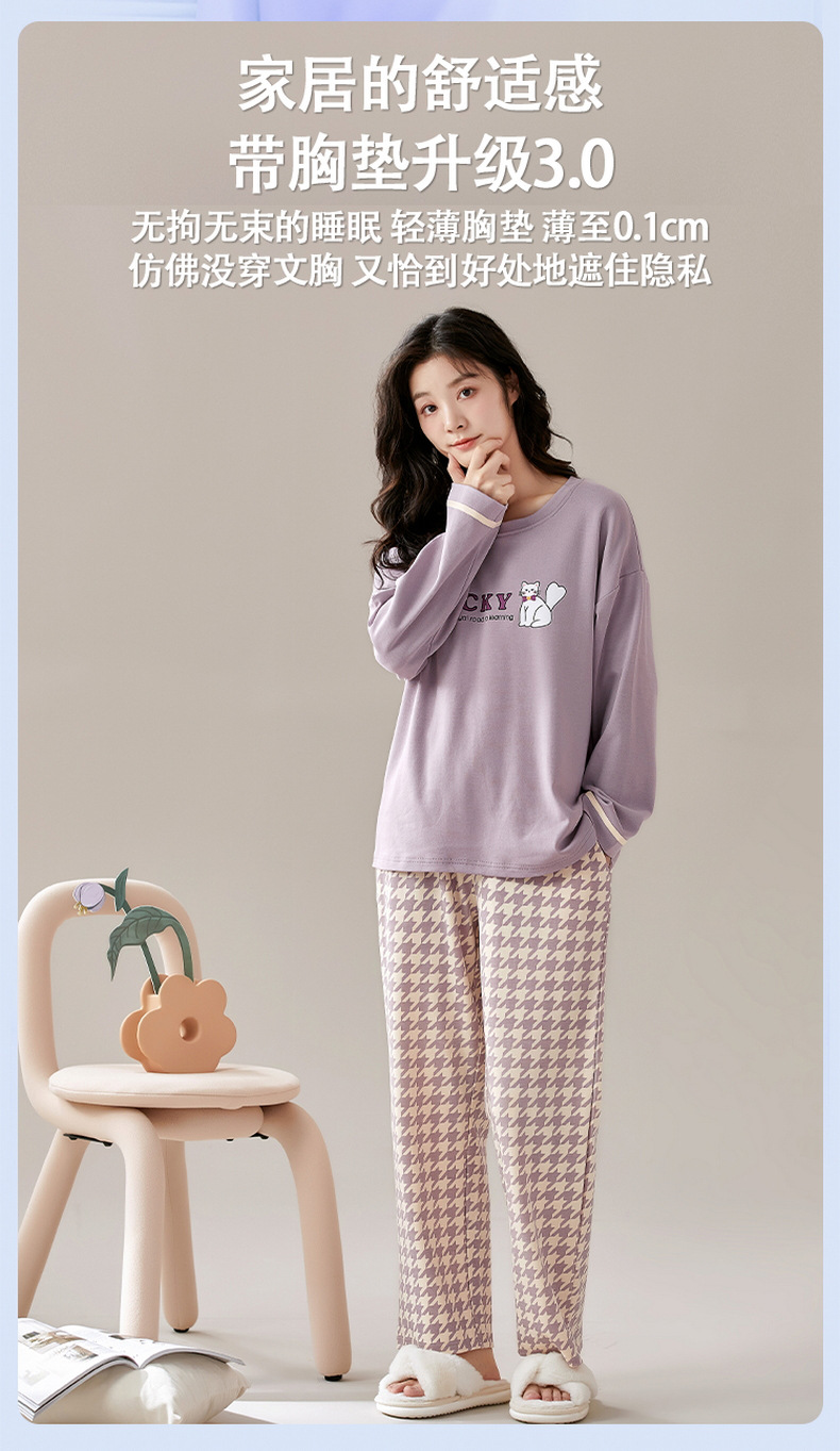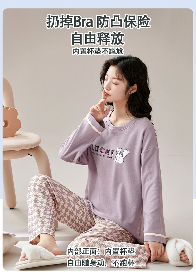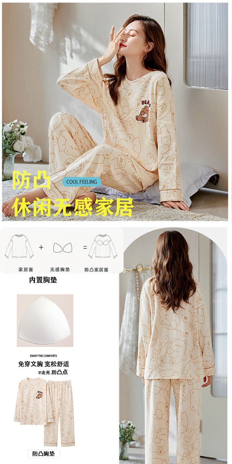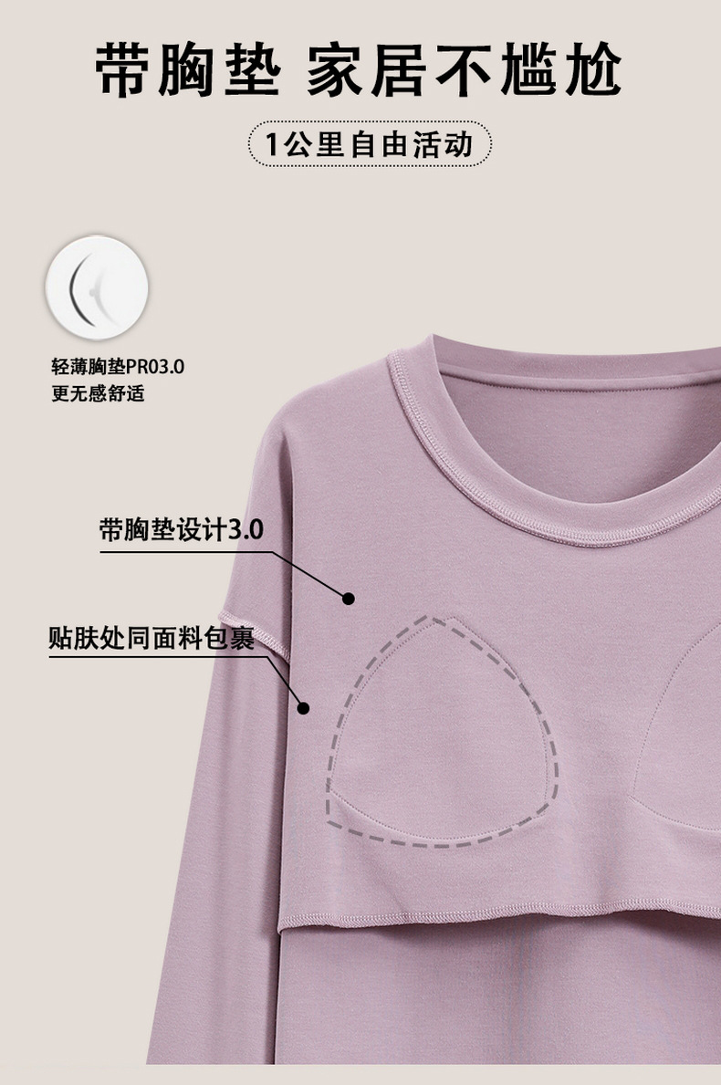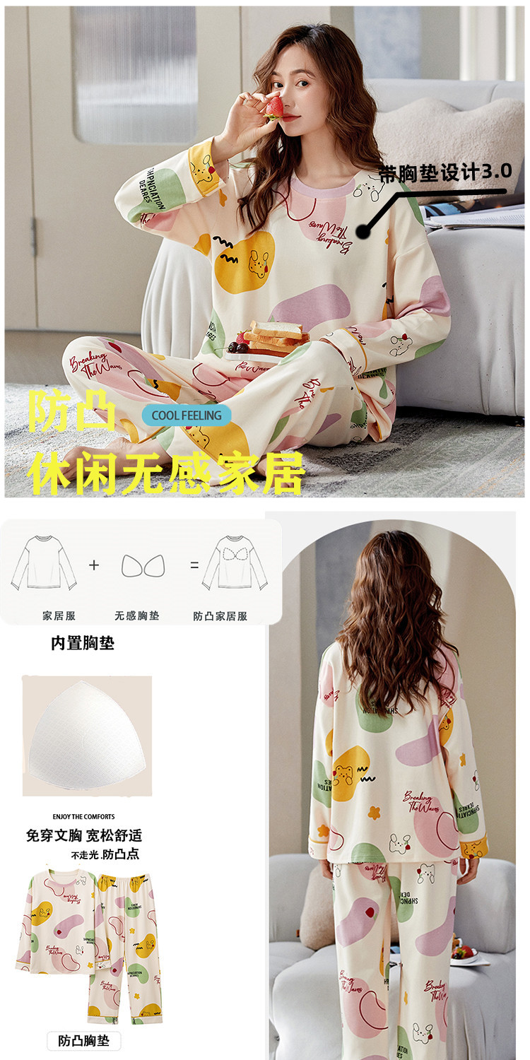 秋季新款家居服圆领套头睡衣女春秋款带胸垫免穿内衣长袖家居服防凸点可外穿起居