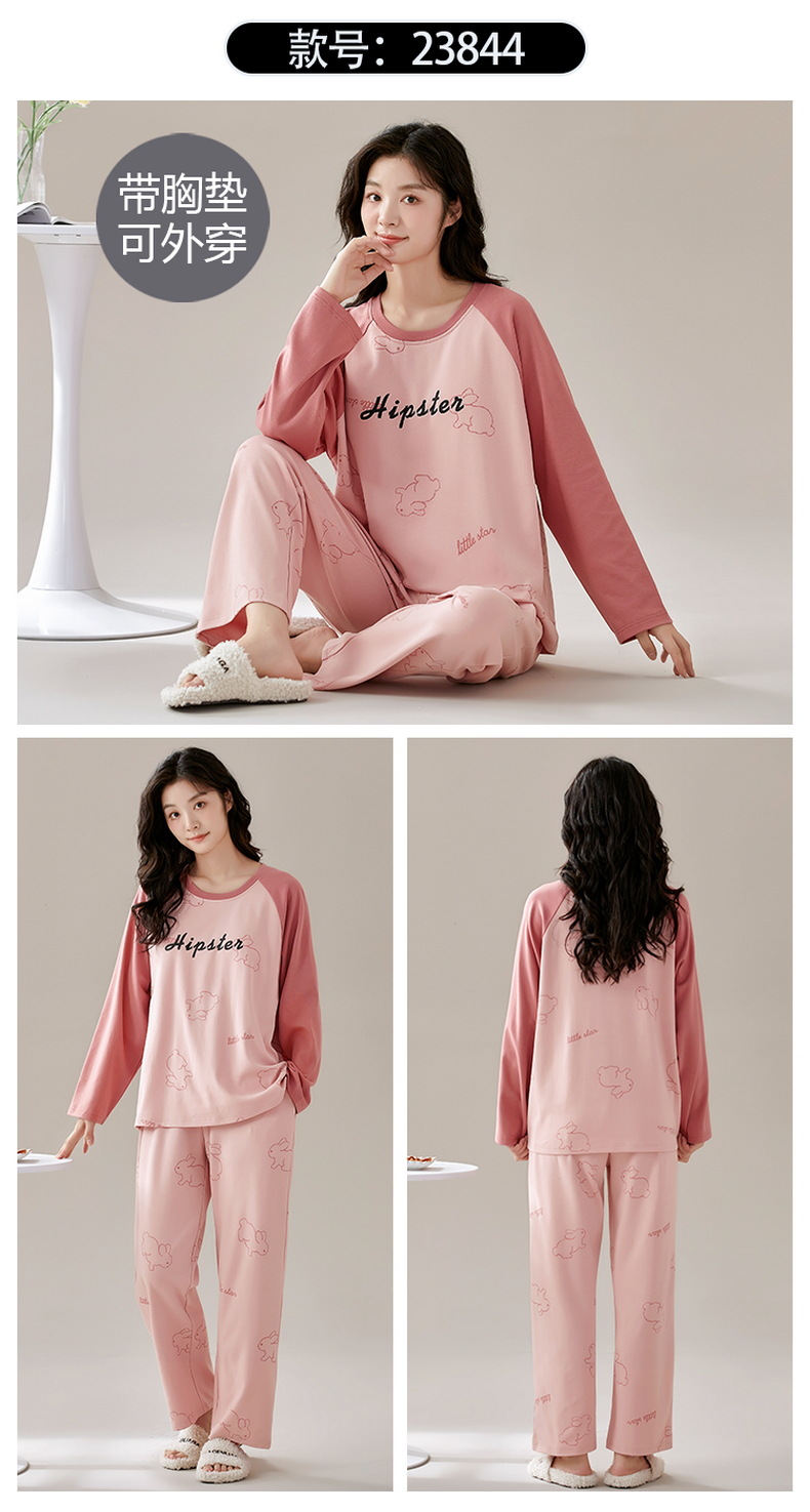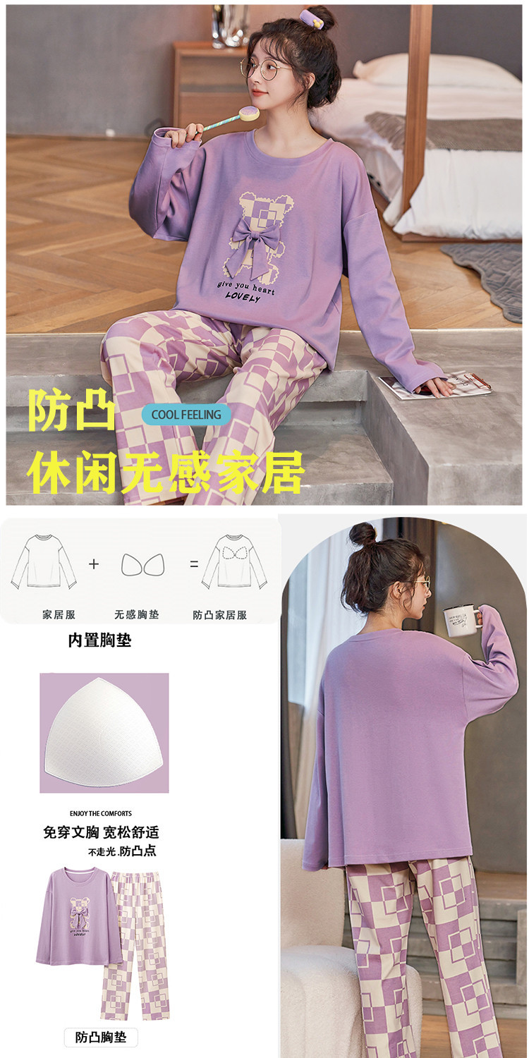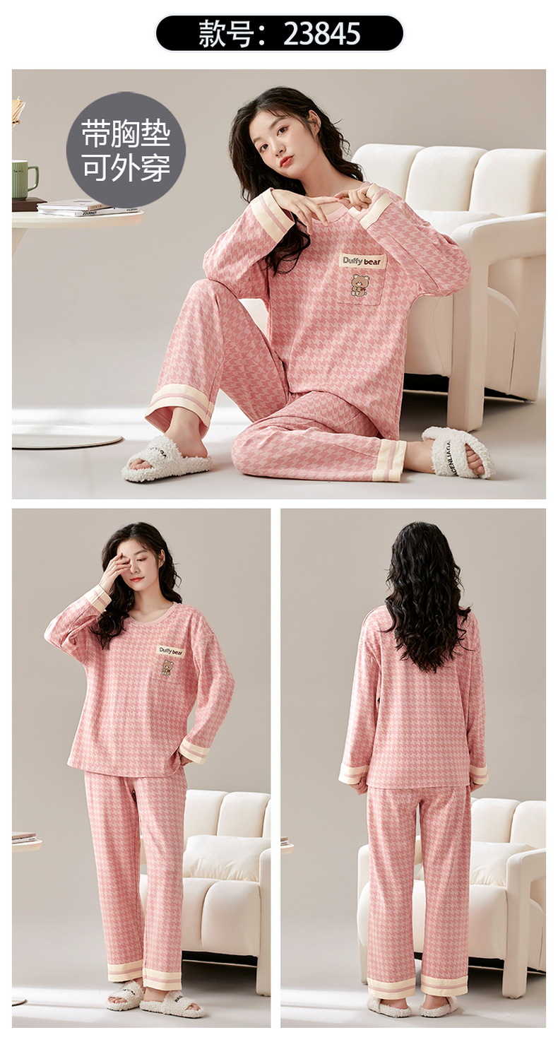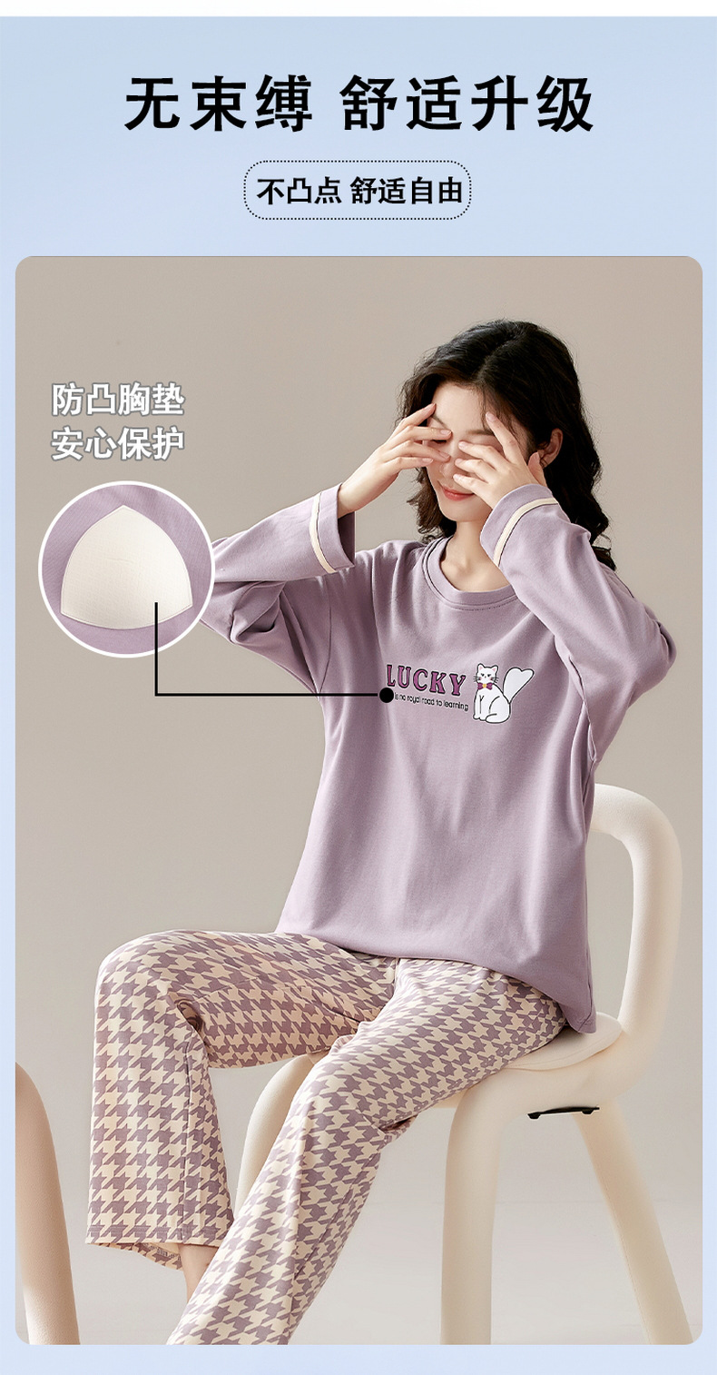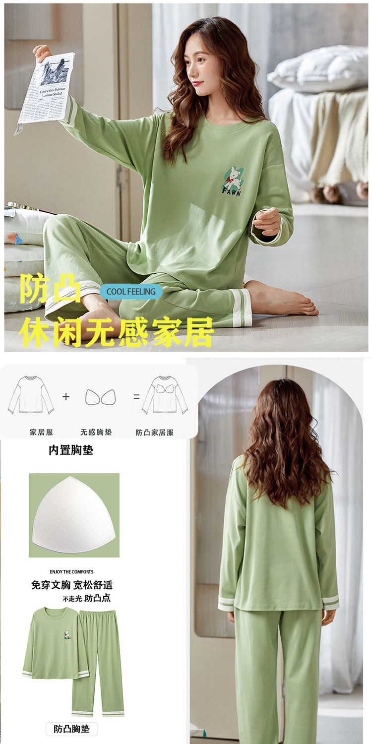 秋季新款家居服圆领套头睡衣女春秋款带胸垫免穿内衣长袖家居服防凸点可外穿起居