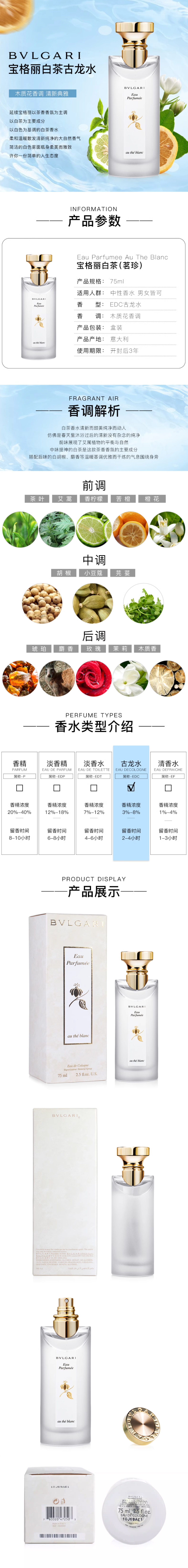 宝格丽 白茶女士淡香水75ml