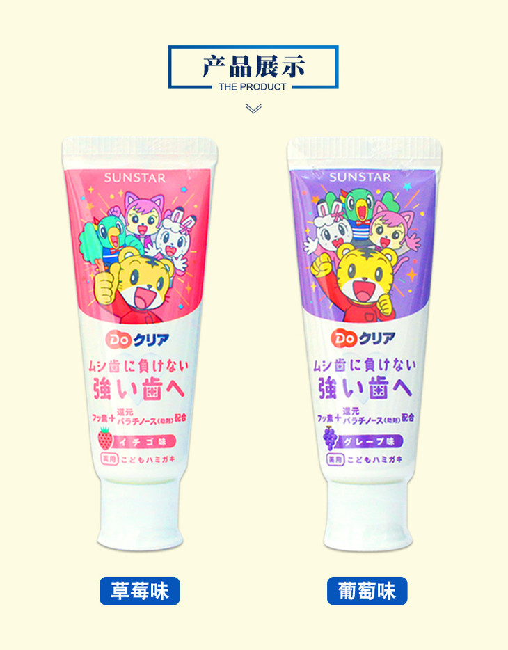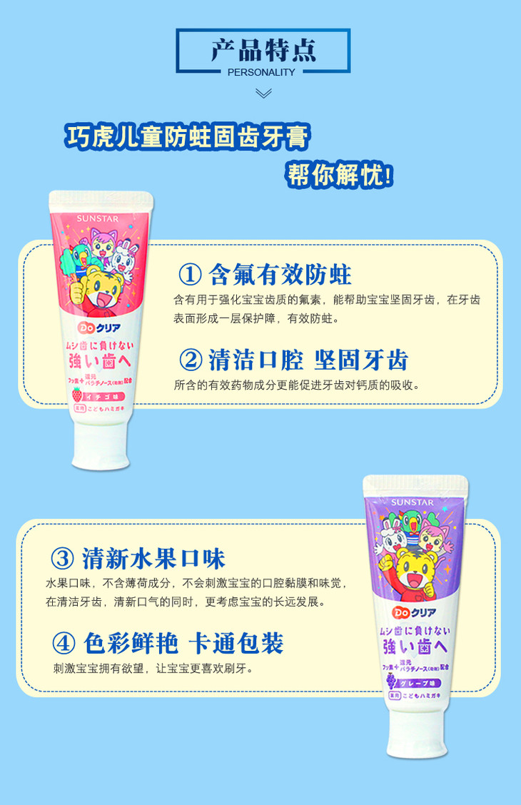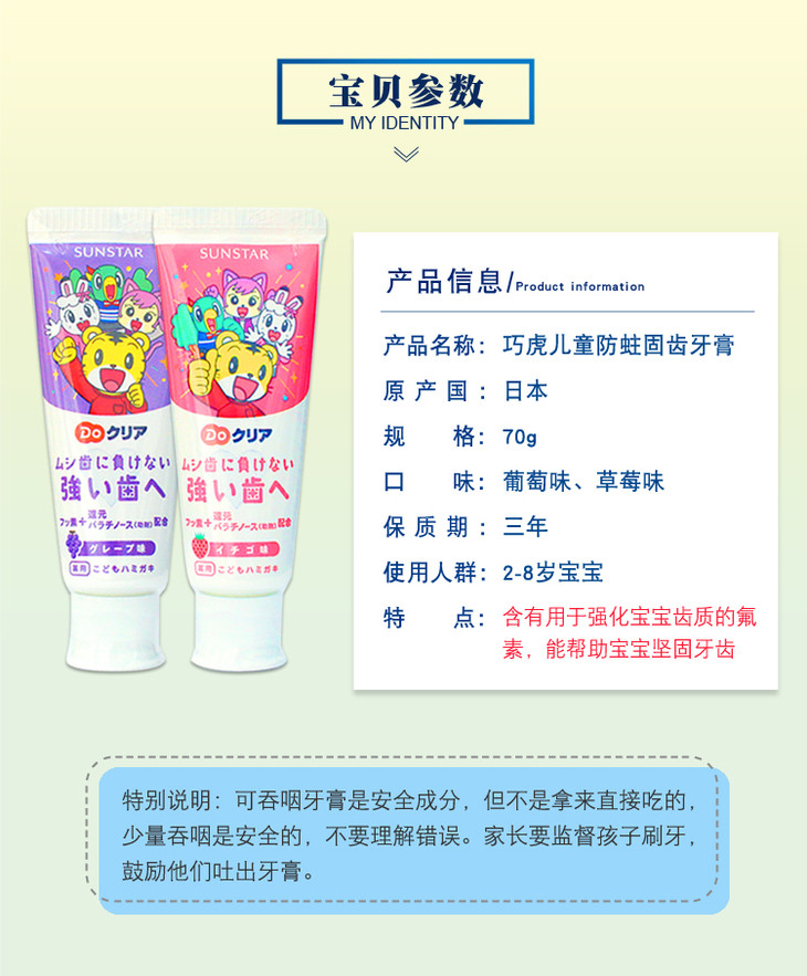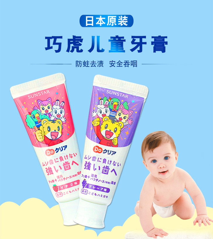 日本进口巧虎儿童牙膏宝宝牙膏含氟可吞咽防蛀去黄斑水果味2-12岁70g