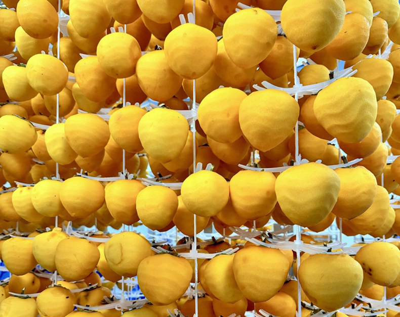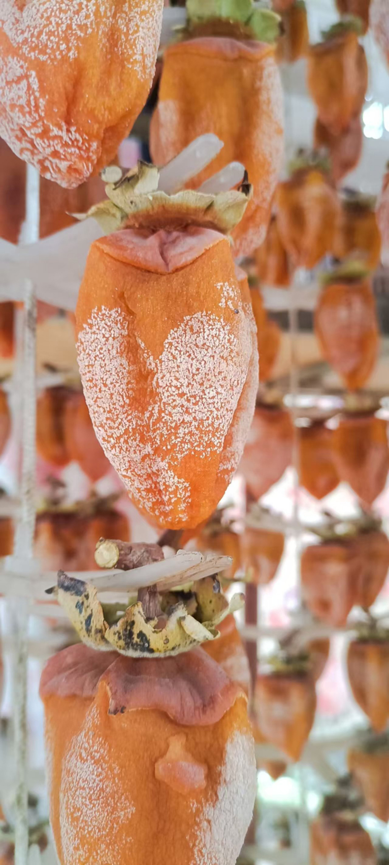 ⏩️采摘→选果洗果→削皮→上架晾晒→脱涩→自然风干→揉捏整形→避光风干→消毒杀菌→出水→剪柄下架→堆捂潮霜(12道工序)