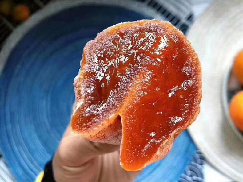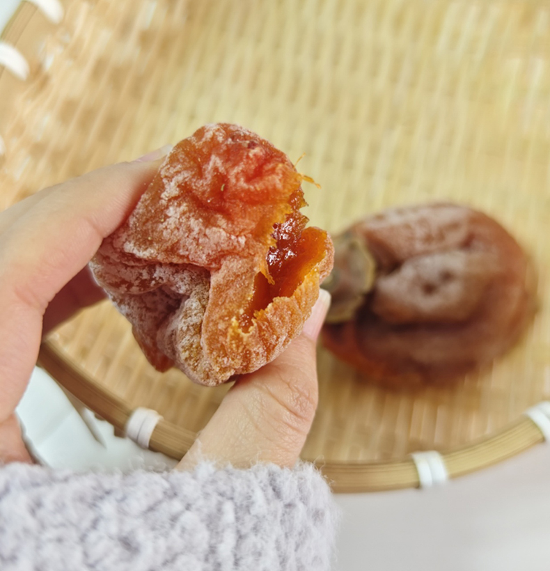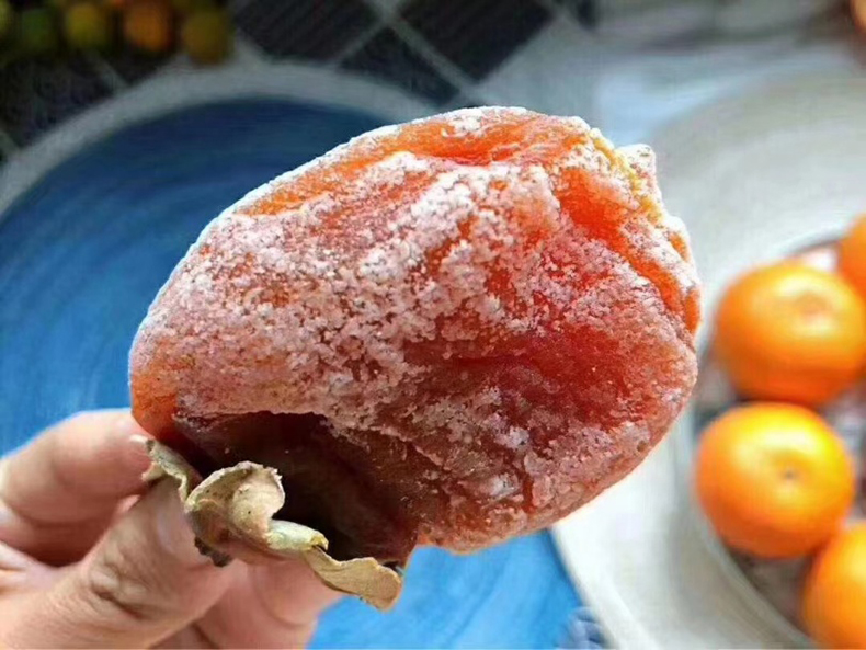 真正的好柿饼,霜是自然凝结的糖衣,指腹轻按,溏心轻颤,仿佛藏着整个秋天的阳光。外表干爽,内里却流淌着晶莹的蜜浆,一口下去,满是被浓缩的鲜甜与柔软。