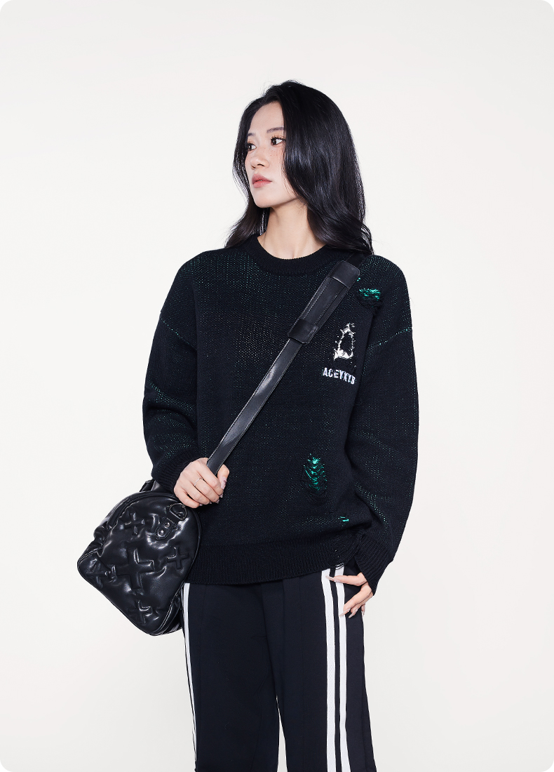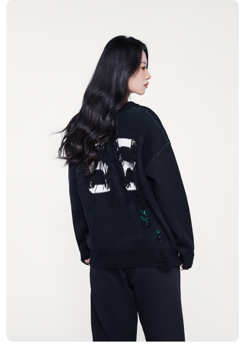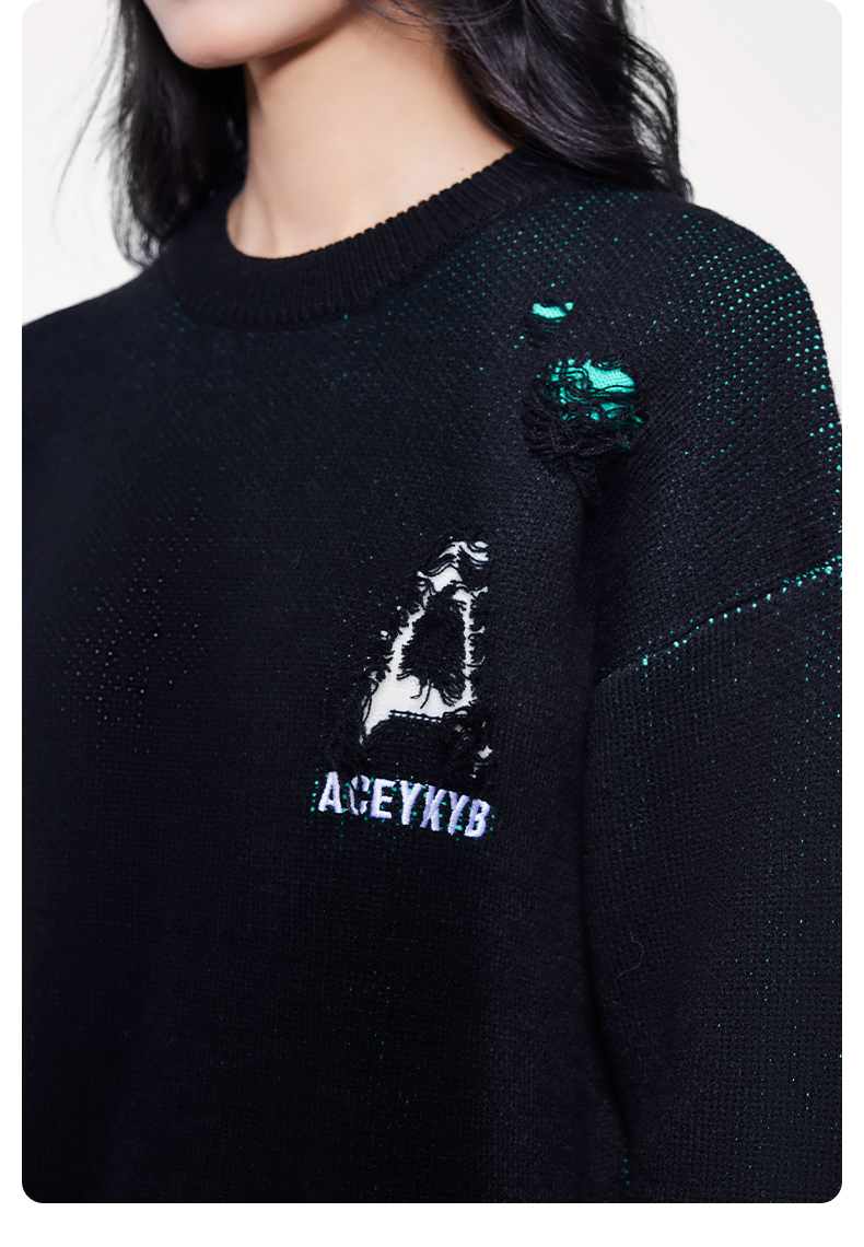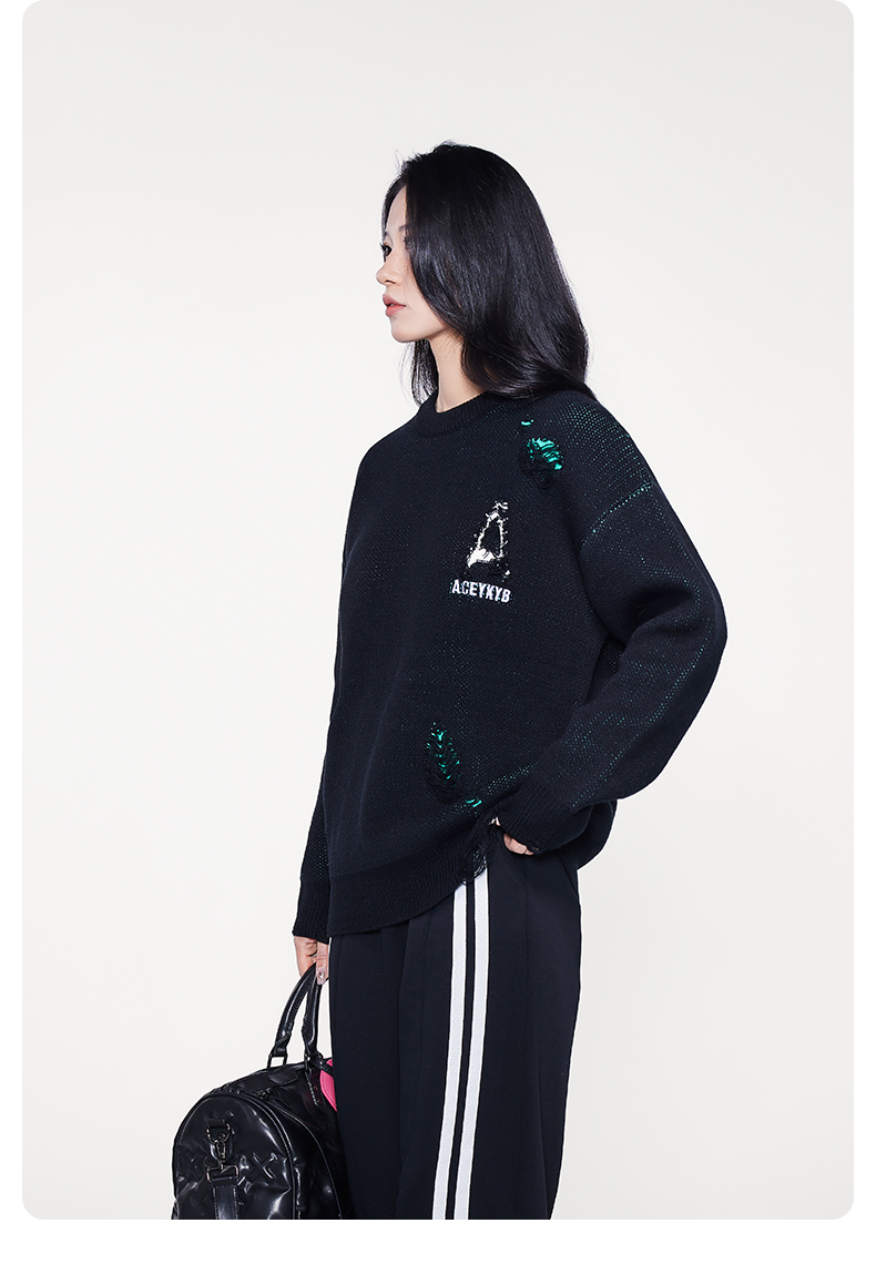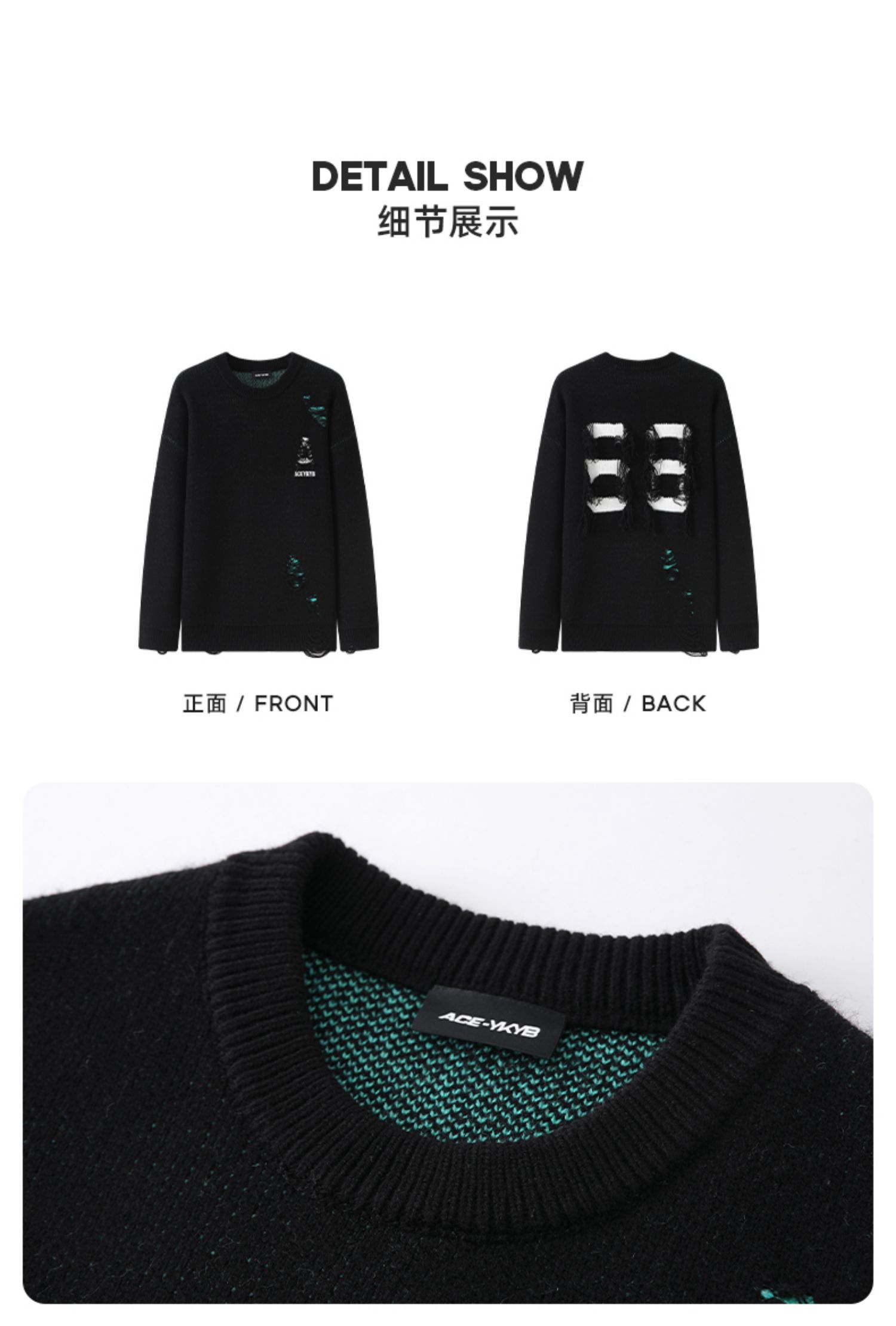 YKYB破坏毛边针织衫2025春新款宽松落肩圆领中性美式街头破洞毛衣
