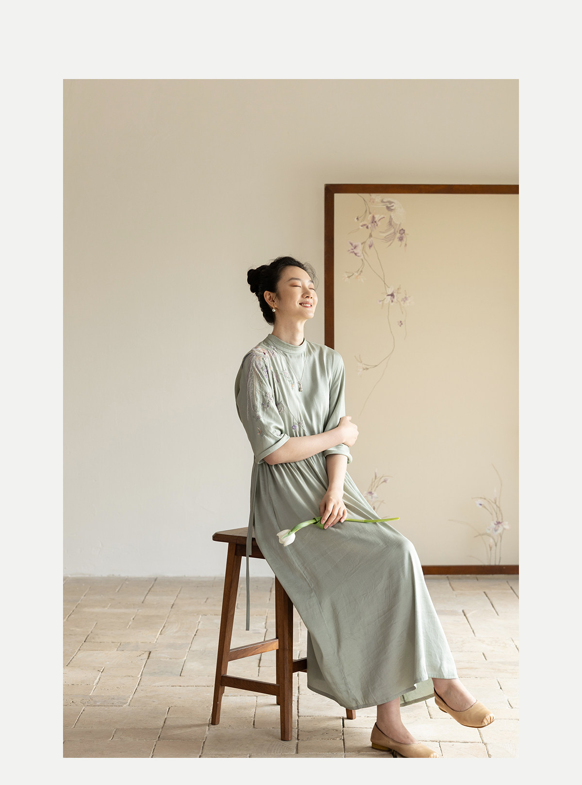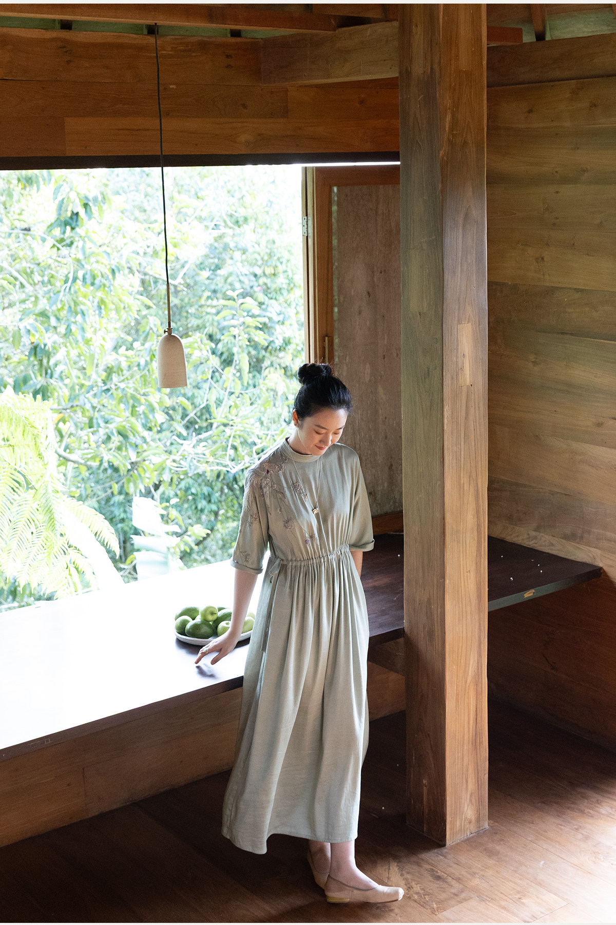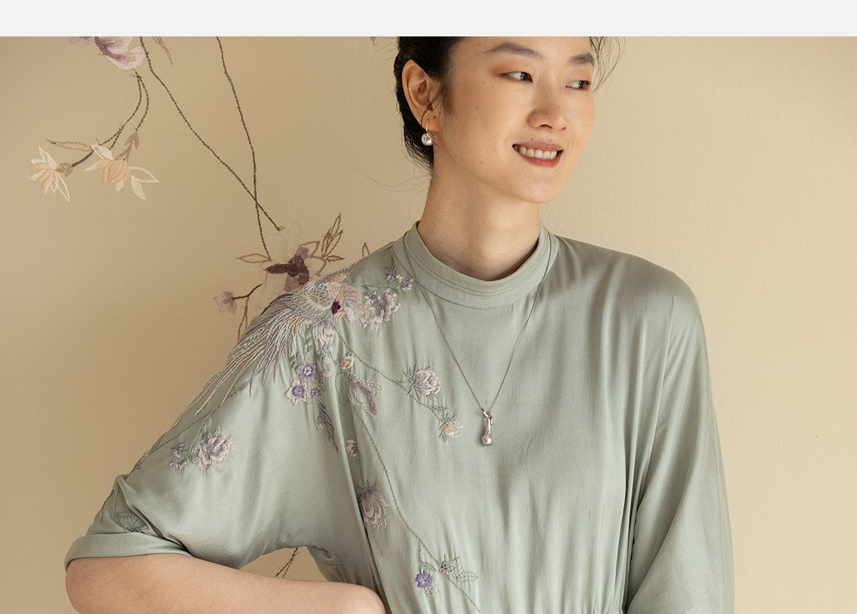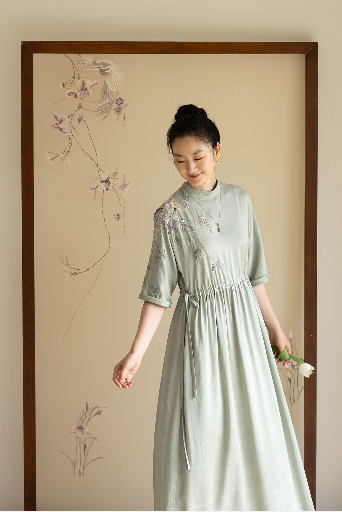 牧衣游原创 22姆米重磅双宫绸重工手绣连衣裙桑蚕丝气质长裙 眠思