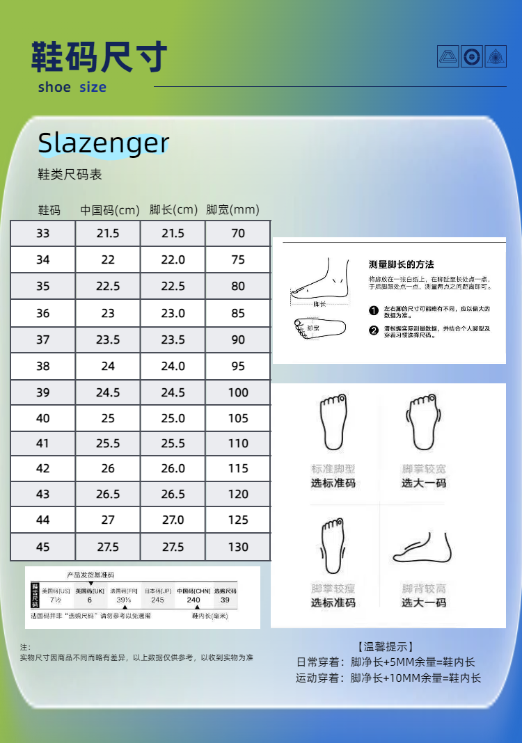 【品名】史莱辛格Slazenger 轻奢运动跑鞋 英国百年品牌 轻便舒适 S92 【规格】黑金色、浅湖青、浅月粉 【尺码】33-45 【产地】国内 【发货包装】独立包装 【发货地】河南 【发货快递】中通、圆通、申通、韵达随机发 【不发货区域】新疆、西藏、港澳台 【发货时效】48-72小时,周末节假日顺延 |
