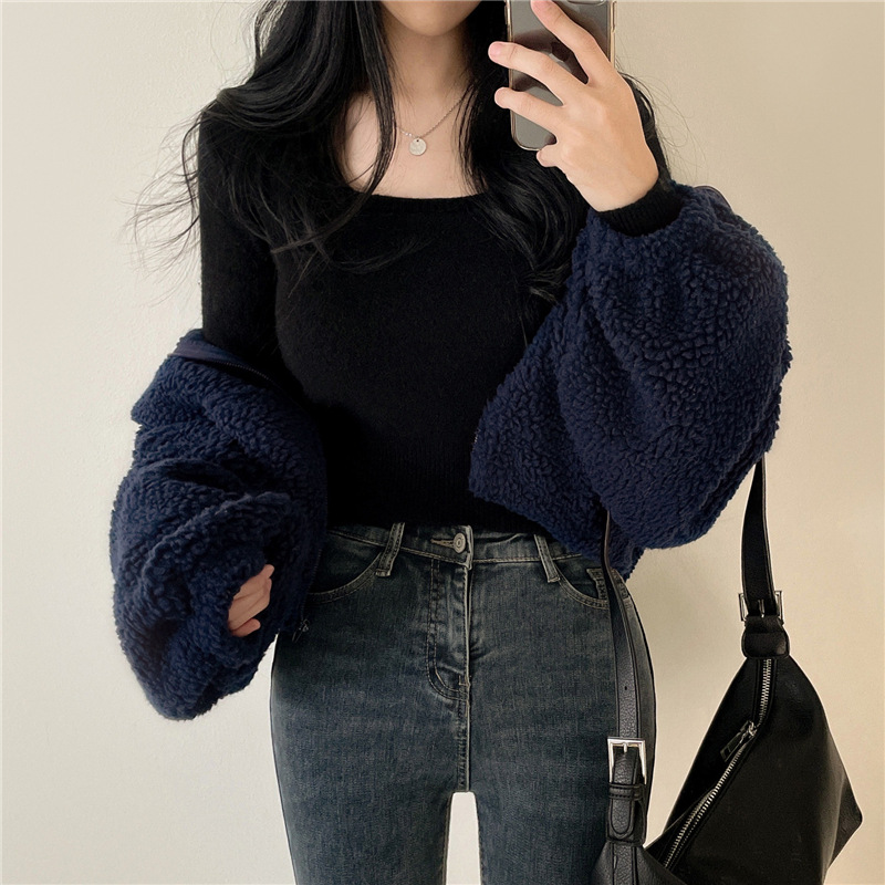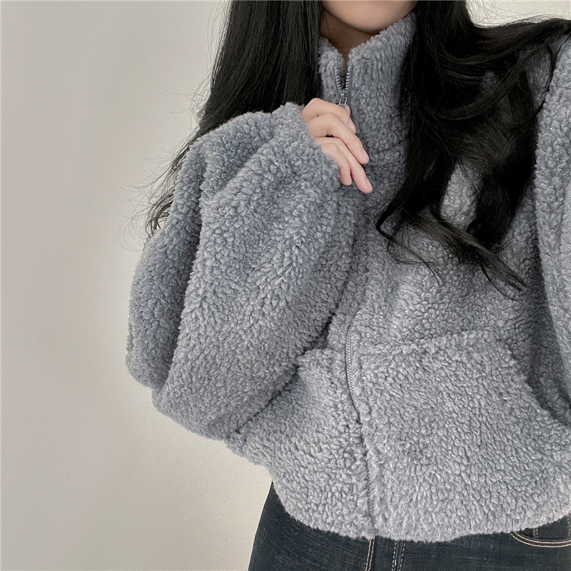 韩版羊羔毛基础款短款百搭慵懒风加厚开衫外套上衣新款小外套