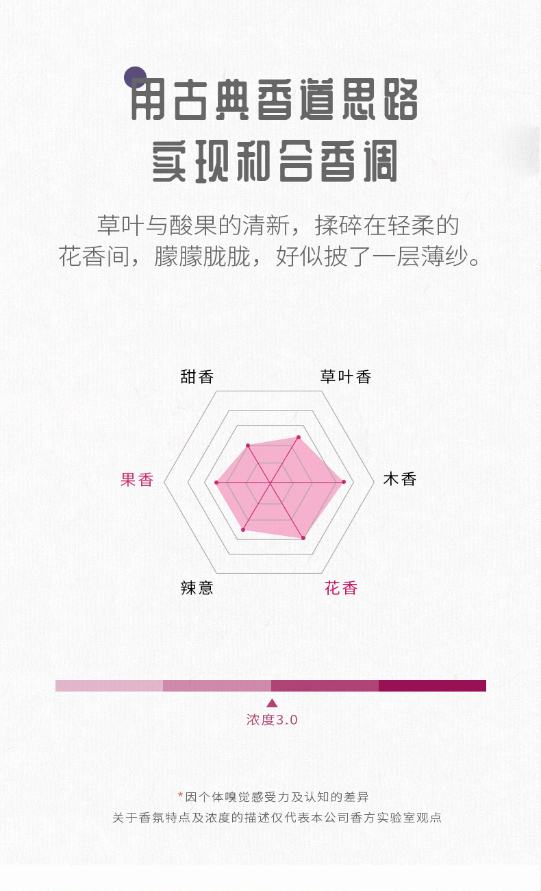 初燃,新鲜带辣意的草本清香入鼻,并可感受到轻薄的果酸气息,渐渐地,沉郁的药香泛起,很快,这股气息被甜美粉感的花香包裹。