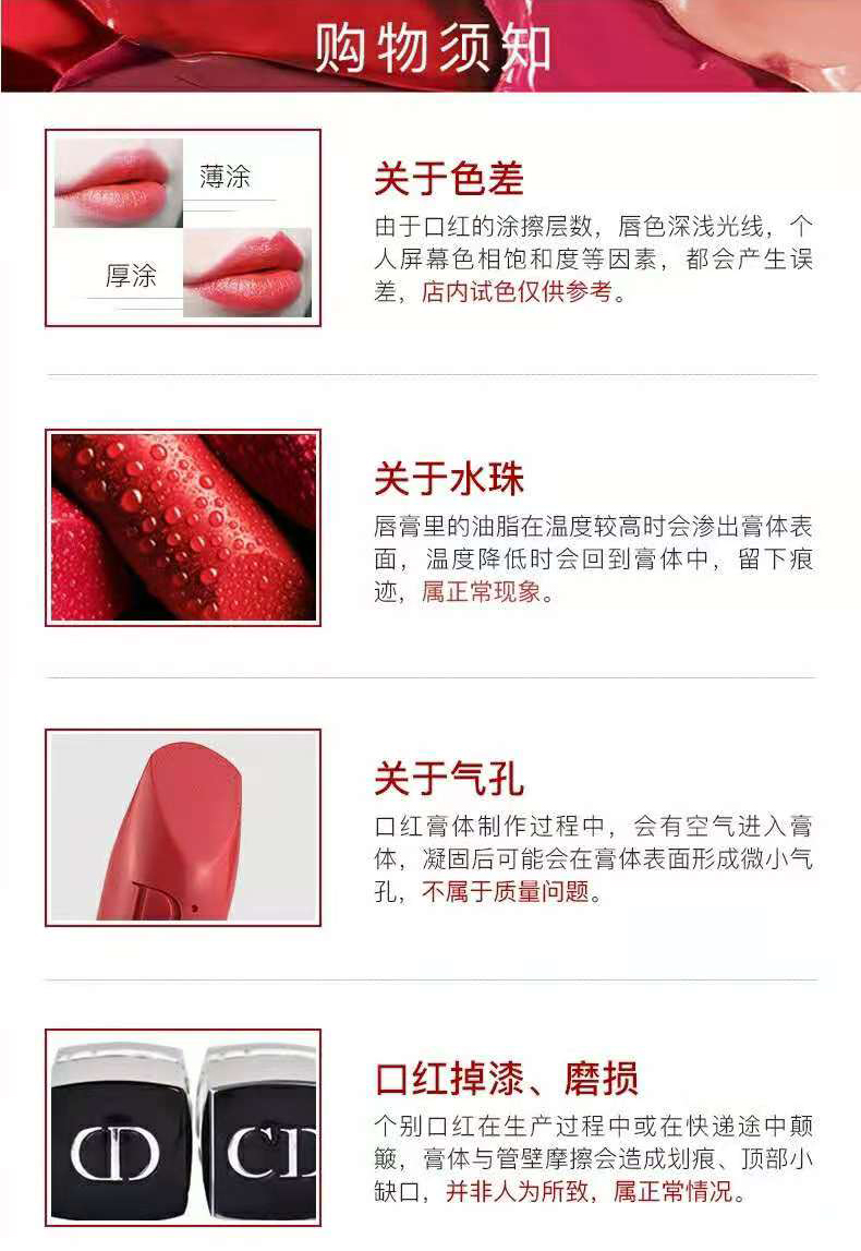 🔹🔹🔹🔹🔹下单前必看🔹🔹🔹🔹🔹 🔍产品版本介绍 1,该商品为20款新版(一般贸易进口),无塑封。 2,质地不同,新版999哑光丝绒质地,稍微干一些,老款则比较滋润。 3,新版重点,有香味。 4,口红和图片,受拍摄条件,设备条件,个人唇色深浅等原因,存在色差。 5,口红含有大量天然植物矿物成分,因为天然成分无法品控,在生产时,不同的生产时间,不同的加料顺序,不同的原料产地都会造成细微的不同,但总体差异不大。 6,运输会造成口红划痕,触顶,出汗等现象属于正常范围。 7,口红管壁长期使用会掉漆包括logo。 8,口红膏体若出现小气泡孔,是生产时空气跑进去了,无法避免。 9,使用后不接受退款。(介意慎拍) |