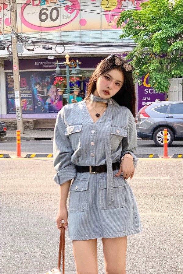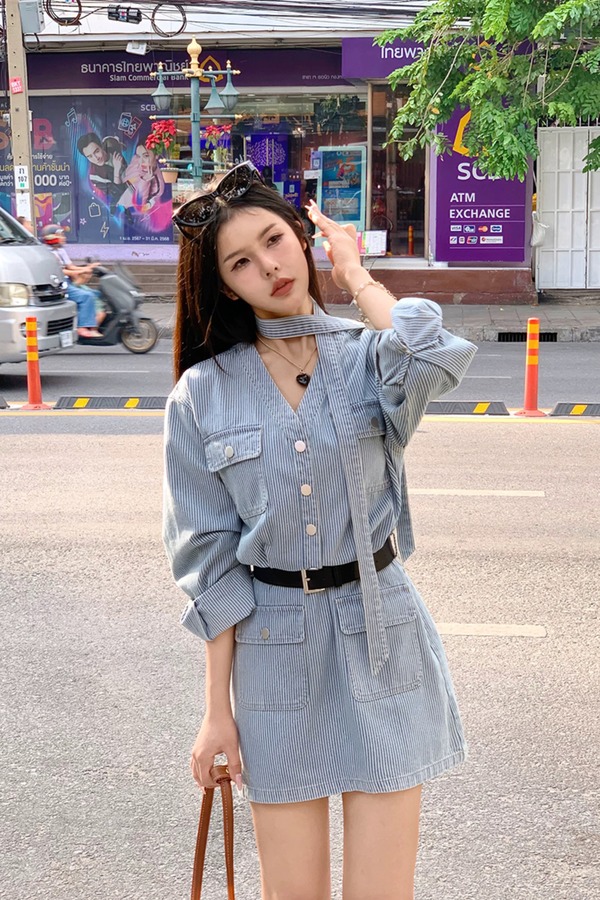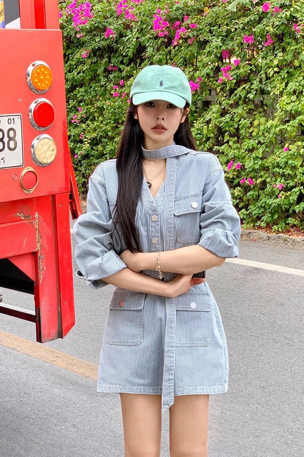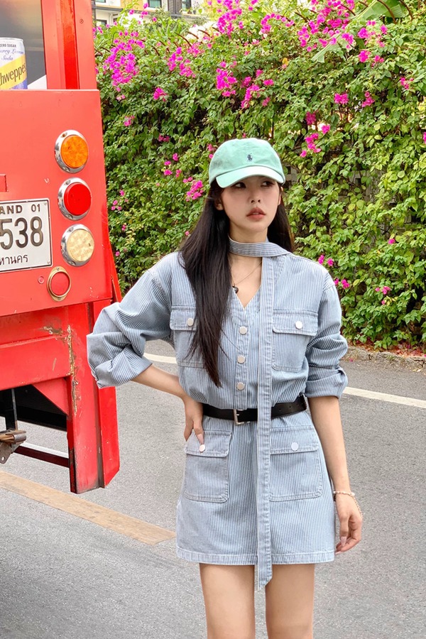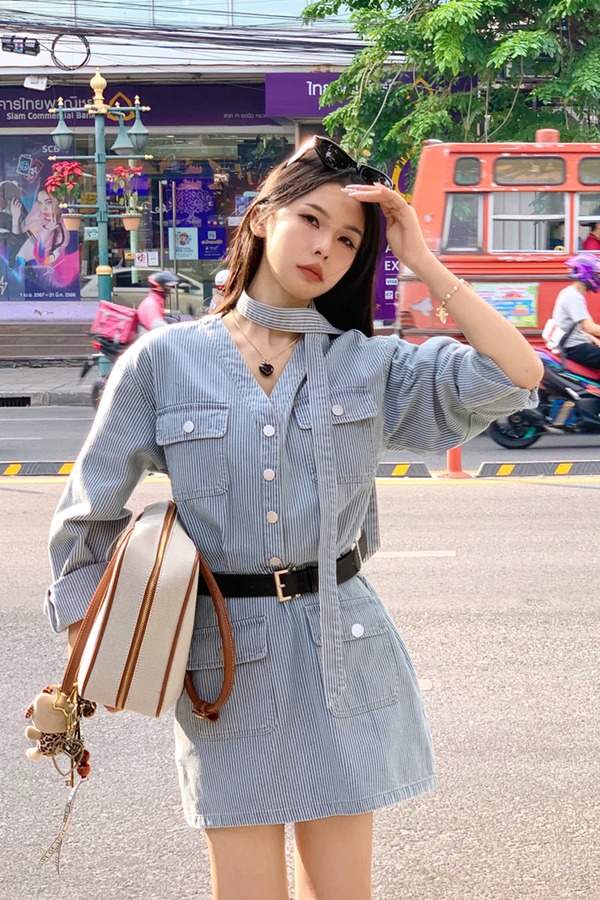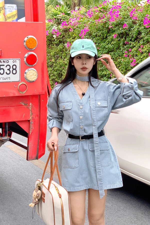LNNNS 复古文艺条纹休闲牛仔连衣裙 22225