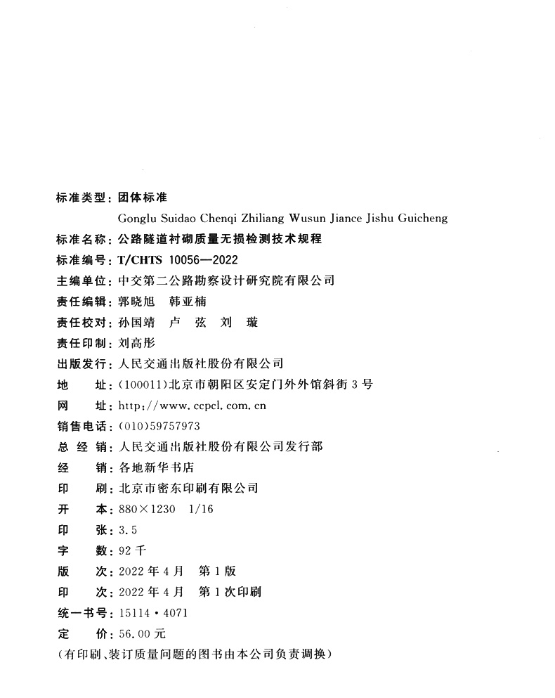 书名:公路隧道衬砌质量无损检测技术规程( T/CHTS 10056-2022)