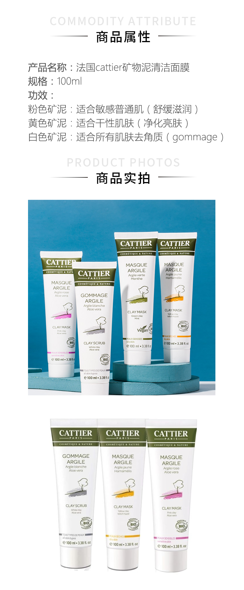 【专区任选,第二件半价】法国cattier矿物泥清洁面膜100ml 粉色矿泥/黄色矿泥/白色矿泥