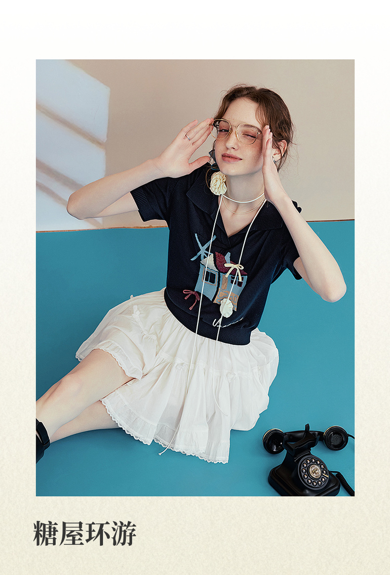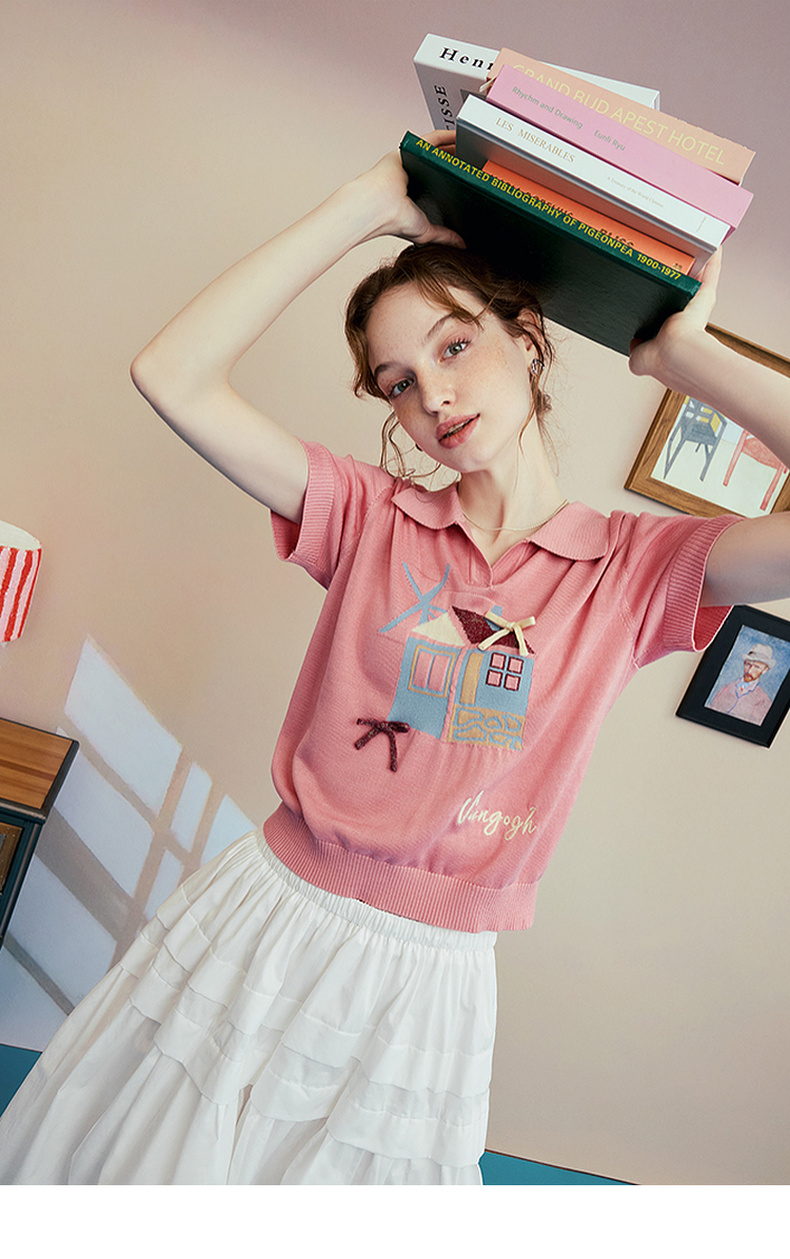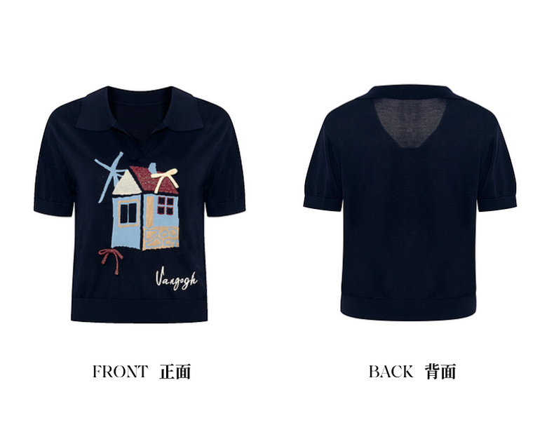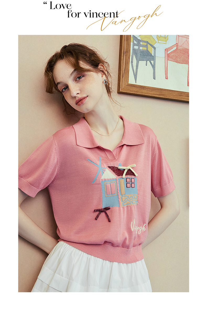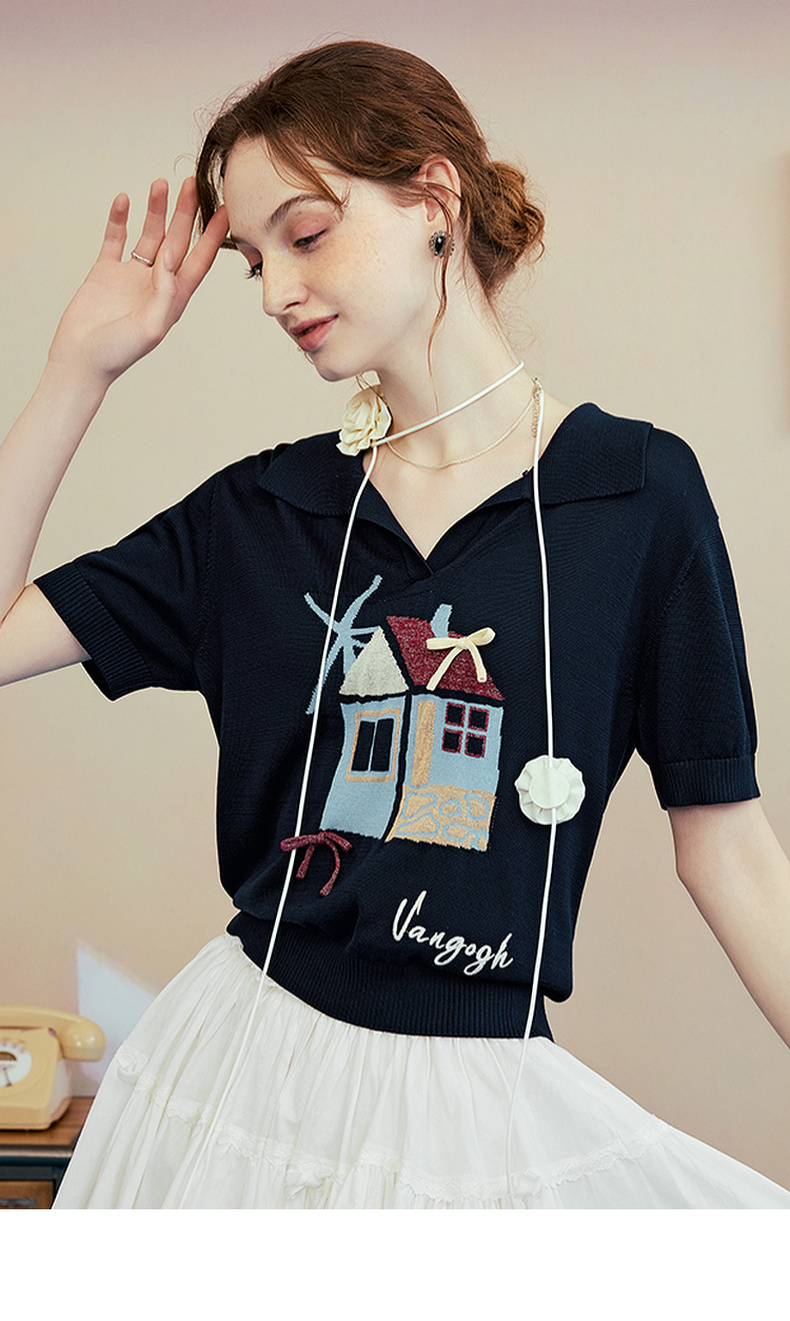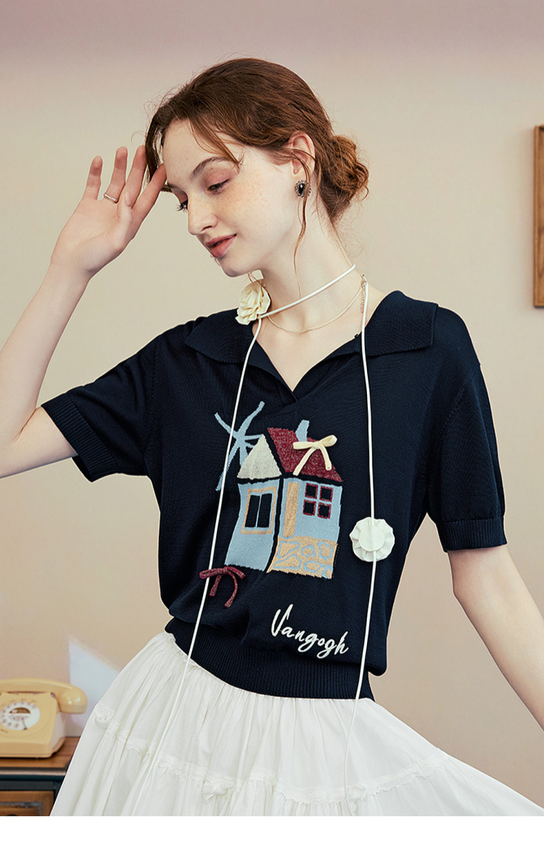 两三事梵高文艺糖屋环游2025夏季新款甜美polo领提花短款针织衫女