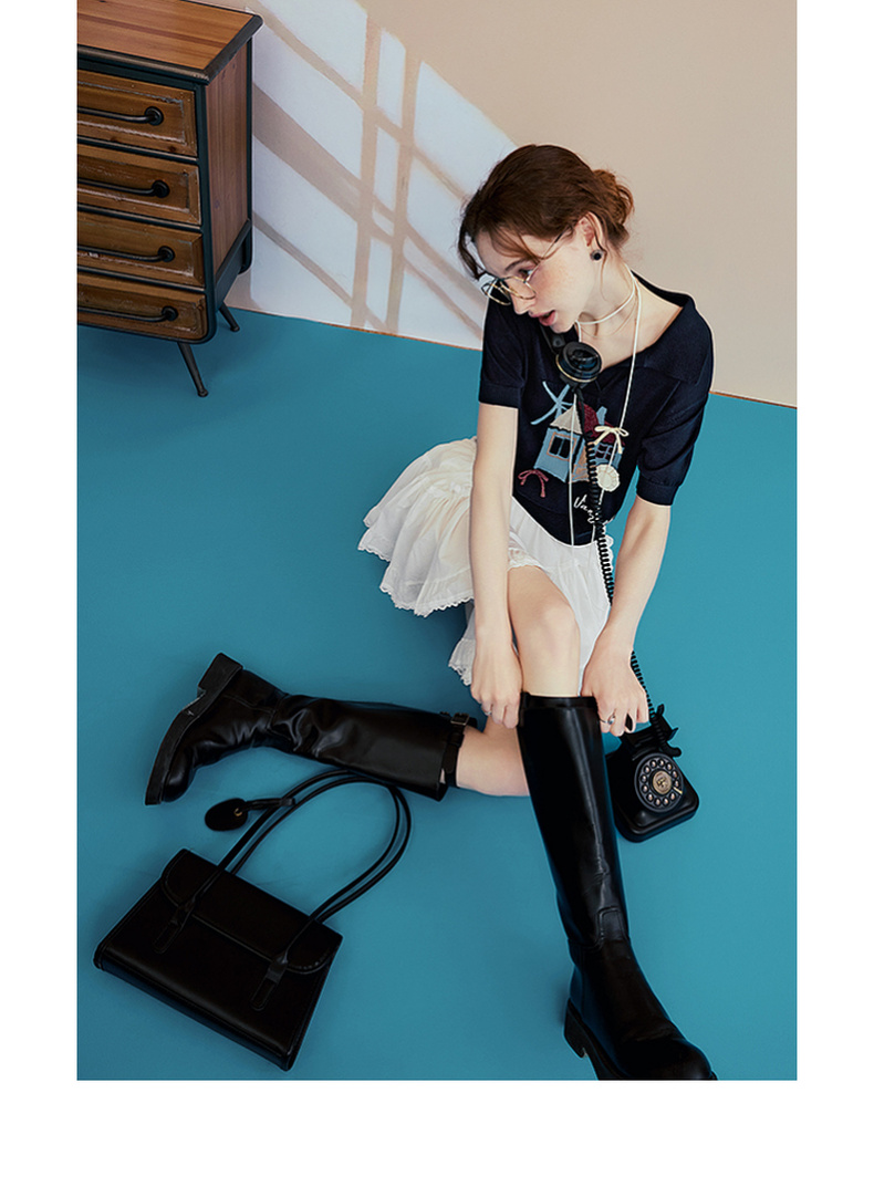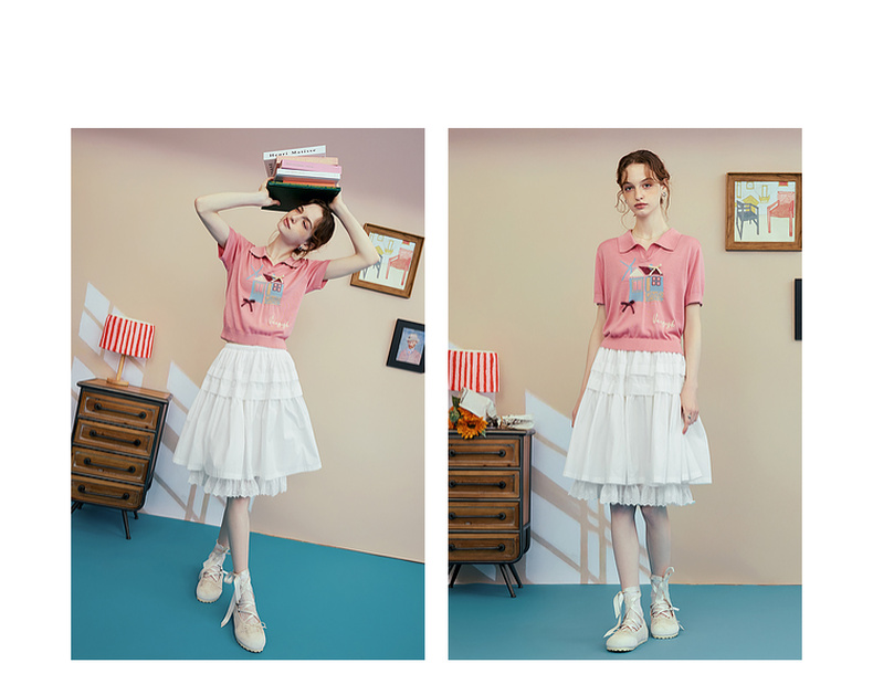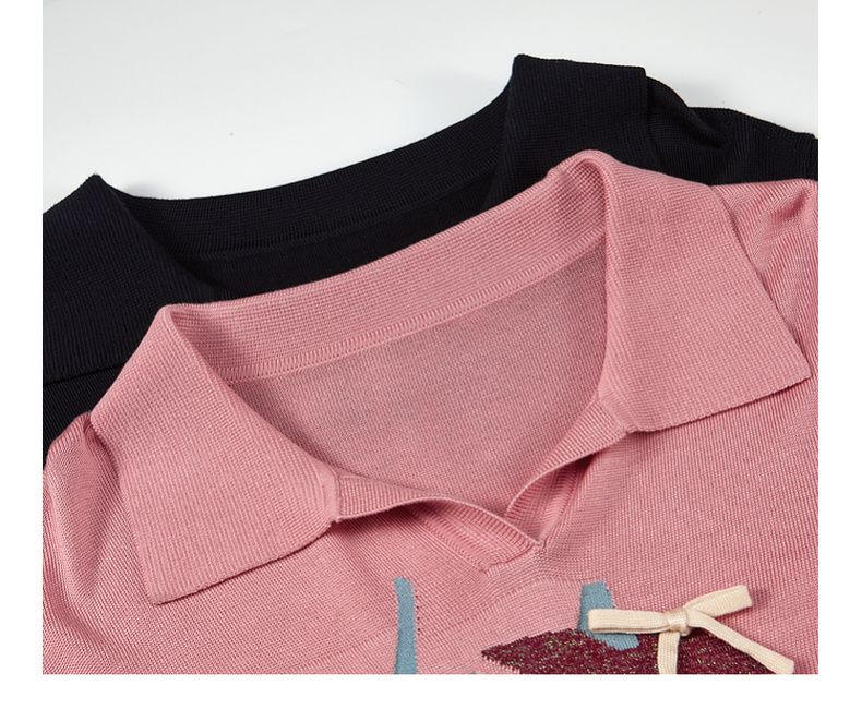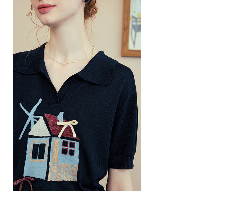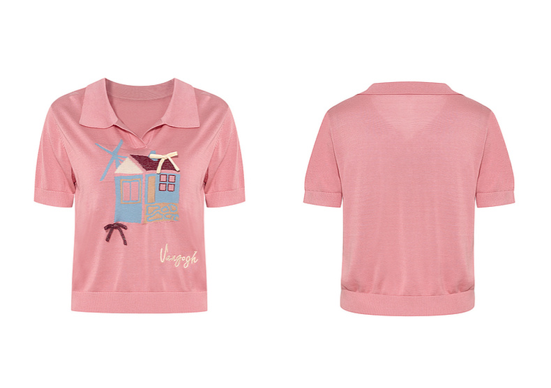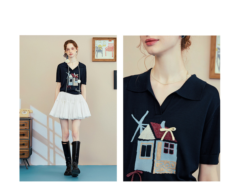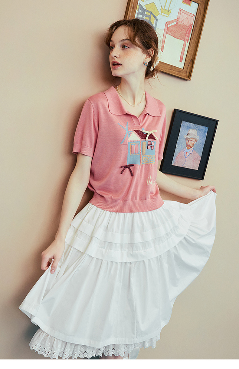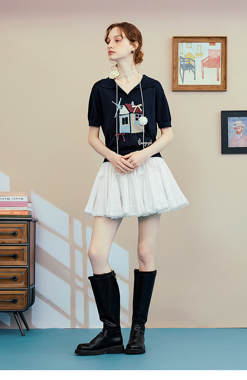 两三事梵高文艺糖屋环游2025夏季新款甜美polo领提花短款针织衫女