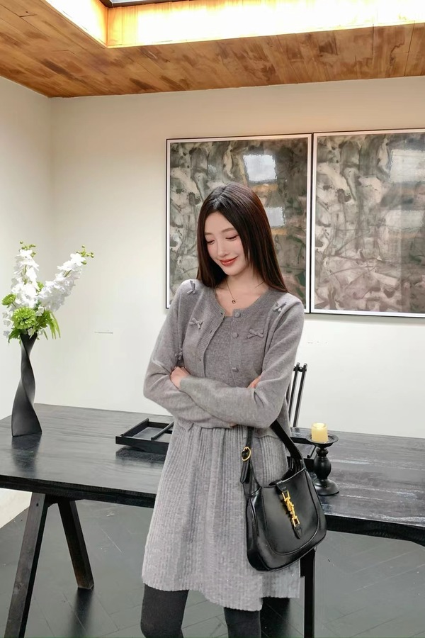 ANSUABEL 甜美蝴蝶结针织背心连衣裙开衫两件套装 21504