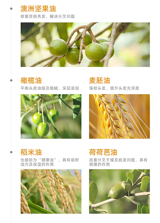 蕴含玫瑰籽油、核桃仁油、稻糠油、霍霍巴籽油、全缘叶澳洲坚果籽油、小麦胚芽油、油橄榄果油等7大天然植物油,