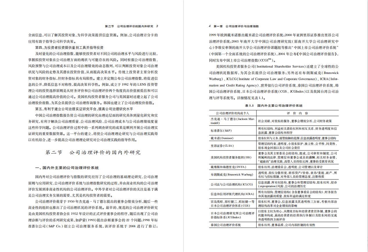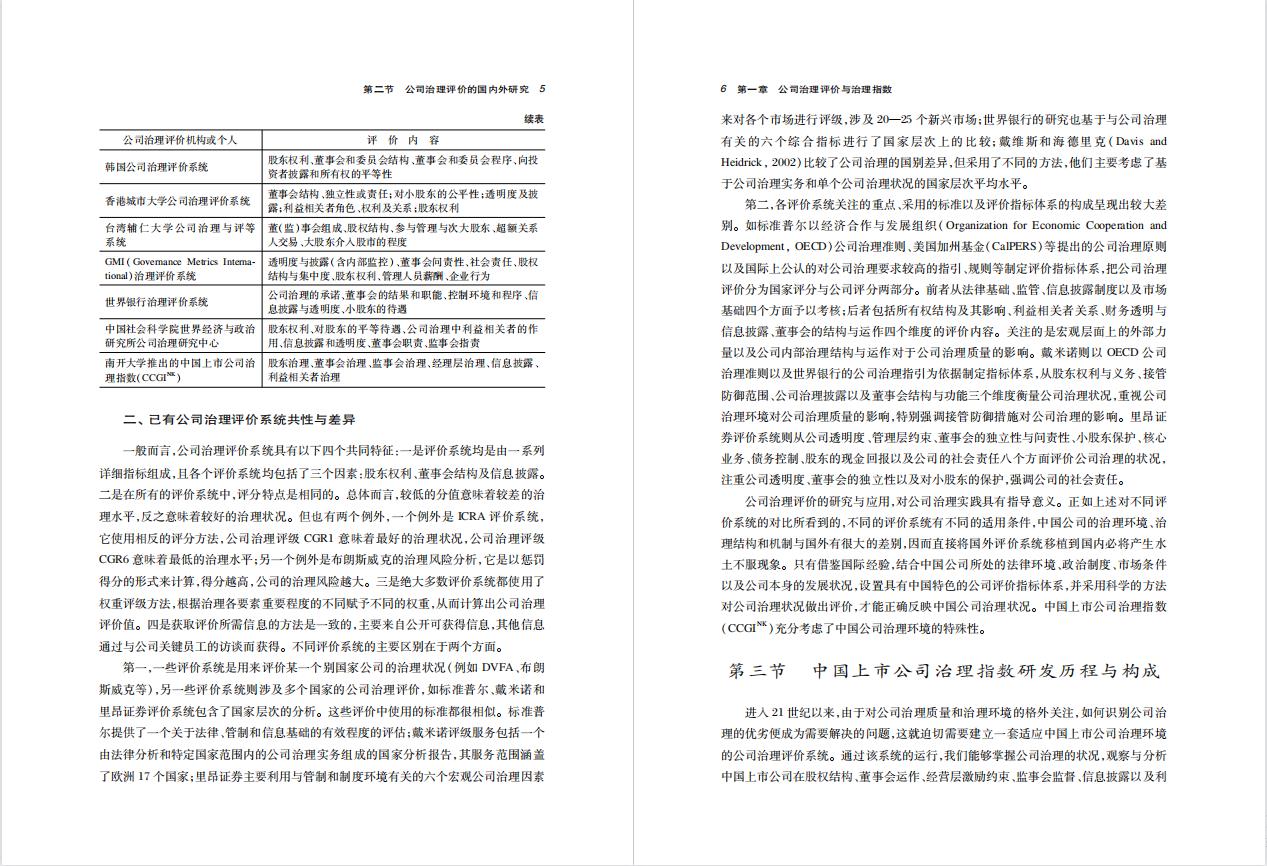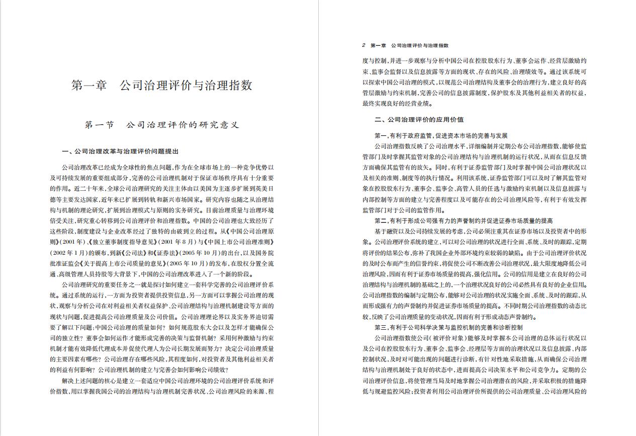 除了南开大学中国公司治理研究院的CCGINK之外,国内的许多其他学者也在公司治理指数构建和相关研究方面做出了有益的尝试。例如,白重恩、刘俏和陆洲等(2005)综合考虑了公司治理内、外部机制,运用主元因素分析法集合八个指标构建了公司治理指数(G指数)。并通过实证研究发现,治理水平高的企业其市场价值也高;投资者愿为治理良好的公司付出相当可观的溢价。郝臣(2005;2009)聚焦于公司的股东、董事会、监事会、经理层的治理特征,分别构建了公司治理指标,并分别对民营上市公司样本和上市公司总体样本进行了实证分析。结果表明,民营上市公司治理指数与公司绩效指标之间存在显著的正相关关系,并且治理指数对公司绩效指标有显著的解释力。对于总体样本来说,当期公司治理具有相对价值相关性和较低的增量价值相关性,而前期公司治理只具有相对价值相关性。ST公司的治理价值相关性原理与一般上市公司存在差异。上述结论说明我国投资者在投资决策时已经开始考虑公司治理因素。鲁桐等(2014)聚焦于中小板和创业板上市公司,综合股权结构与股东权利、董事会和监事会运作、信息披露与合规性以及激励机制四个方面对上市公司治理水平进行系统评估,他们发现公司治理与公司业绩存在正相关关系,其中激励约束机制特别是高管与核心技术人员的股权激励是影响上市公司绩效的重要因素(鲁桐和吴国鼎,2015)。韩少真、潘颖和张晓明(2015)构建了包括董事会治理、管理层治理、股东治理、会议治理四个维度的公司治理指标体系,并发现公司治理对公司绩效具有正向影响,这一影响在民营企业中更加显著。韩少真和潘颖(2016)的研究进一步表明,较高的治理水平不仅能显著提高公司的债务可得性和长期债务比例,还能显著降低公司的债务成本。傅传锐(2016)构建了包括股权治理、董事会治理和高管激励在内的公司治理综合指数,证明了公司治理机制对公司智力资本价值创造的积极作用。方红星和金玉娜(2013)则从监督和激励两个角度选取公司治理成分指标,发现公司治理对公司非效率投资具有明显的抑制作用,特别是对意愿性非效率投资的抑制效果更为显著。韩少真、潘颖和张晓明(2015)构建了包括董事会治理、管理层治理、股东治理和会议治理在内的公司治理指标体系,通过研究发现,对民营企业和处在高市场化环境中的企业来说,公司治理对公司绩效的积极作用更为显著。同时,股东治理和管理层治理表现出更加重要的影响力。