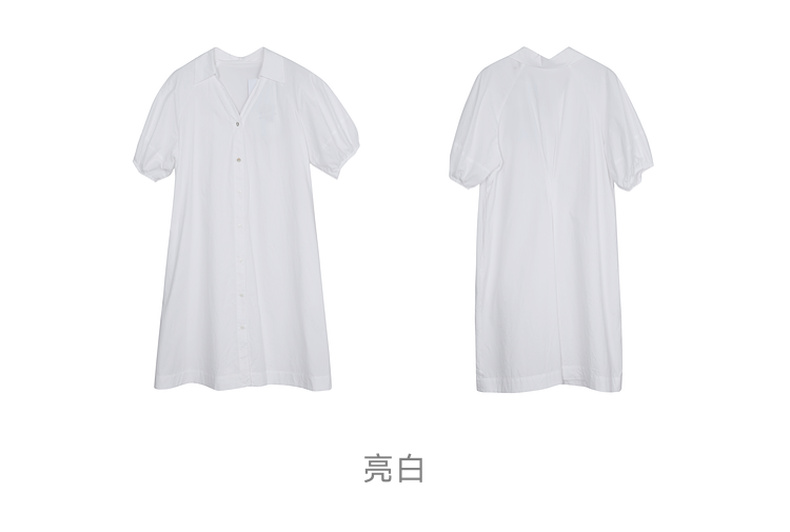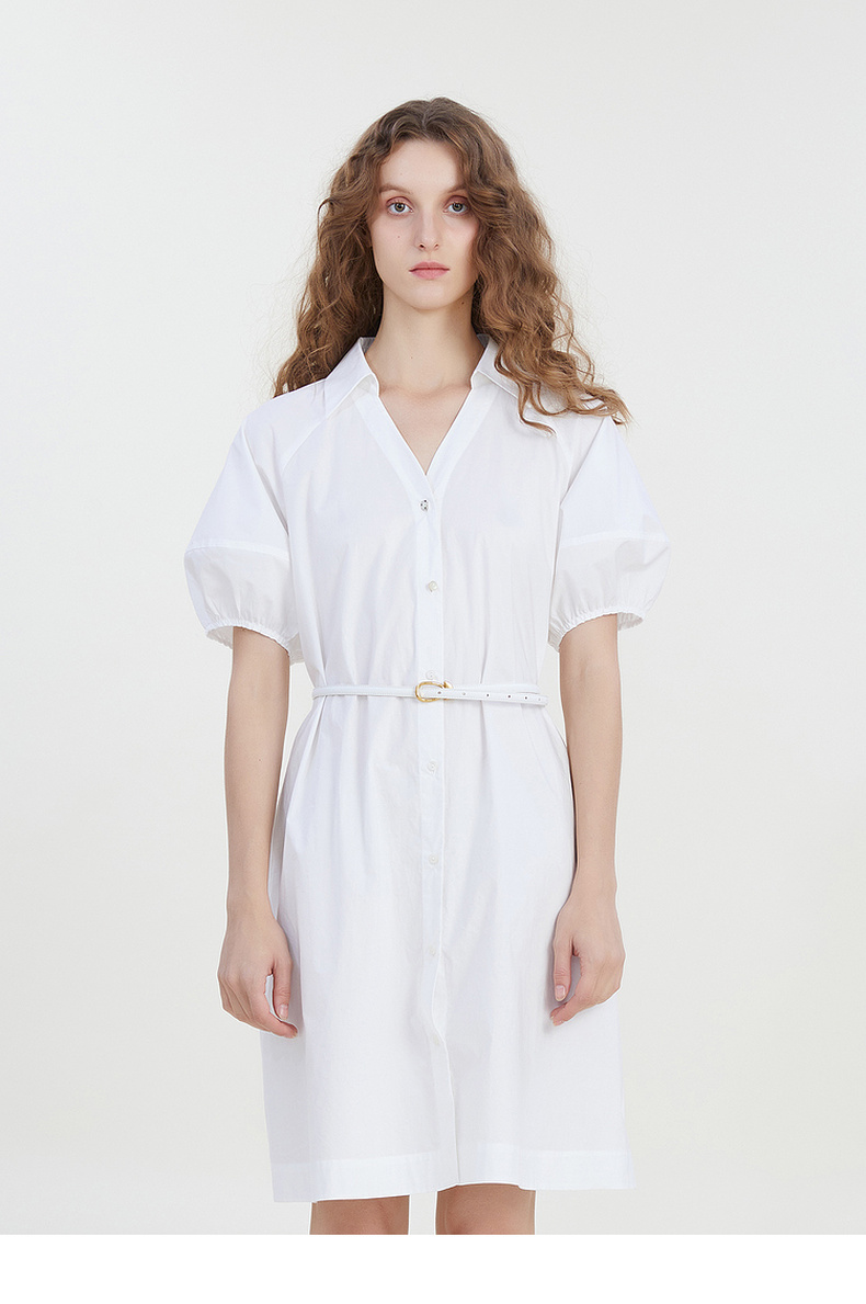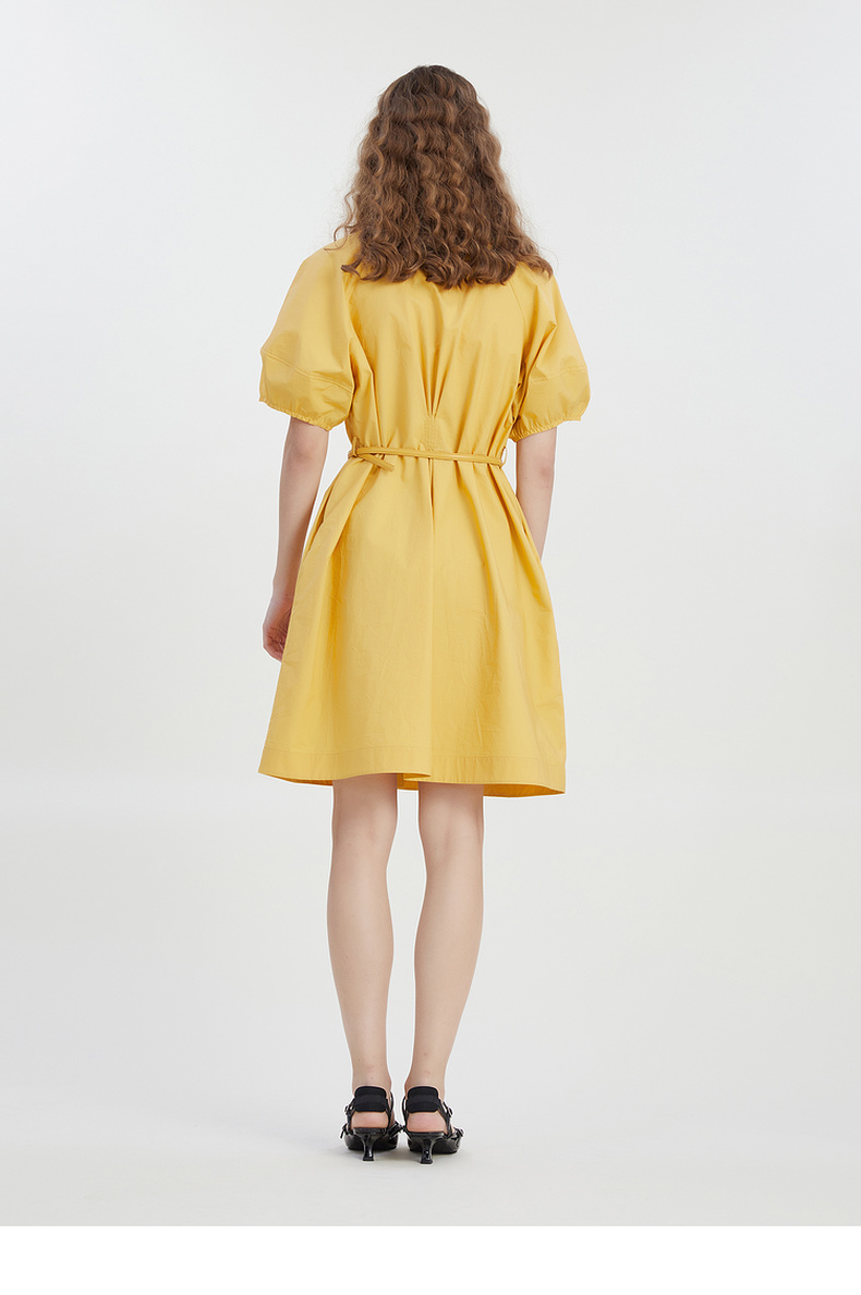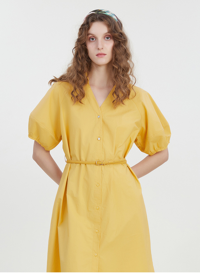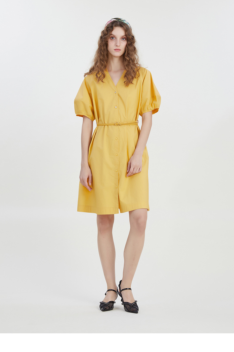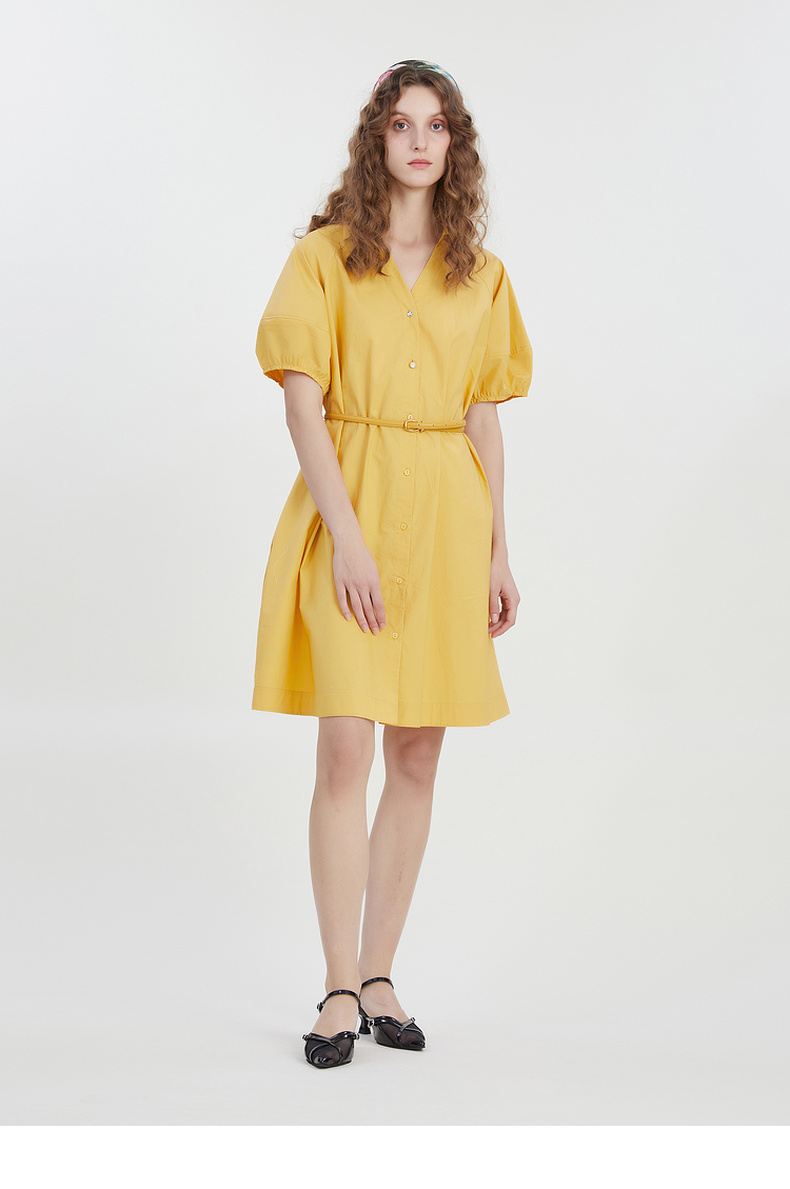 谜底2023夏新款V领纯色连衣裙宽松中长款裙子短袖配腰带232ML0581