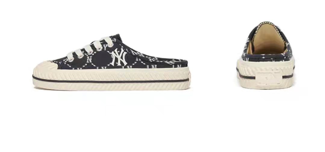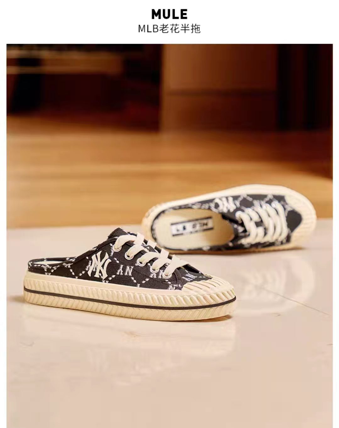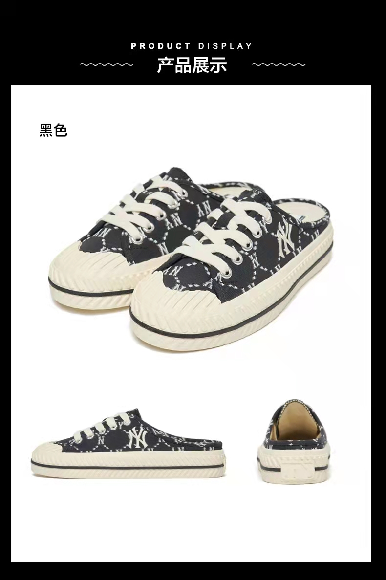 MLB官方男女情侣半拖复古老花帆布鞋黑色增高休闲潮夏季