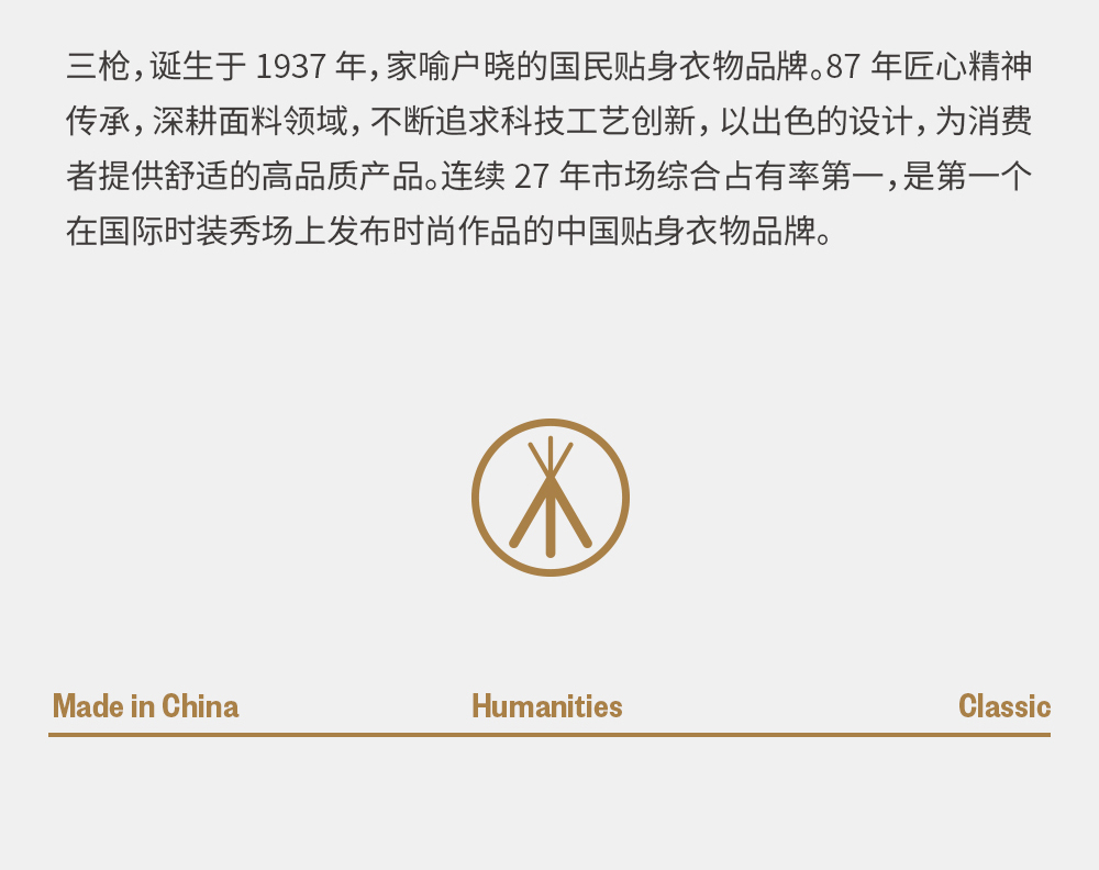 - 创建于1937年,中国代表性民族品牌 “引领内衣发展趋势,倡导身心合一的温馨生活” 是品牌的发展理念 始终致力于面料的舒适性和功能性开发 融合科技与时尚 用心呵护您的每一次贴身体验