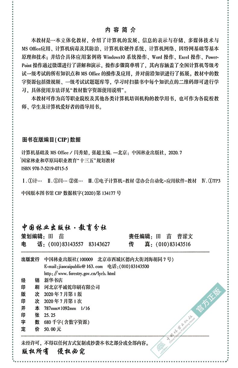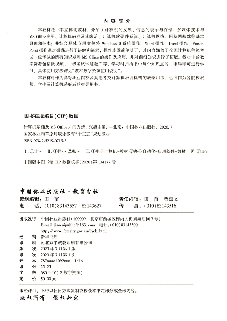 计算机基础及MS Office (国家林业和草原局职业教育十三五规划教材) 闫秀婧//张超 0715 中国林业出版社