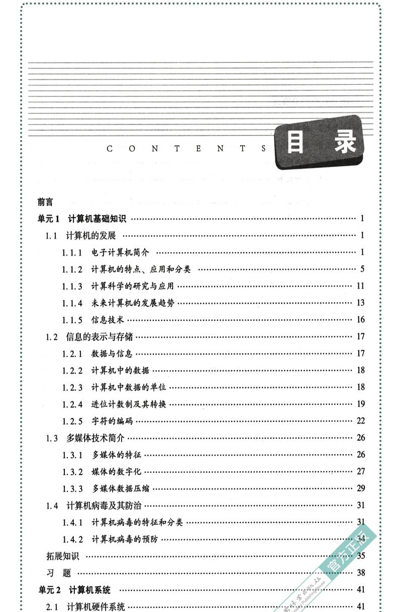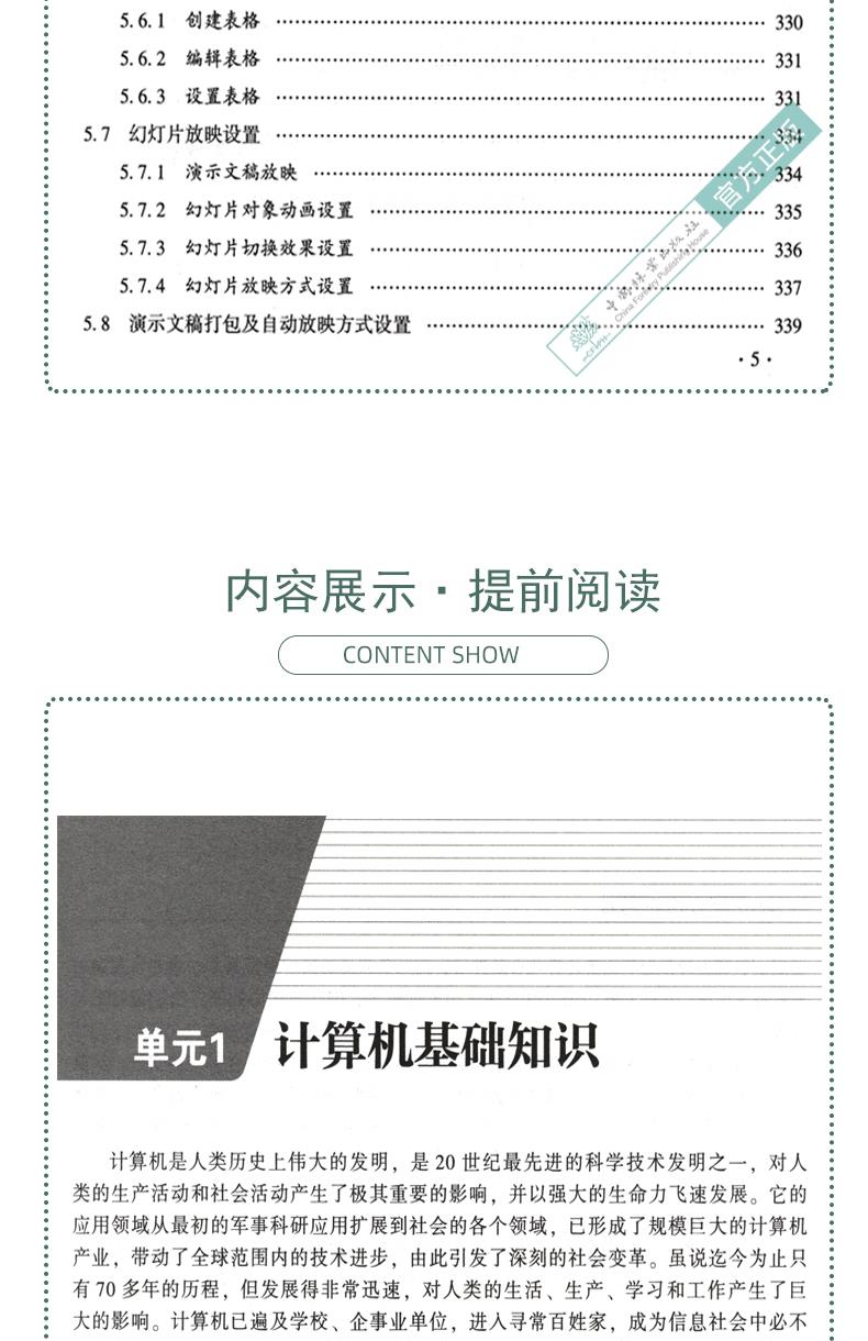本教材是一本立体化教材,介绍了计算机的发展、信息的表示与存储、多媒体技术与MS Office应用、计算机病毒及其防治、计算机软硬件系统、计算机网络、因特网基础等基本原理和技术;并结合具体应用案例将Windows 10系统操作、Word操作、Excel操作、PowerPoint操作通过微课进行了讲解和演示,操作步骤简单明了,其内容涵盖了全国计算机等级考试一级考试的所有知识点和MS Office的操作及应用,并对前沿知识进行了拓展。教材中的数字资源包括微视频、一级考试试题题库等,学习时扫描书中每个知识点的二维码即可进行学习,具体使用方法详见“教材数字资源使用说明”。