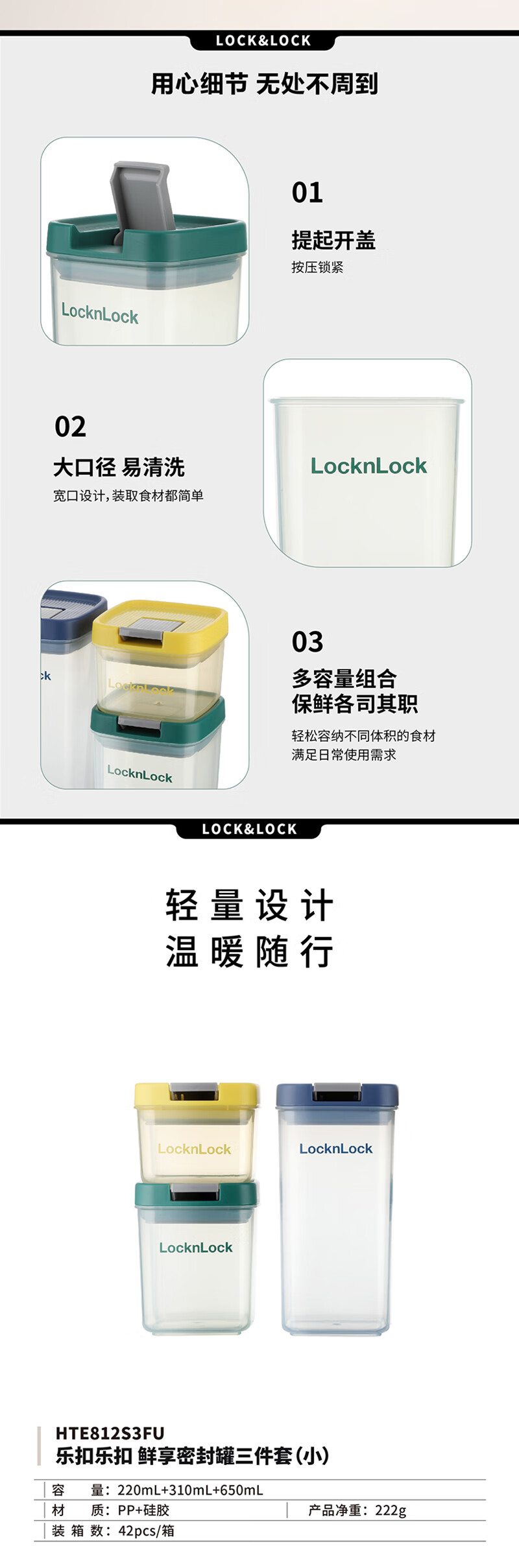 乐扣乐扣 鲜享密封罐三件套(小)HTE812S3FU 220mL+310mL+650mL