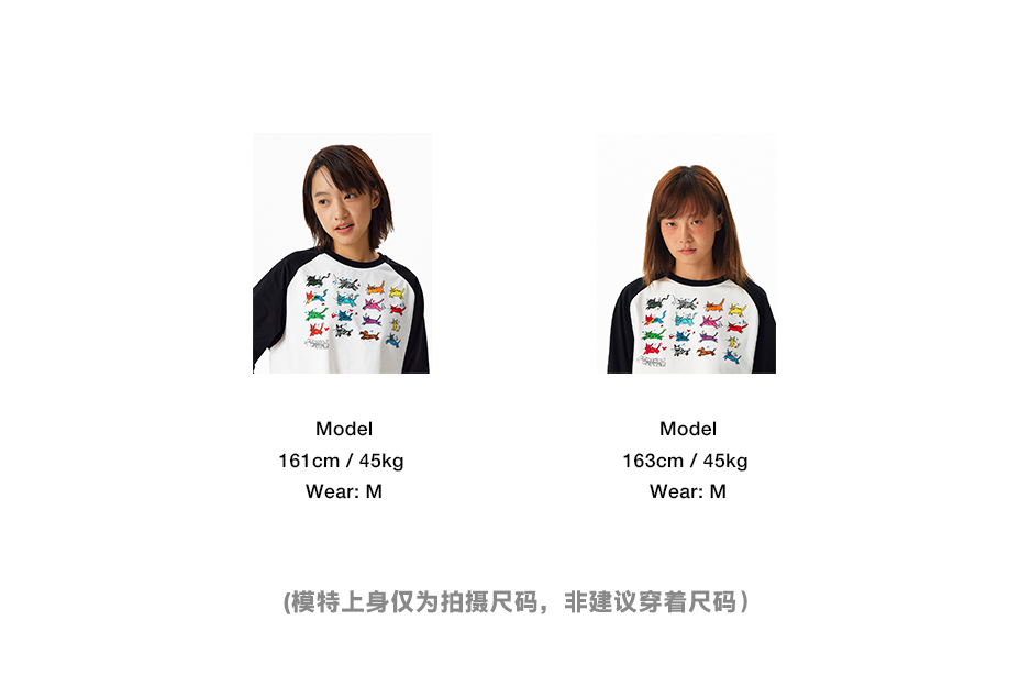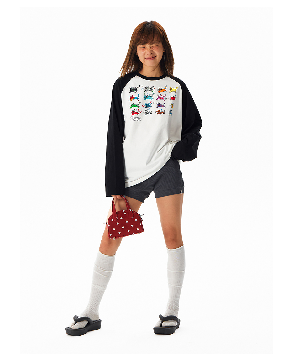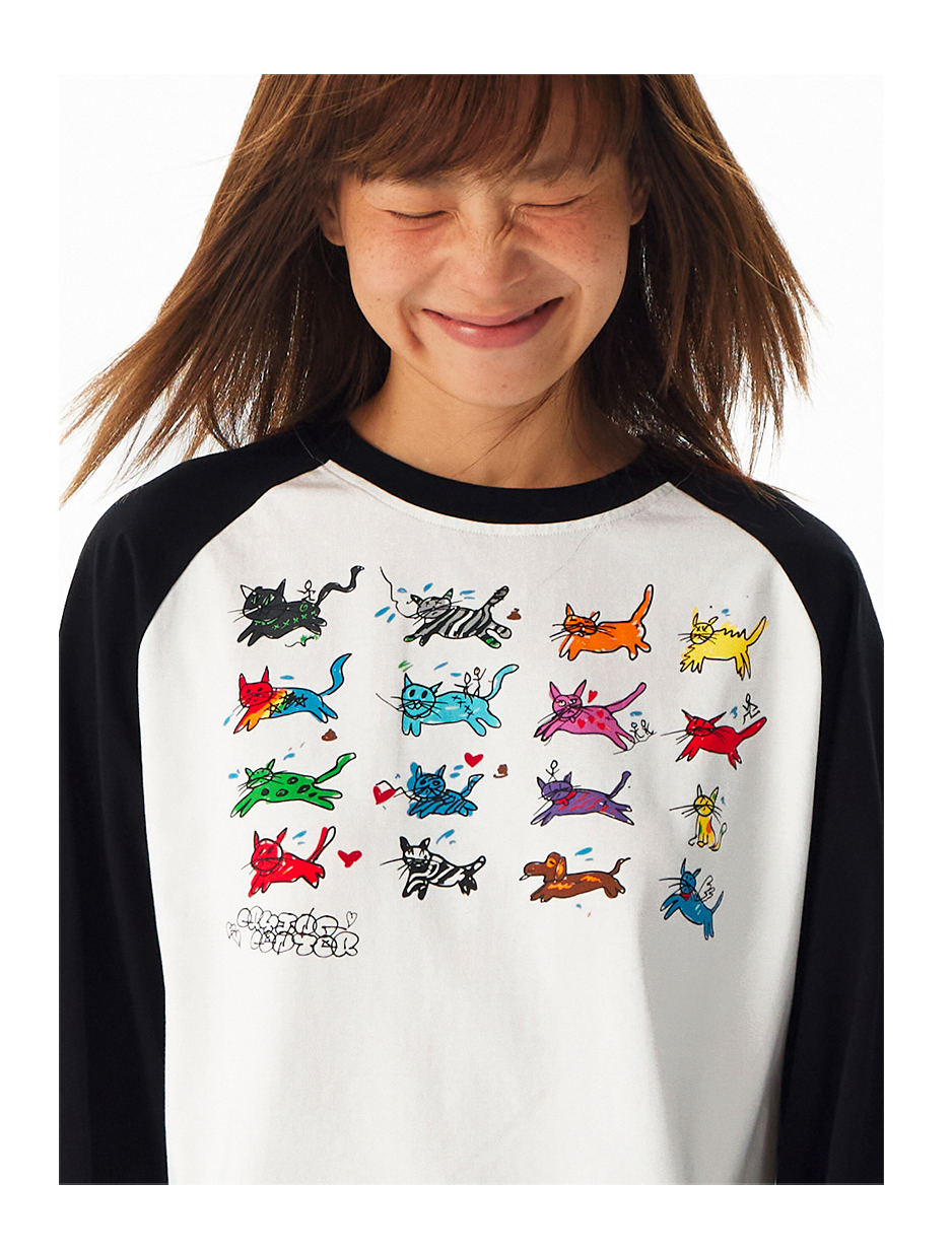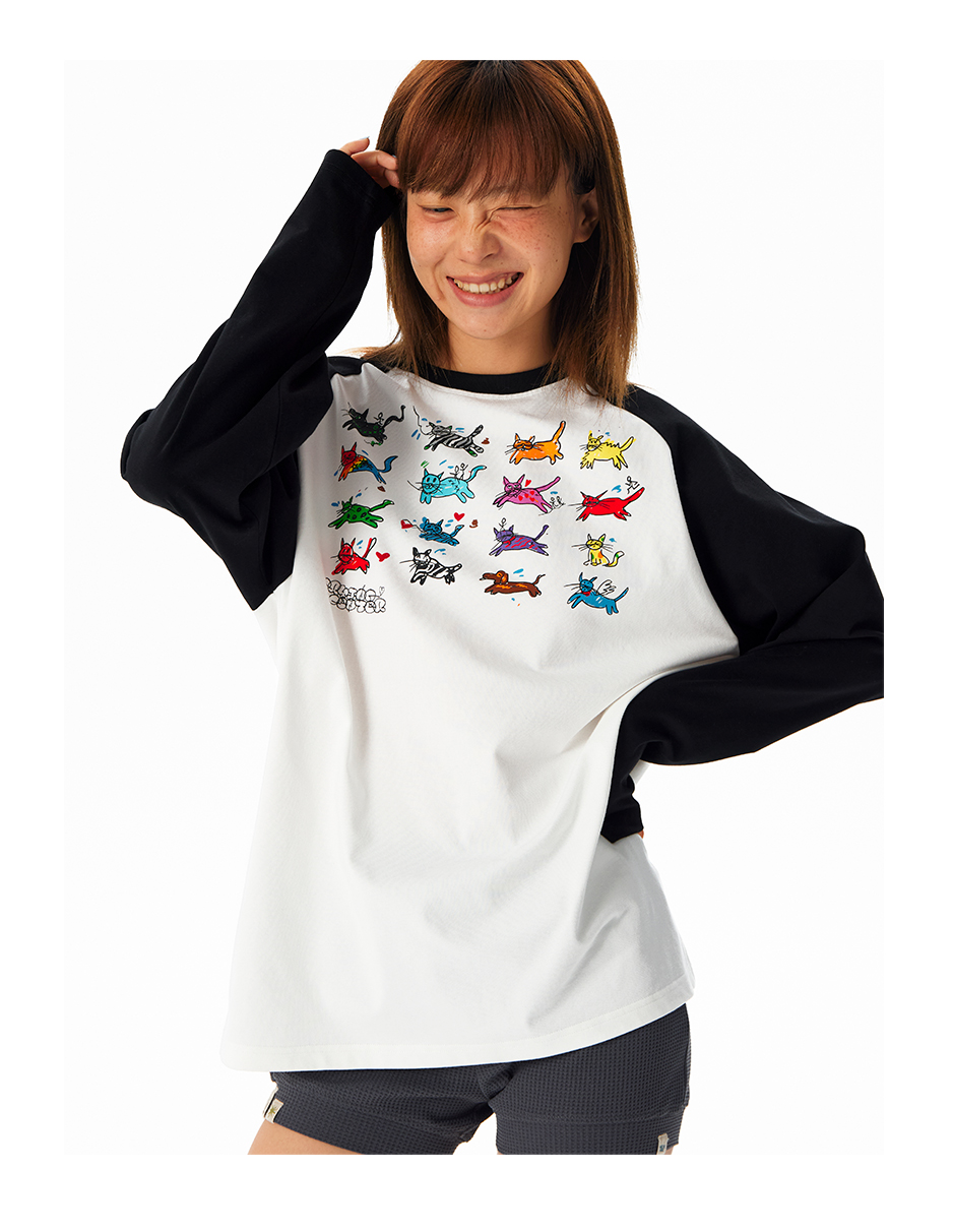 CryingCenter 可爱小猫手绘插画松弛居家感黑白插肩长袖 正肩T恤