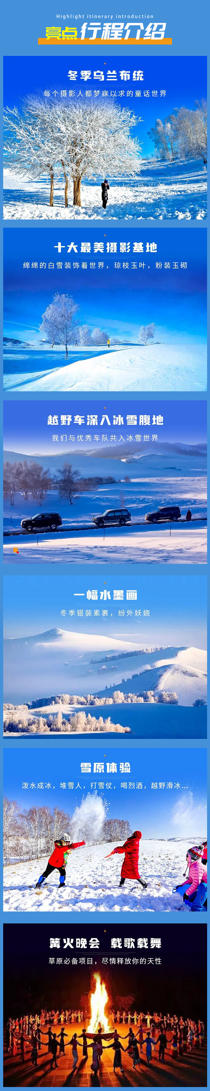 - 上午|初到乌兰布统景区,绝美的雪域美景尽收眼底,让你终生难忘,哪里景色美我们就停留在哪里,雪地撒欢吧,别忘了留下你在雪野上的第一张照片,边走边拍行摄于无尽的内雪域高原。