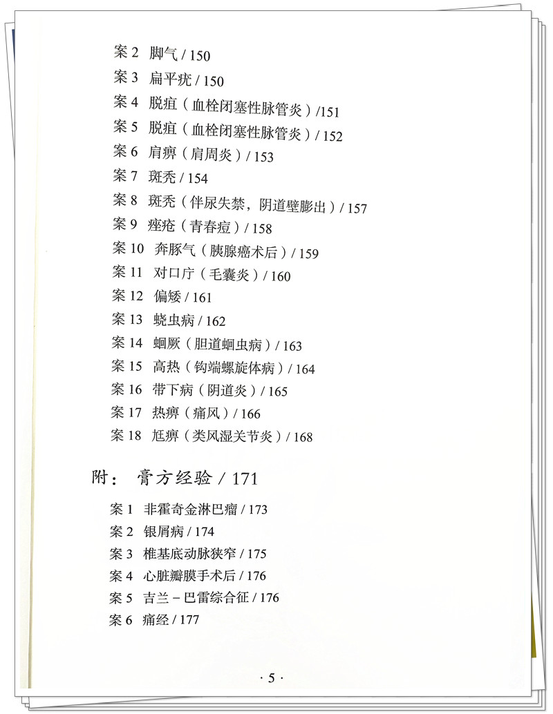 本书论述数十年来中医内科临床医案,按照肝胆、心系、脾胃、肺系、肾系、气血津液、经络肢体病证为纲,加上膏方6例共110例,以中医病名论证,结合现代医学病名为目录,便于读者查找,做到纲举目张。其中臌胀(肝硬化腹水)、肝癌、昏迷(中毒性脑病)、肺痿(尘肺)、心悸(风湿性心脏病、肺梗塞)、红斑痹(红斑狼疮性肾炎)、不育(少精症)、脑癌(松果体肿瘤)、脱疽(血栓闭塞性脉管炎)、高热(钩端螺旋体病)、膏方中的非霍奇淋巴瘤、牛皮藓颇具特色。