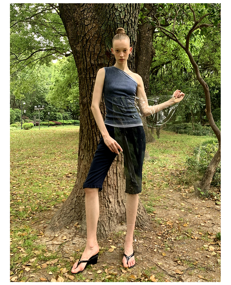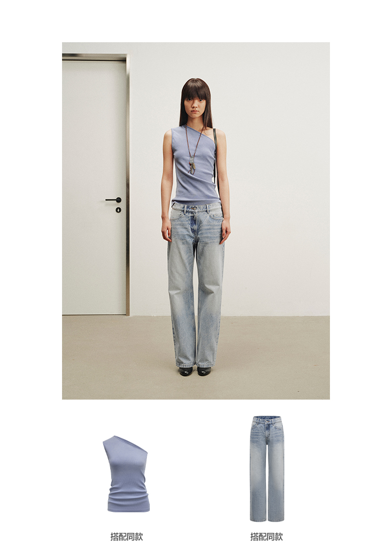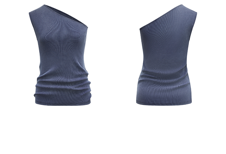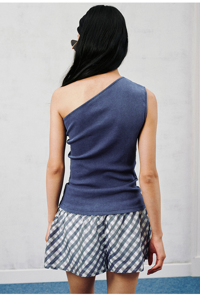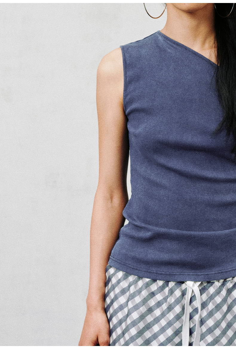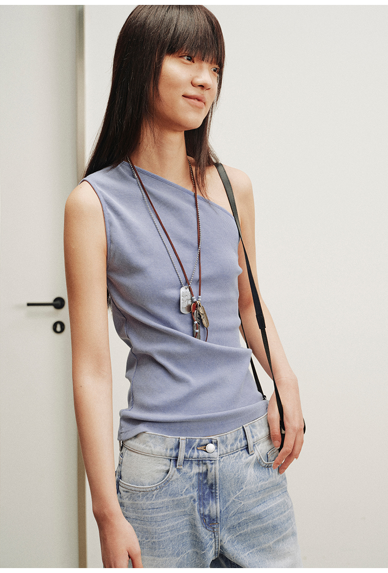 NUTH斜领露肩背心洗褪做旧弹力修身单肩背心女 雾霾蓝色/藏蓝色