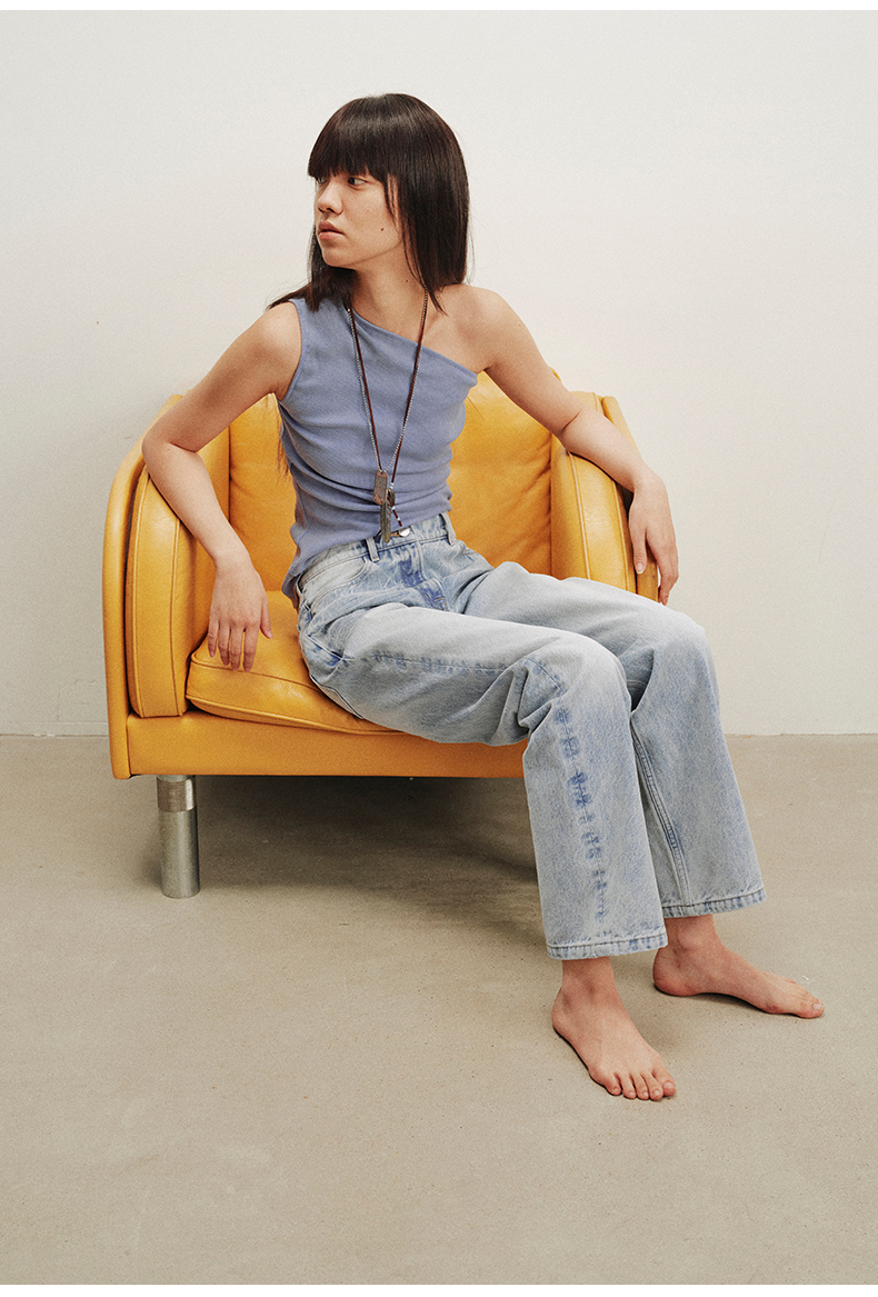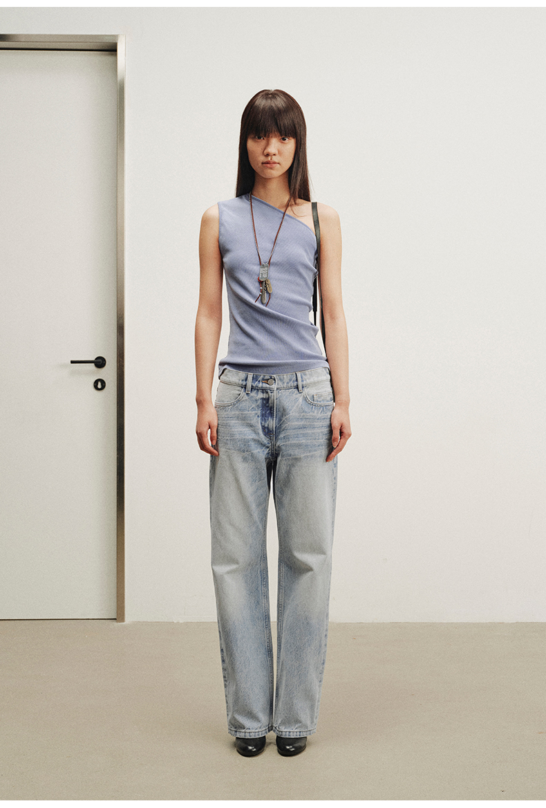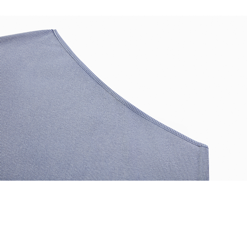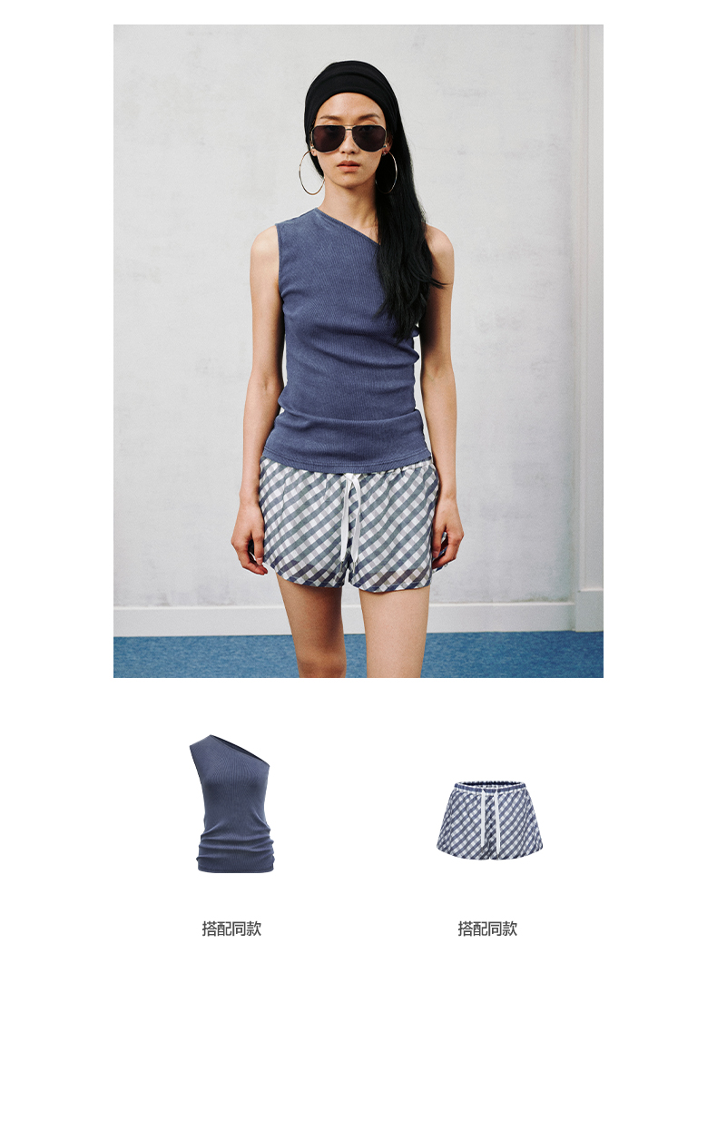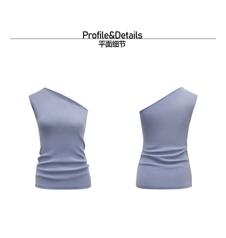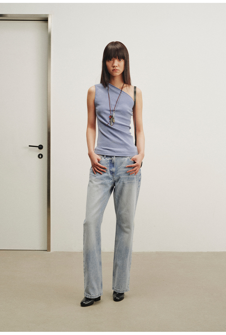 NUTH斜领露肩背心洗褪做旧弹力修身单肩背心女 雾霾蓝色/藏蓝色