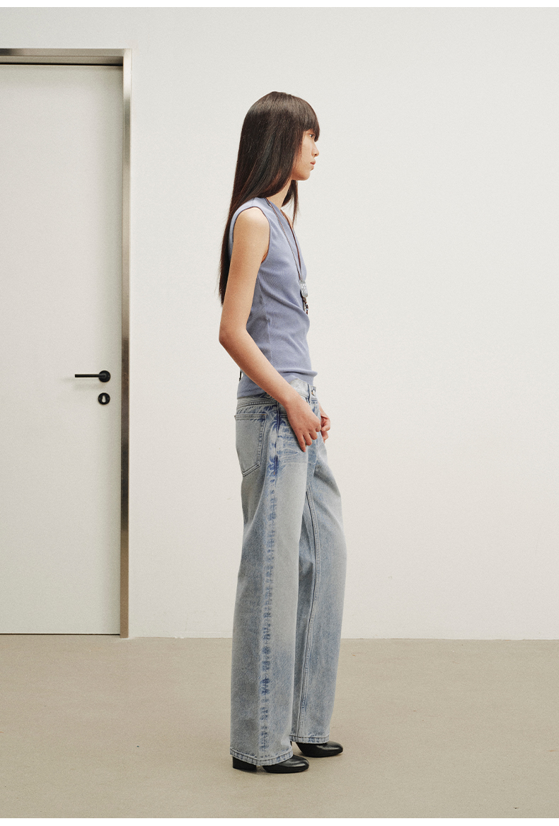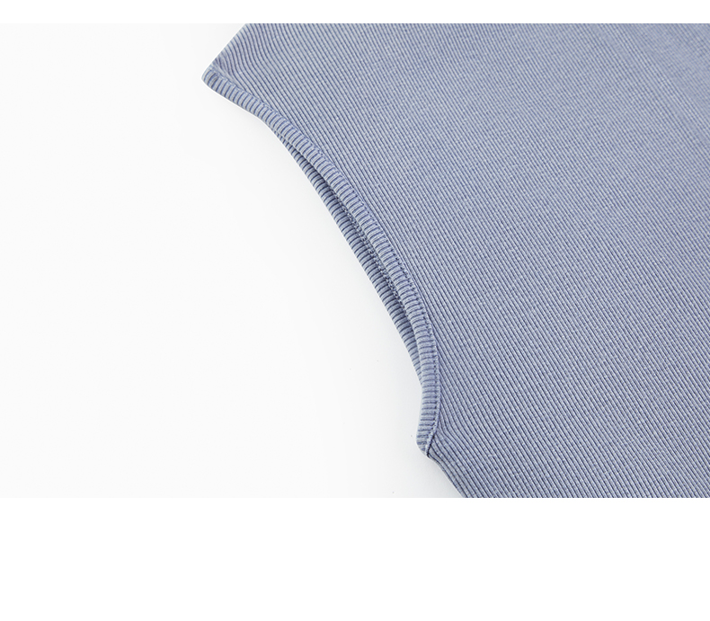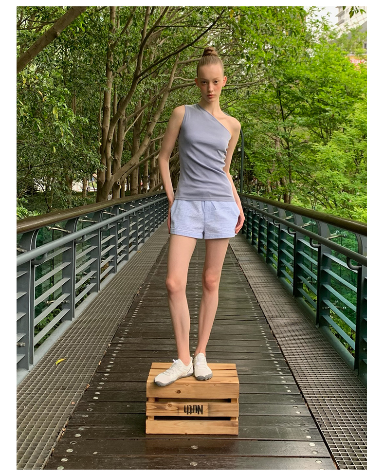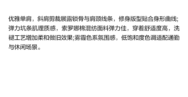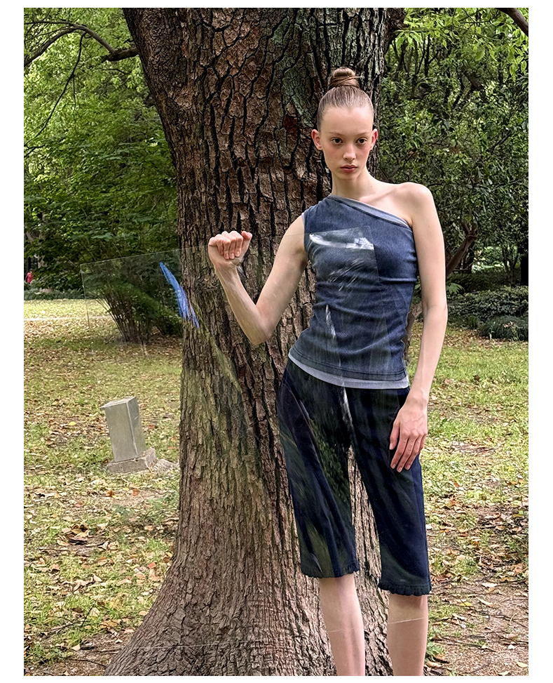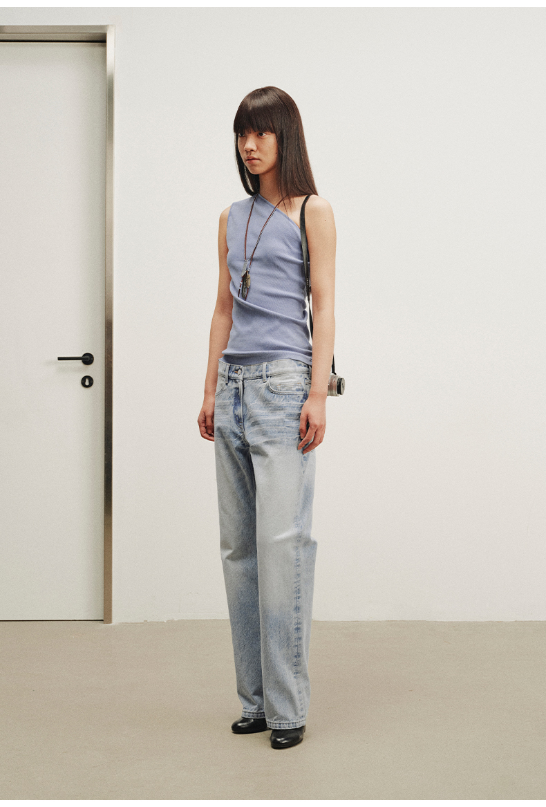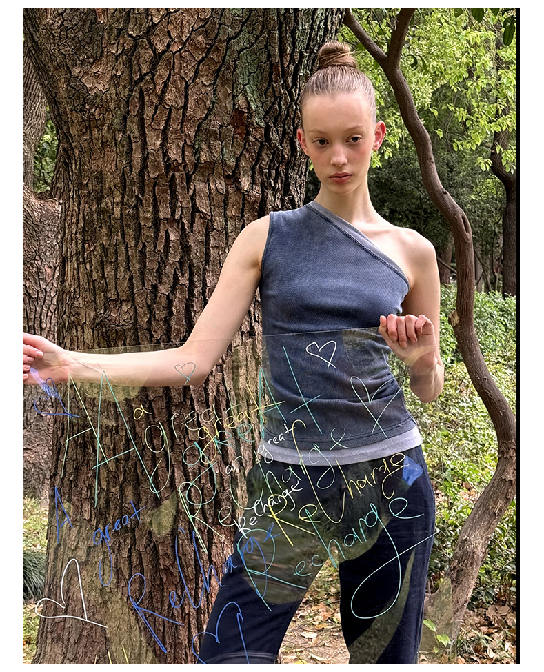 NUTH斜领露肩背心洗褪做旧弹力修身单肩背心女 雾霾蓝色/藏蓝色